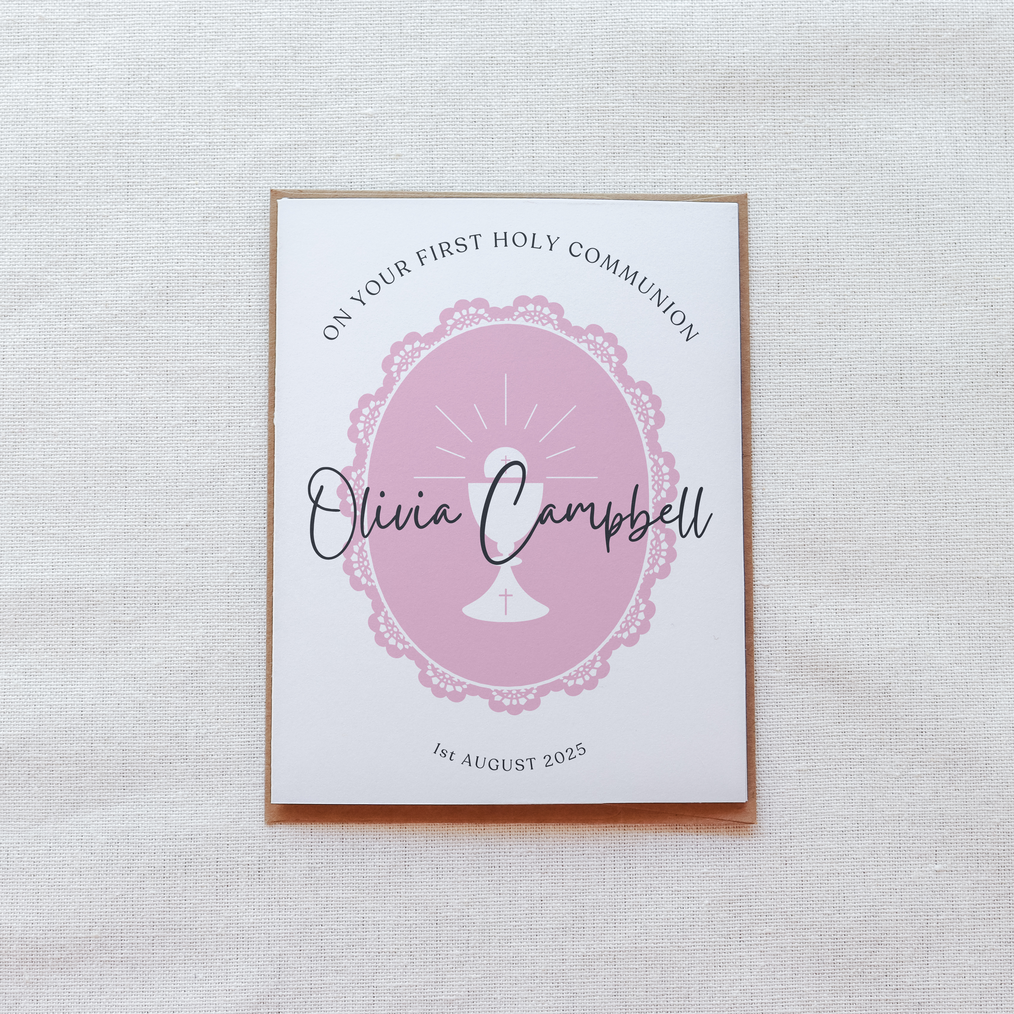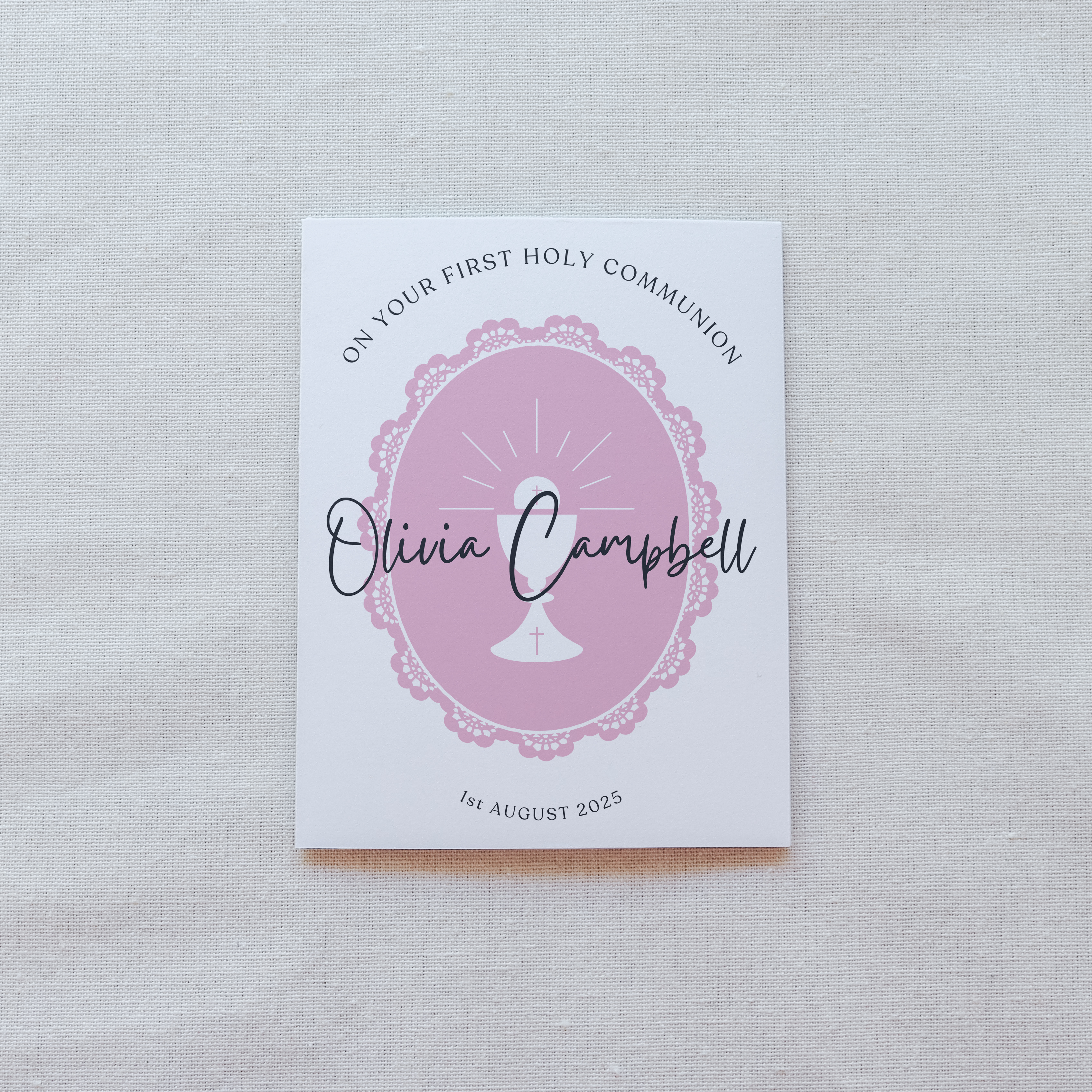 This personalized First Holy Communion card helps you mark a sacred moment in her spiritual journey. Thoughtfully designed and custom printed, it’s a meaningful way to celebrate her union with Christ in the Eucharist.