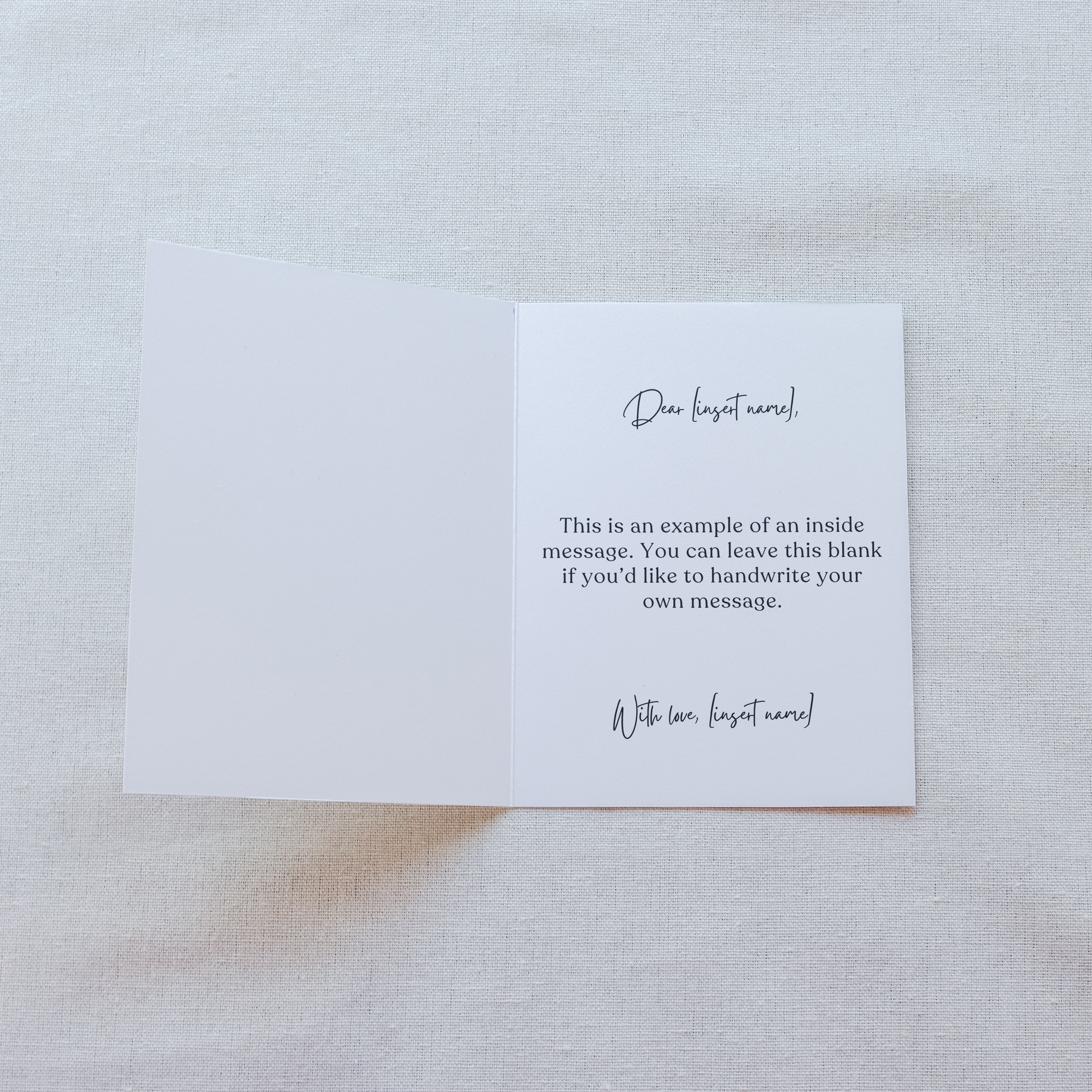 Our greeting cards are printed on heavy, high-quality 110 lb/300 gsm white cardstock. Individual greeting cards will come packed in a cellophane bag to protect during shipping. Please note that colors may vary by monitor or device and what you receive may look slightly different in person.