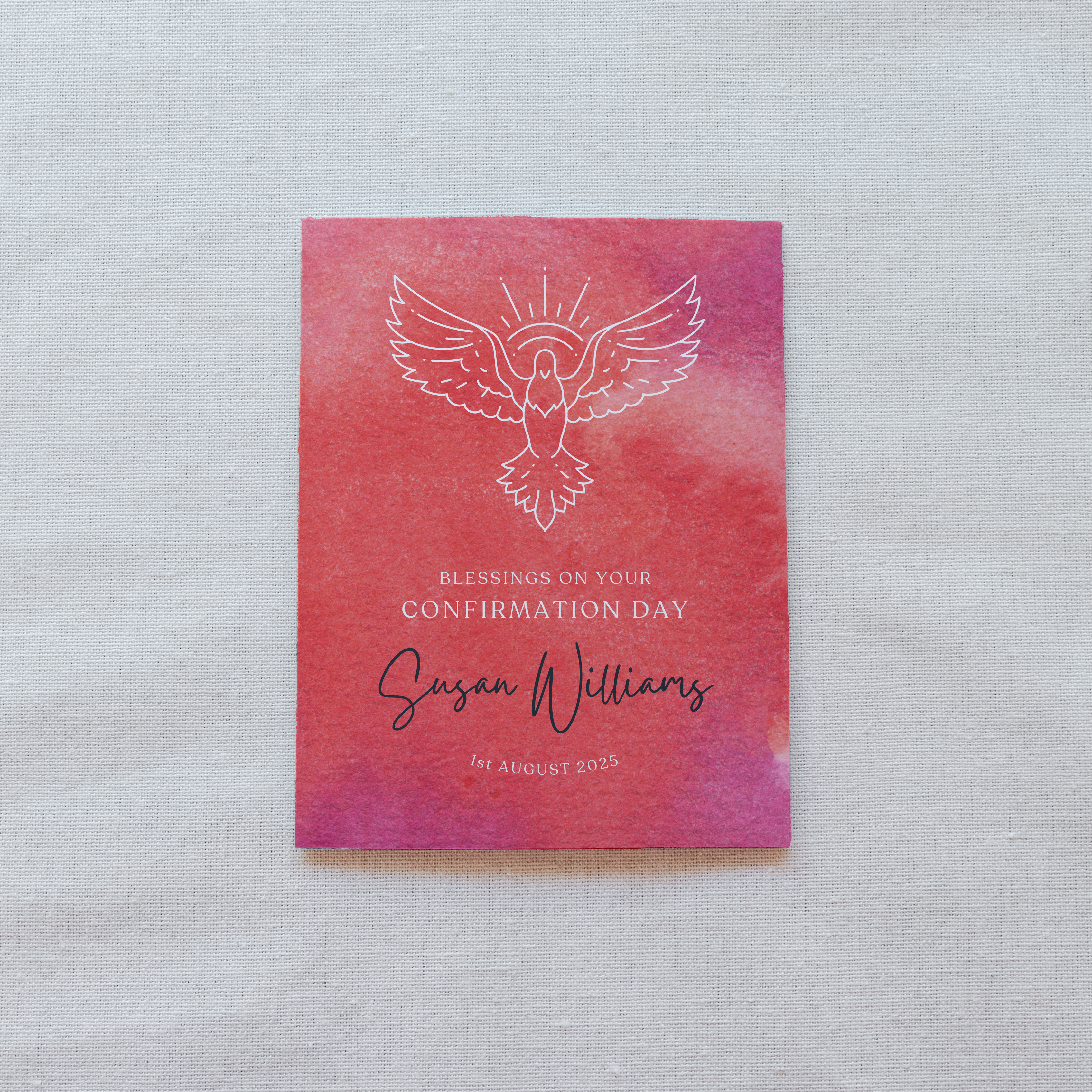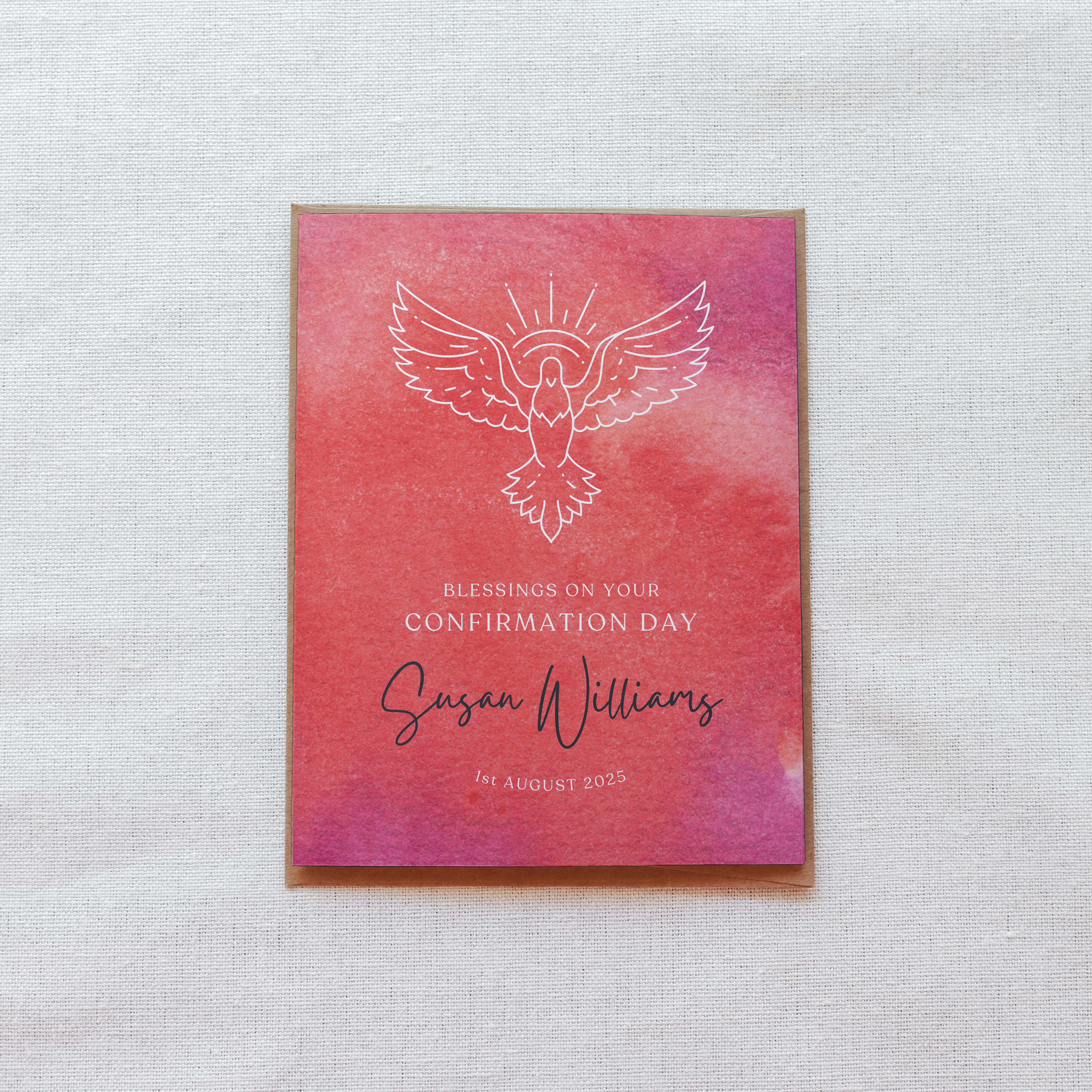 Celebrate a sacred milestone with this personalized Catholic Confirmation card, featuring bright red and pink watercolor and a Holy Spirit dove. Blank inside or option to add your own printed message.