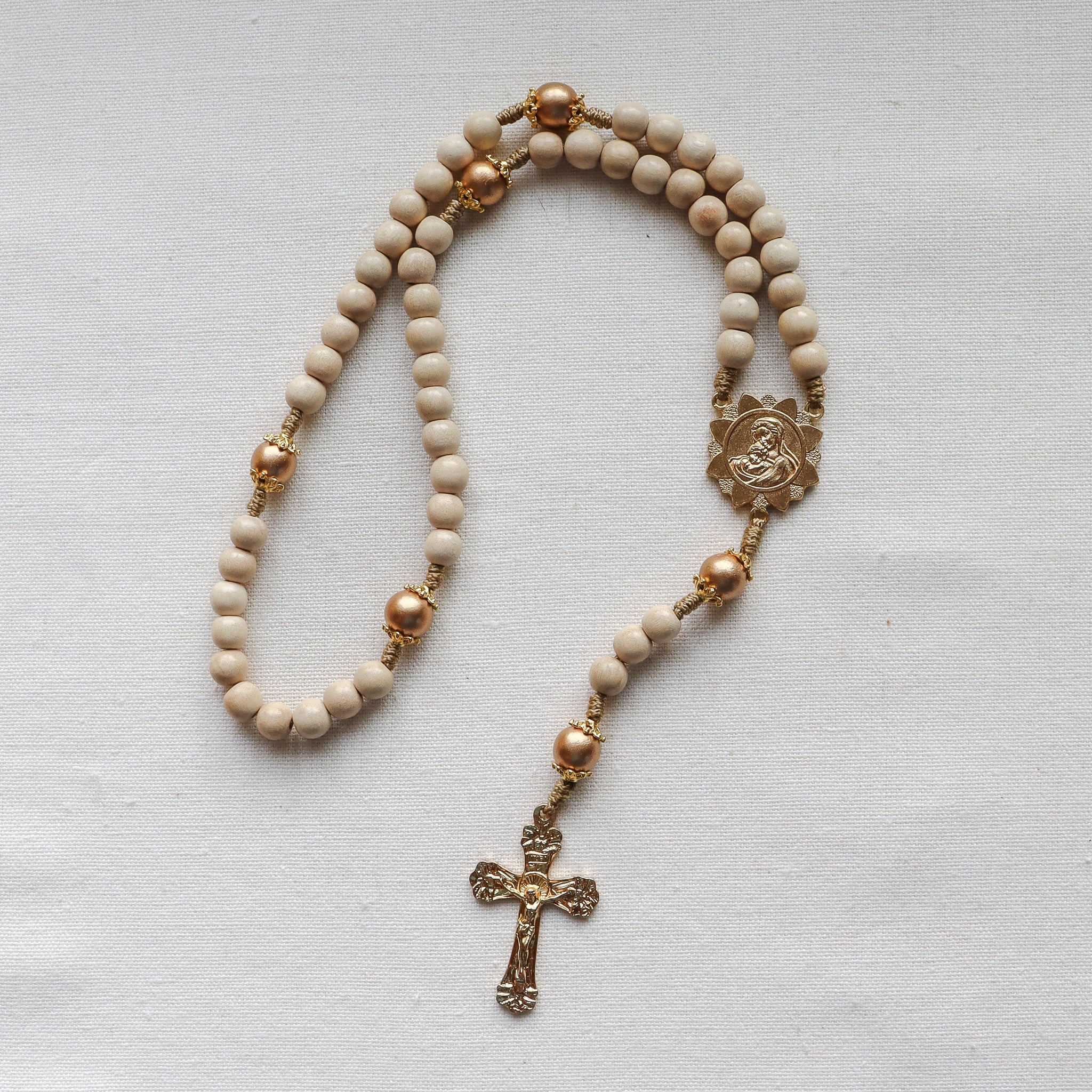 A warm, feminine rosary handmade to support daily prayer, featuring cream wood beads and gold-tone accents. Finished with a Madonna and Child centerpiece and crucifix made in Italy, it’s beautiful enough to gift and strong enough to last for years of prayer.