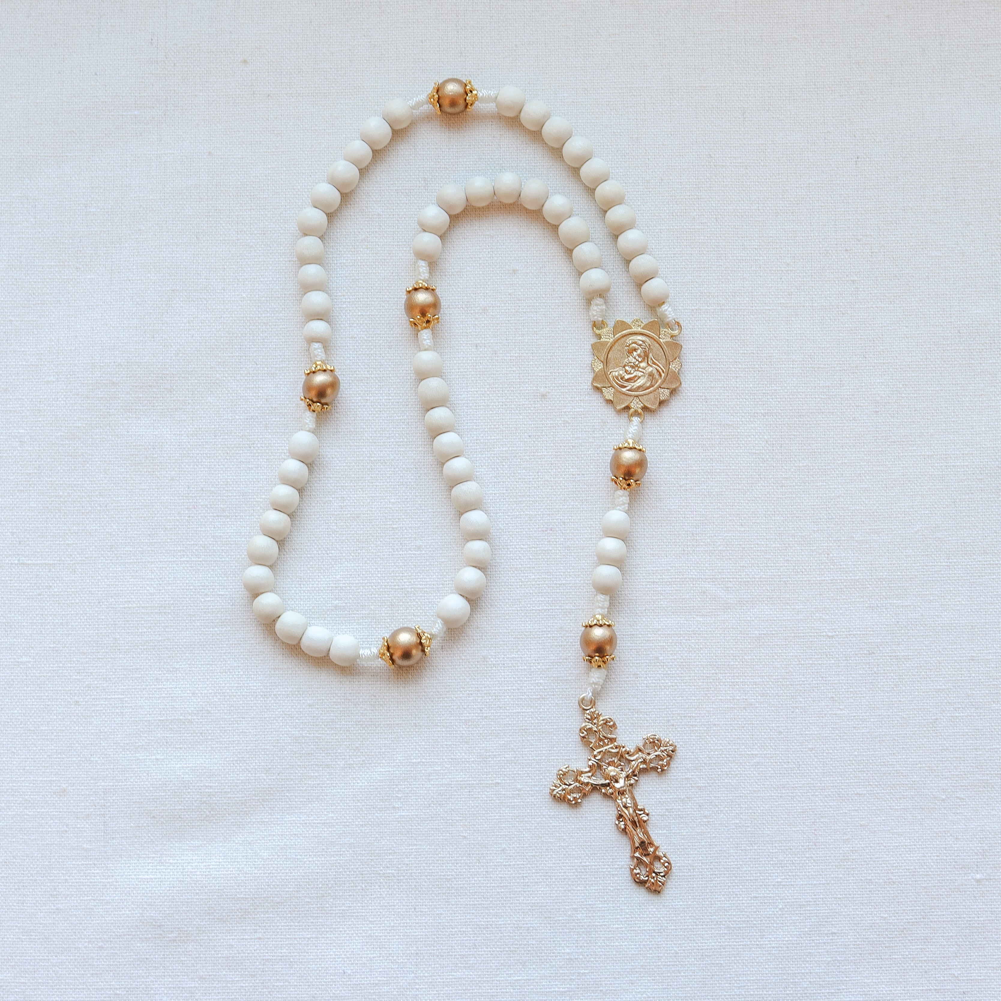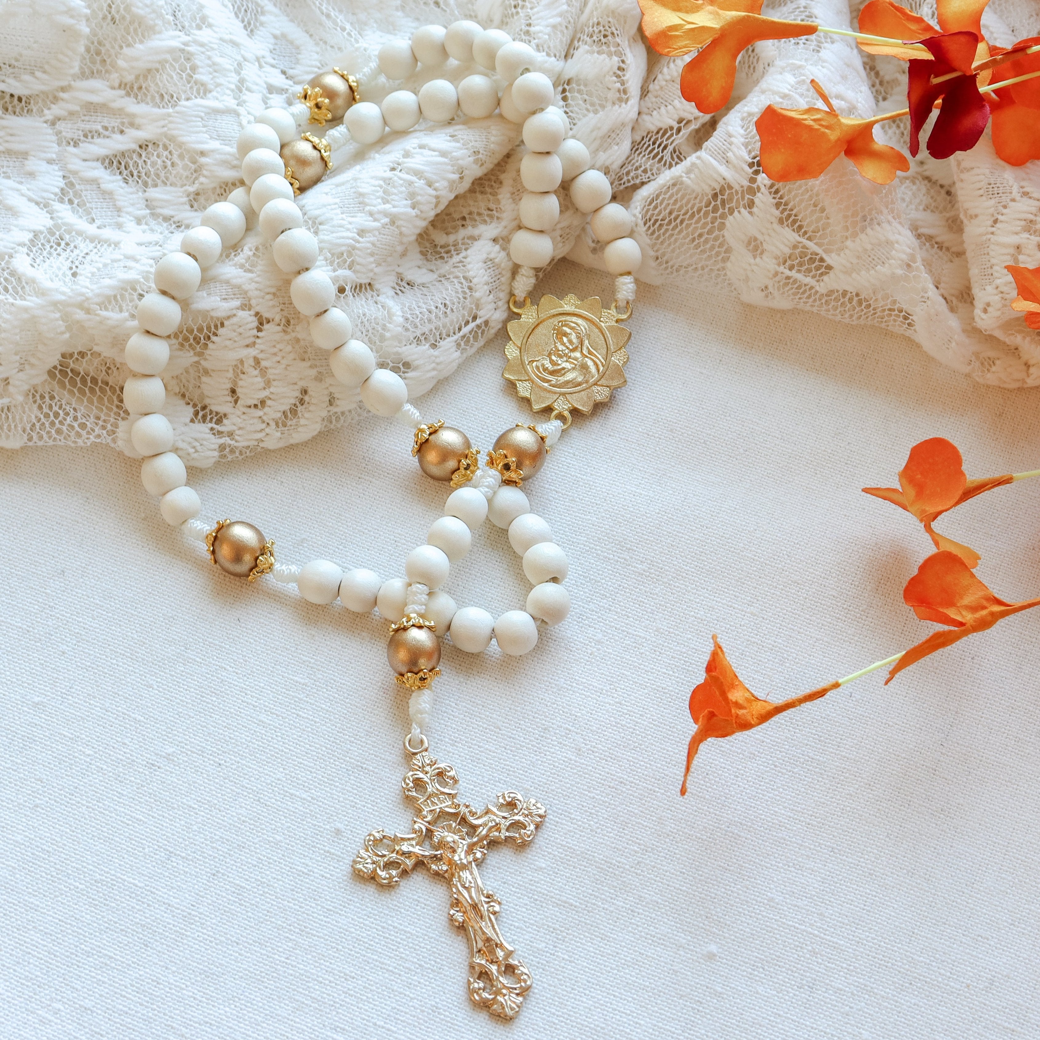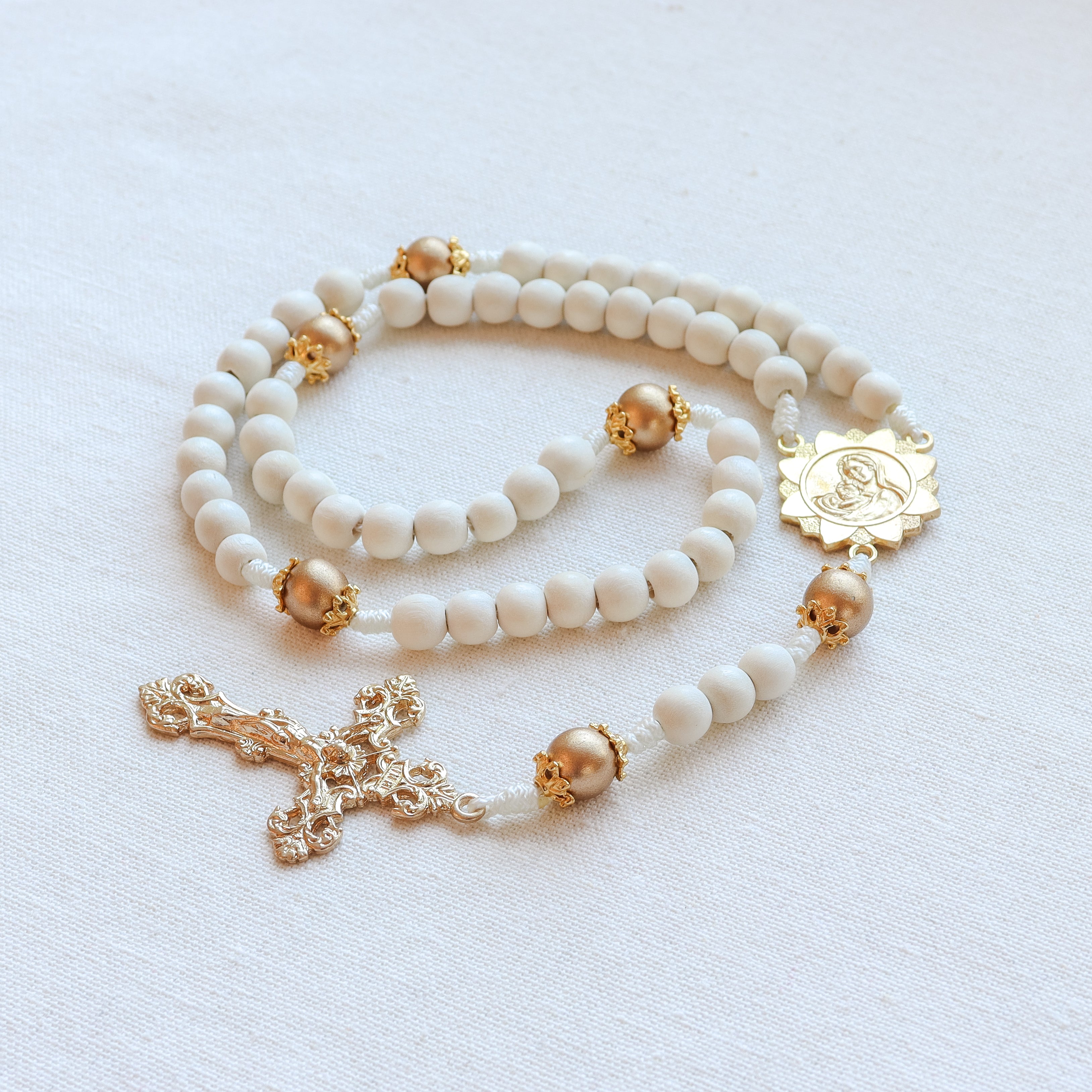 A bright, feminine rosary handmade to support daily prayer, featuring creamy white wood beads and gold painted wood beads. Finished with a Madonna and Child sunflower centerpiece and crucifix made in Italy, it’s beautiful enough to gift and strong enough for daily devotion.