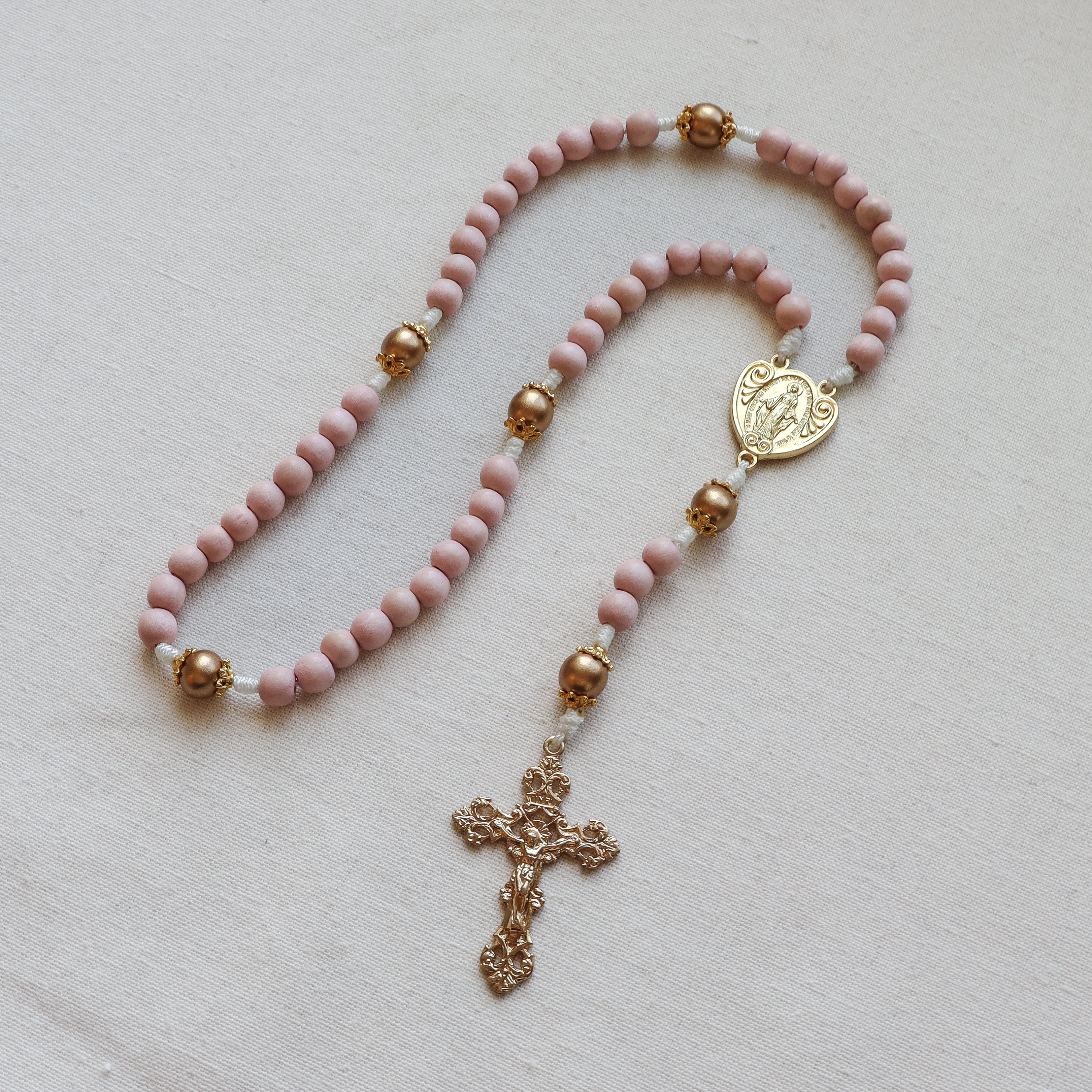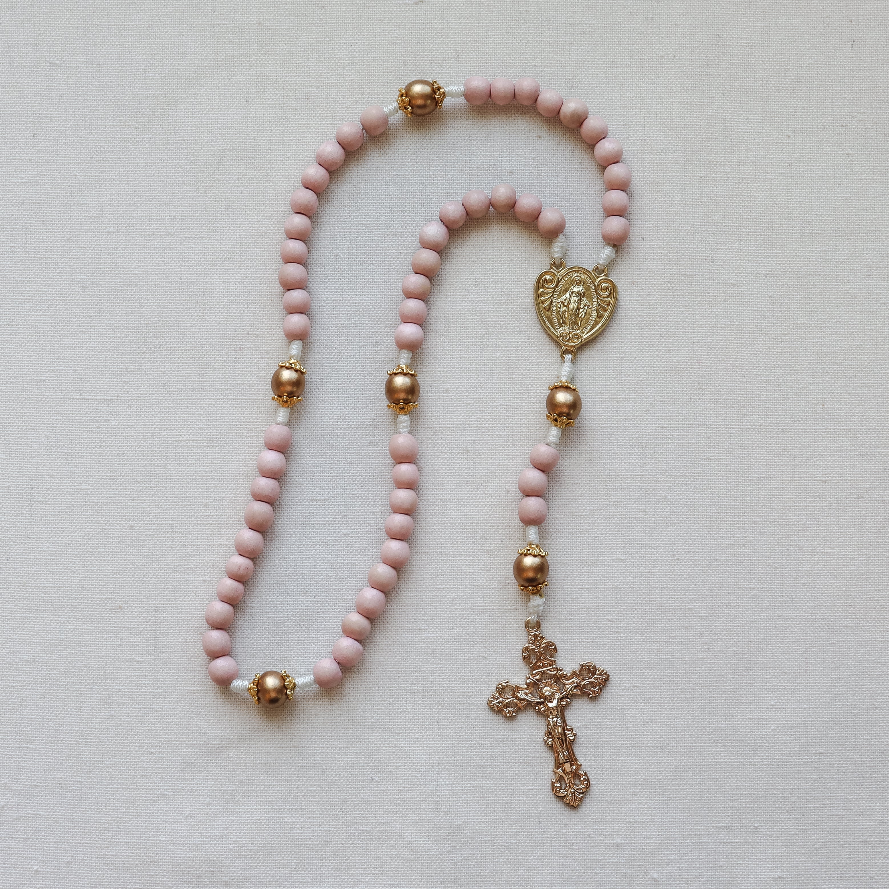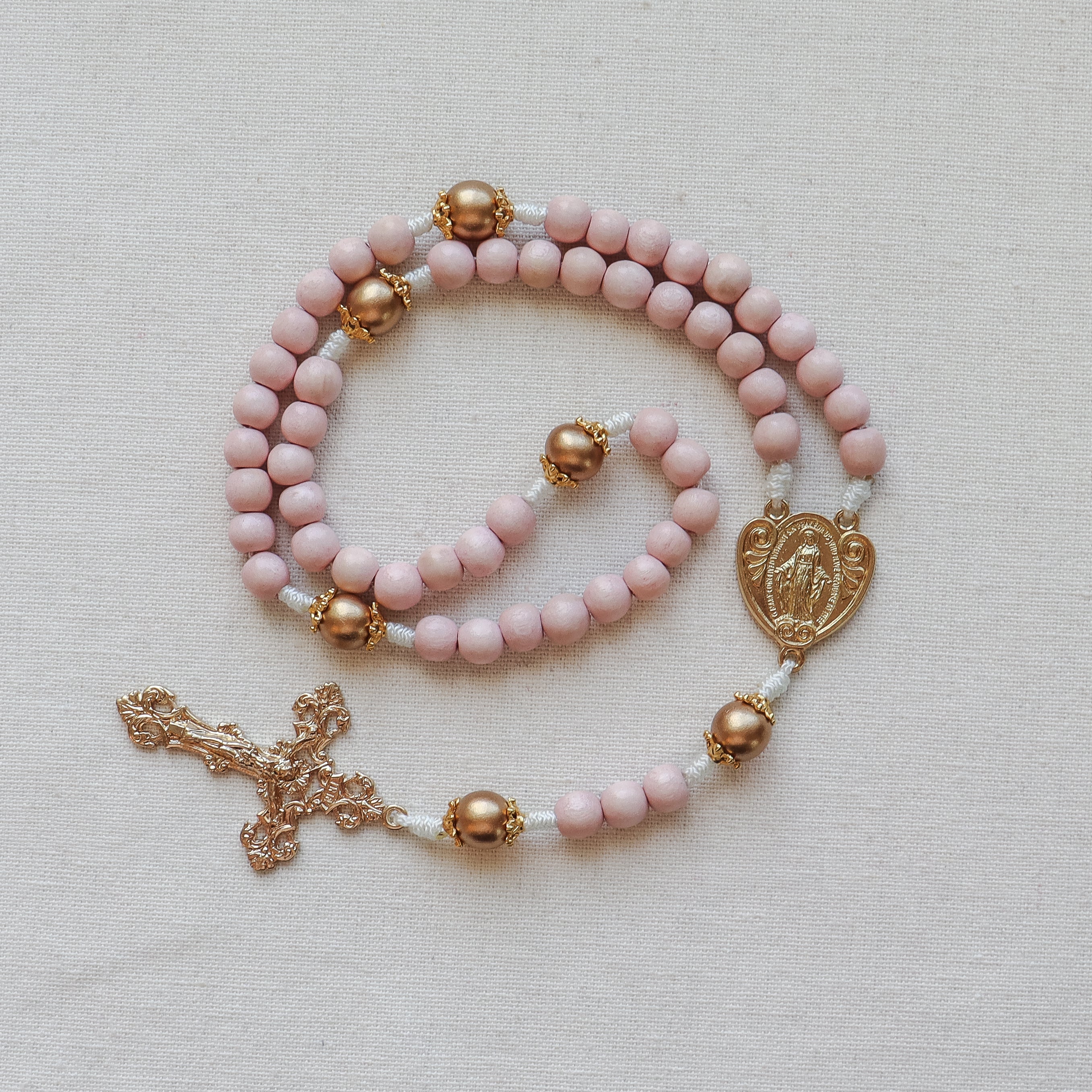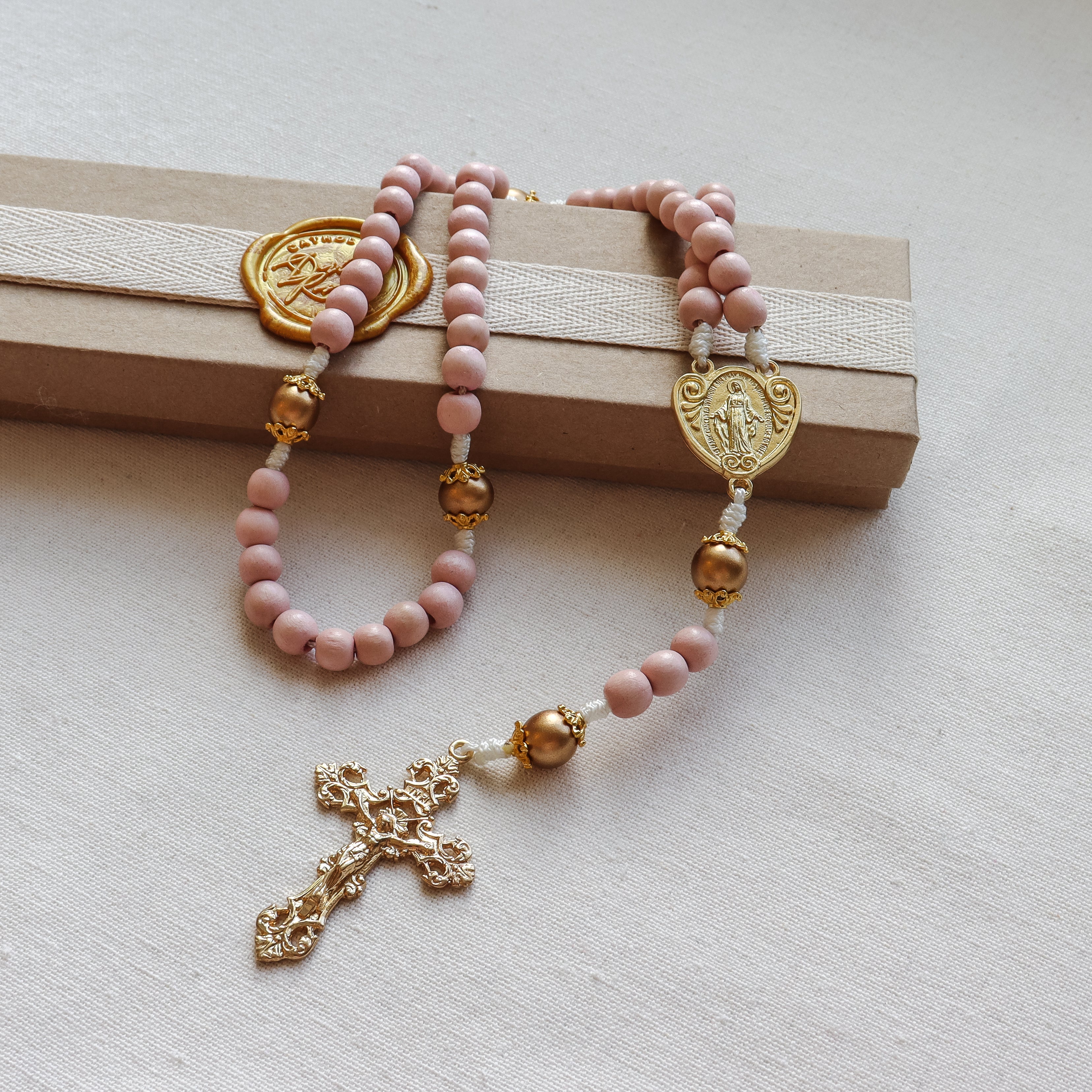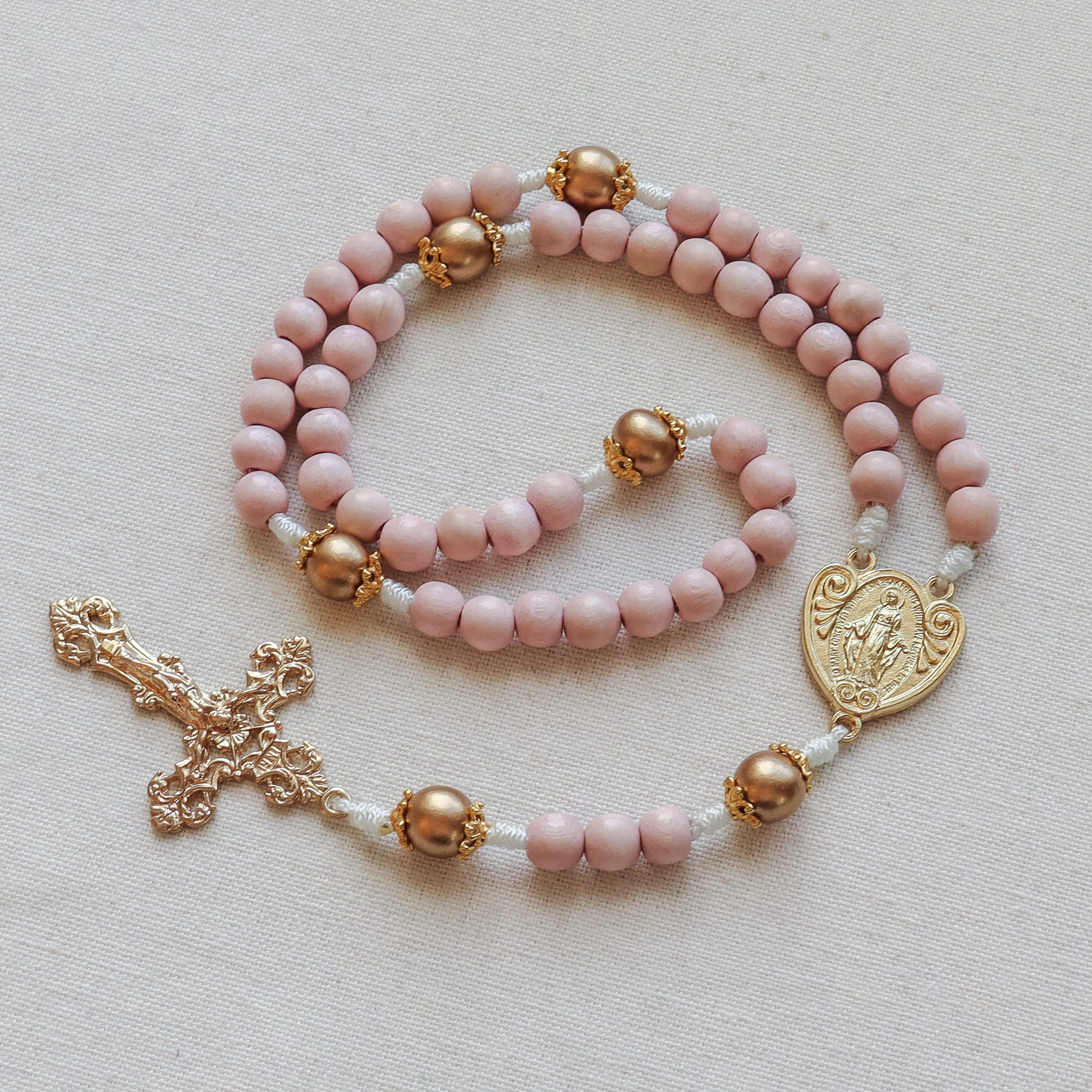 A soft, feminine rosary handmade to support daily prayer, featuring smooth pink blush wood beads and gold-tone accents. Finished with a Miraculous Medal centerpiece and crucifix made in Italy, it’s beautiful enough to gift and strong enough to become a daily prayer companion.