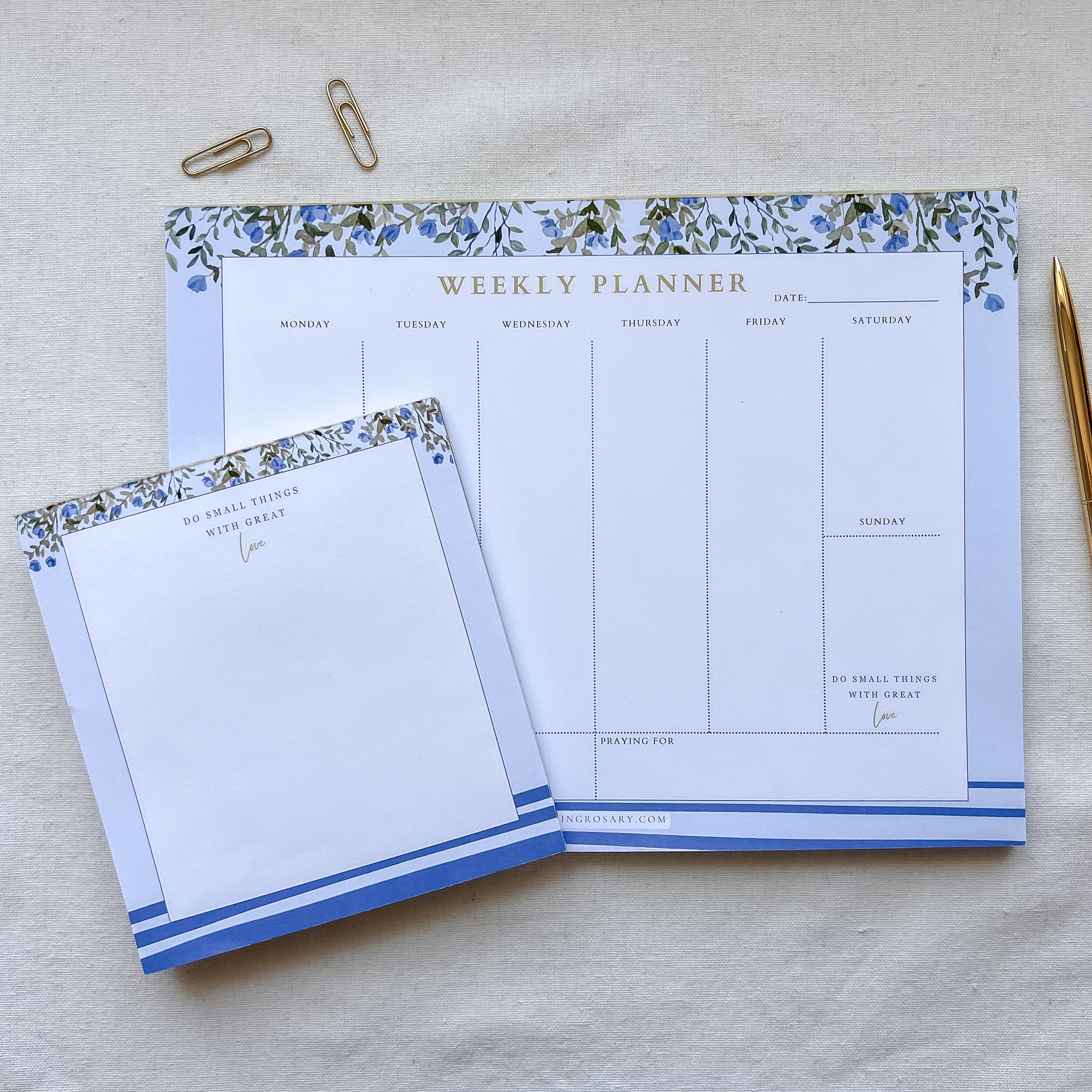 This small notepad is part of our Saint Teresa of Calcutta-inspired collection, featuring soft blue florals, delicate stripes like her sari, and her beloved quote: “Do small things with great love.” It’s a sweet reminder to approach every to-do, note, or prayer with intention and love.