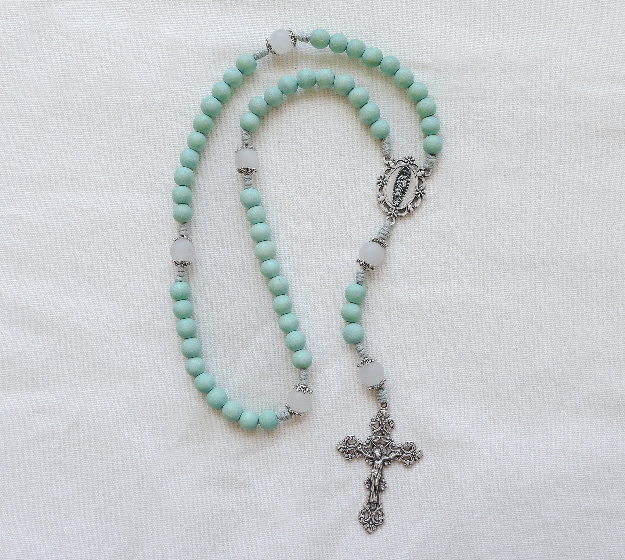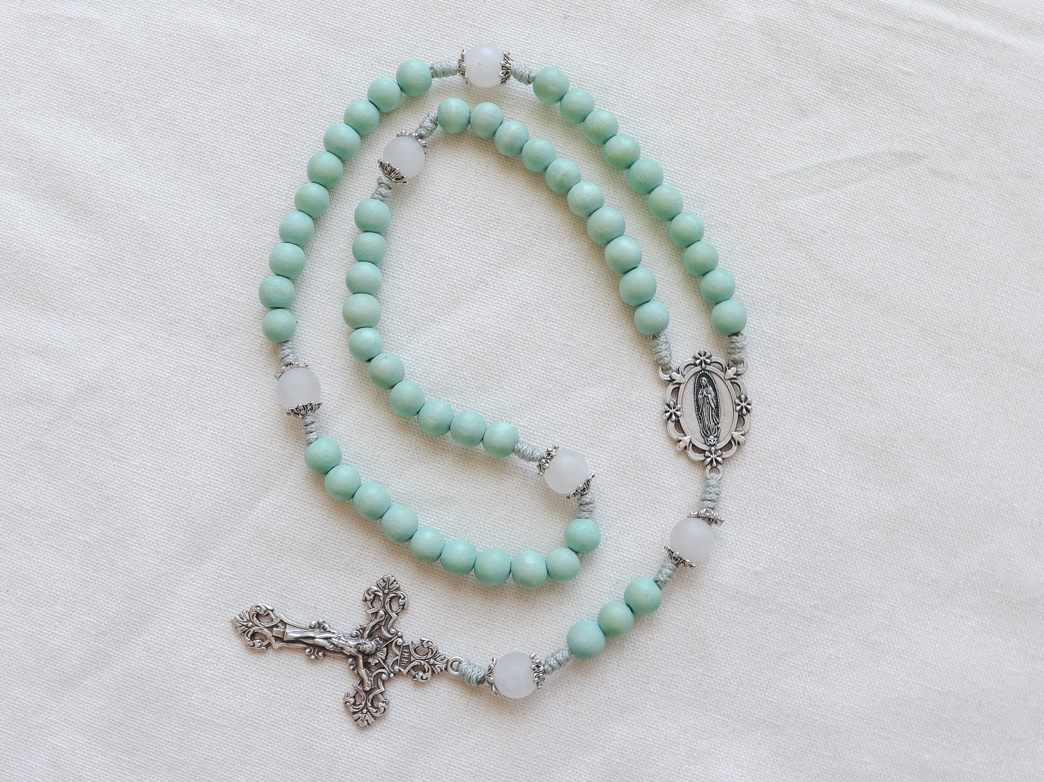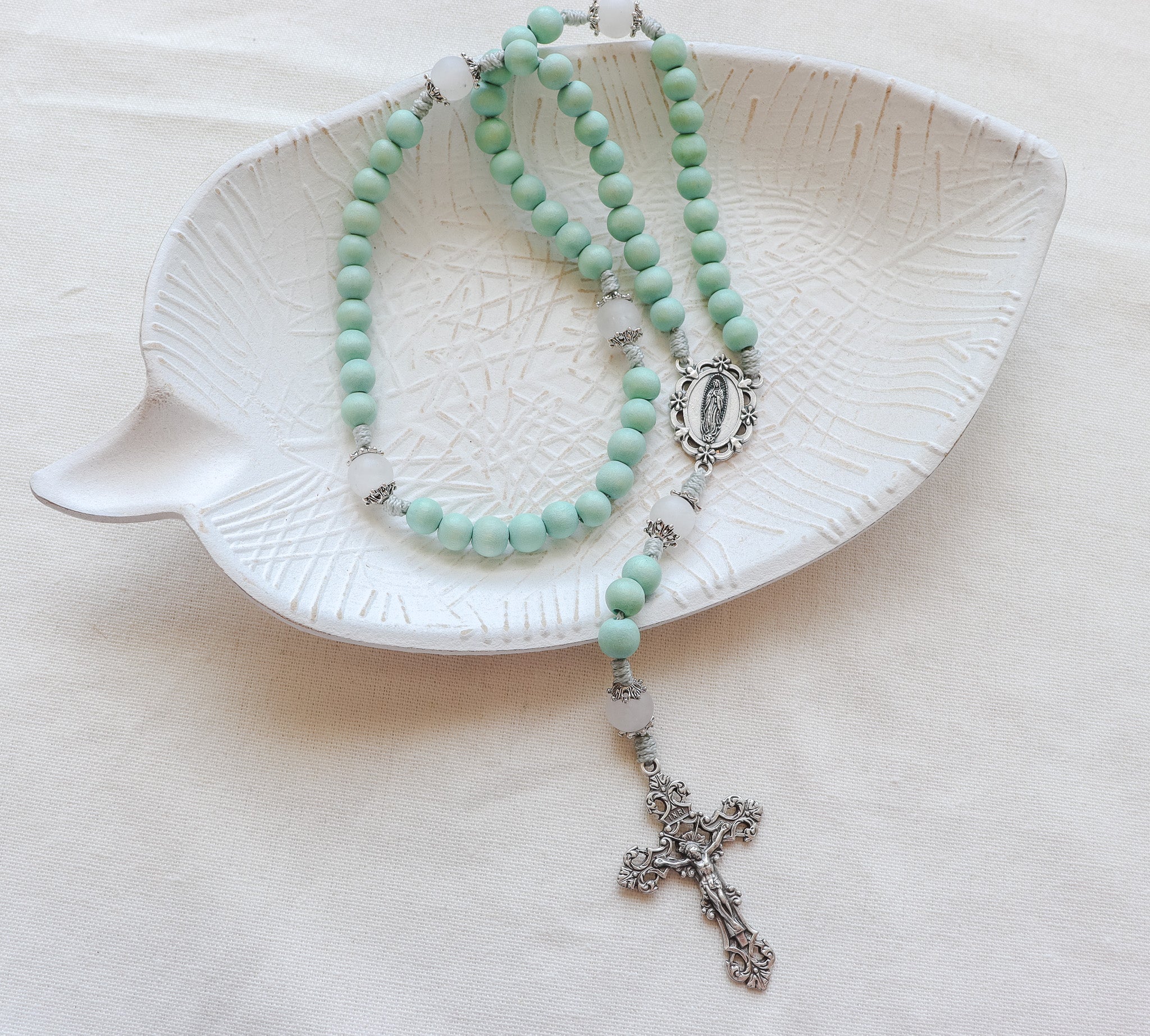 Bring prayer and peace into your day with this mint green wood and white jade Our Lady of Guadalupe rosary, handmade for daily devotion.