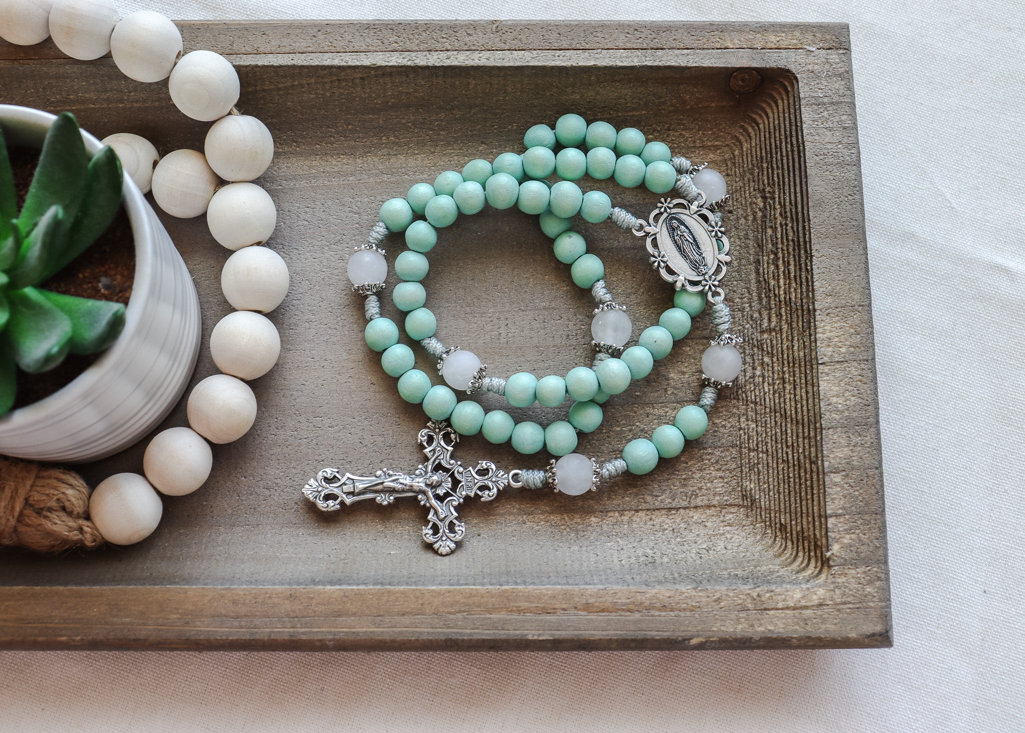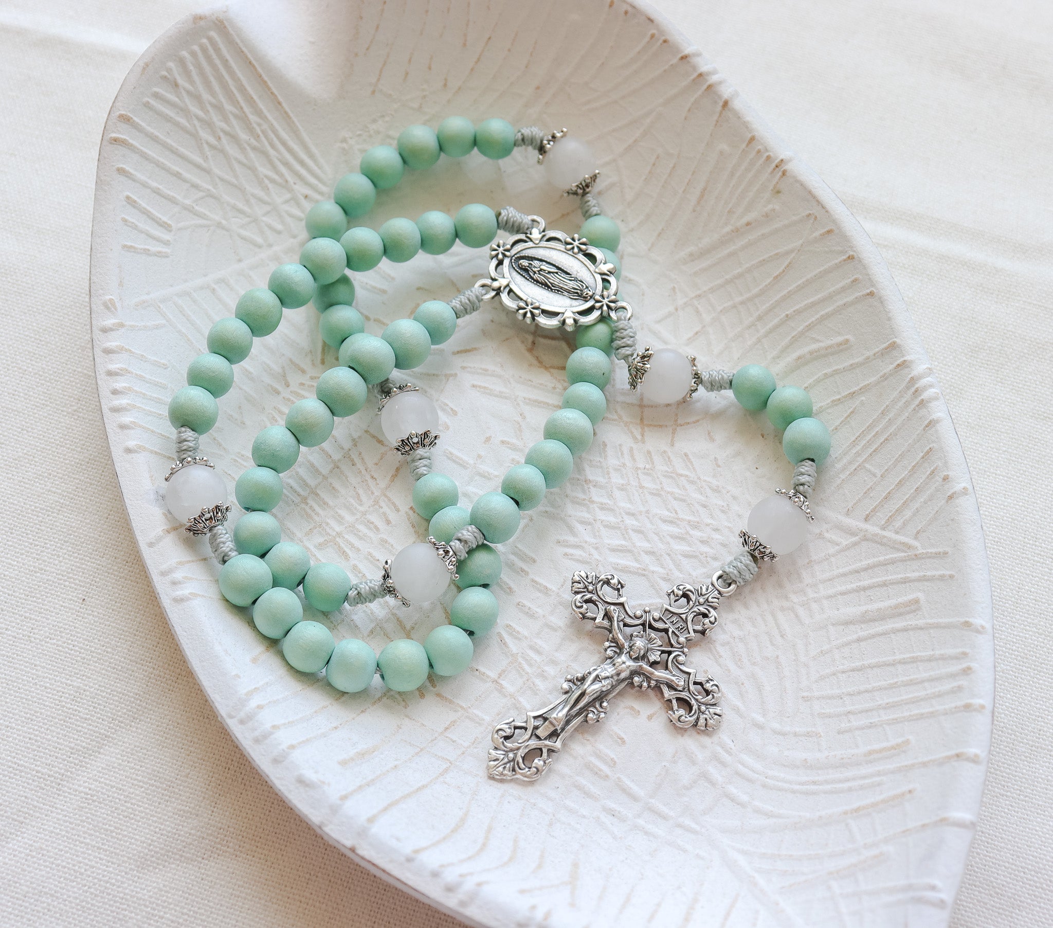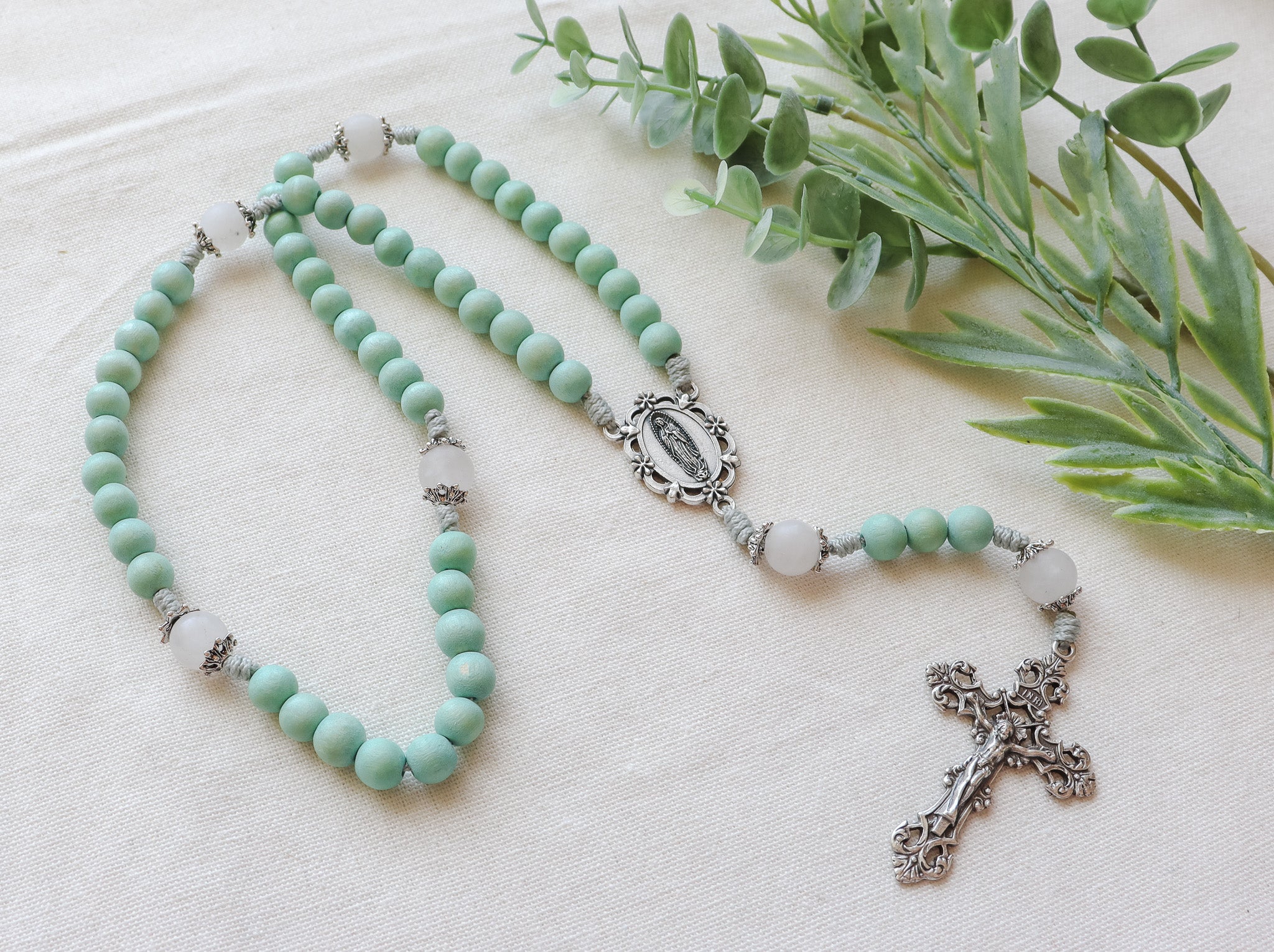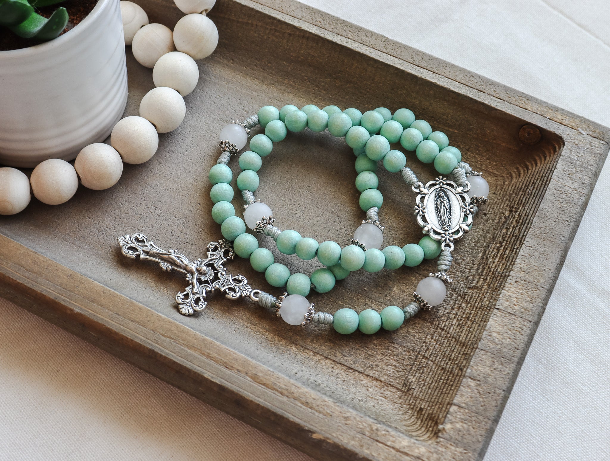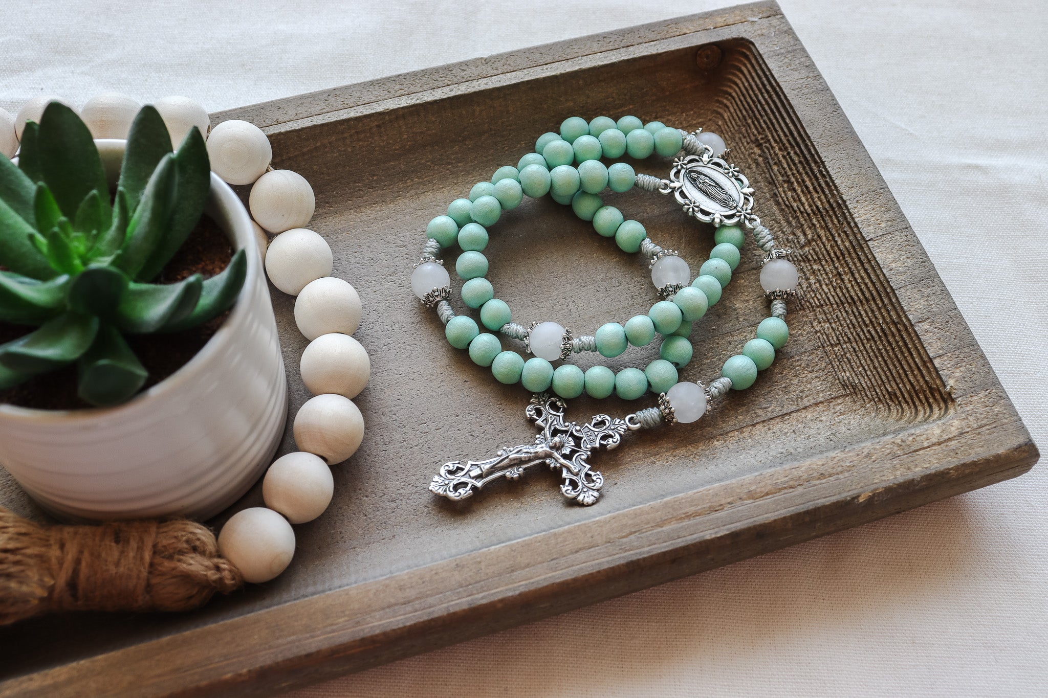 This rosary is handmade for women who want a prayer tool that feels peaceful, fresh, and meaningful each day. The smooth mint green wood Hail Mary beads feel light and calming in your hands, while the white jade Our Father beads add a touch of quiet beauty to every prayer. Strung on slim but strong micro cord paracord, it is built to last through years of daily use without fraying or breaking.