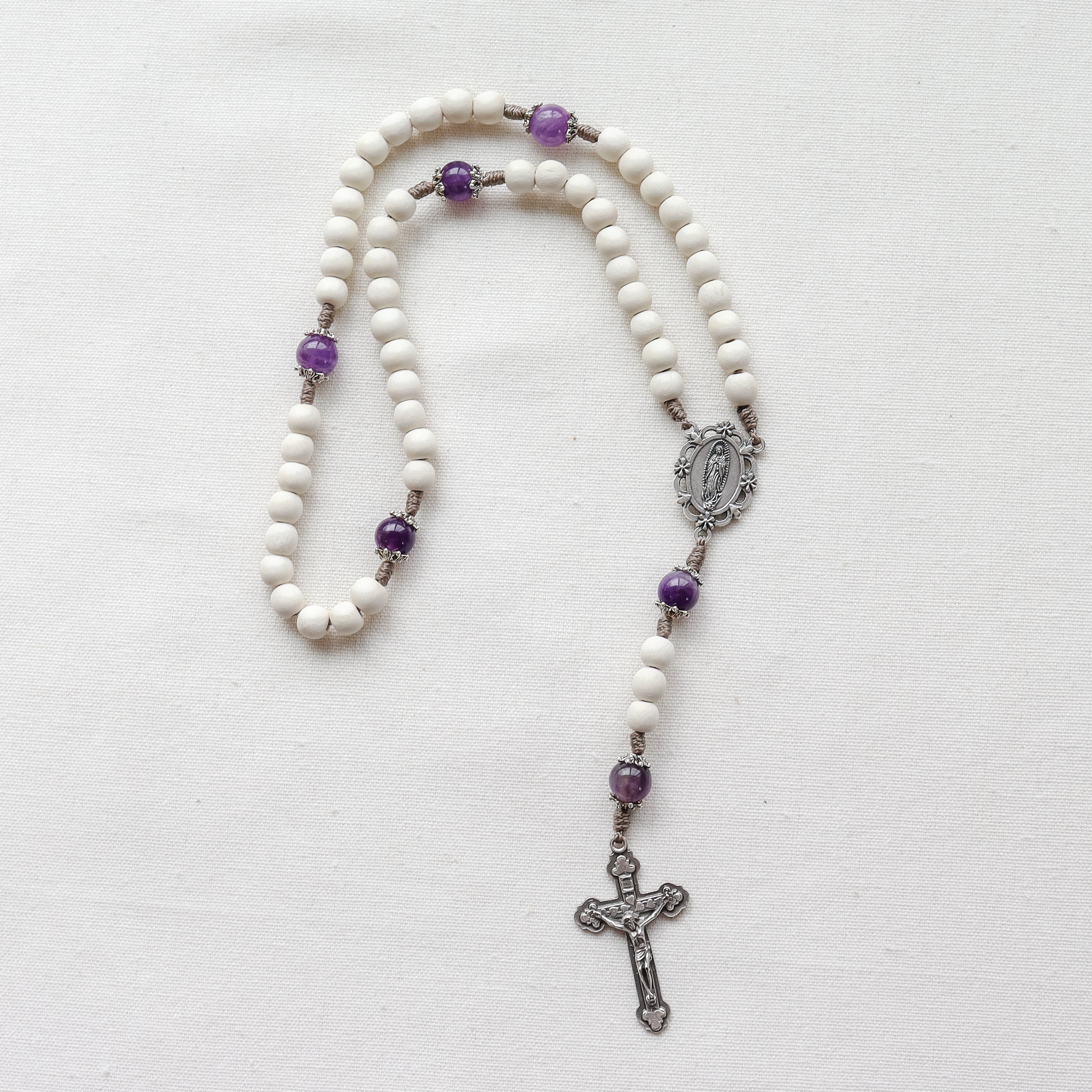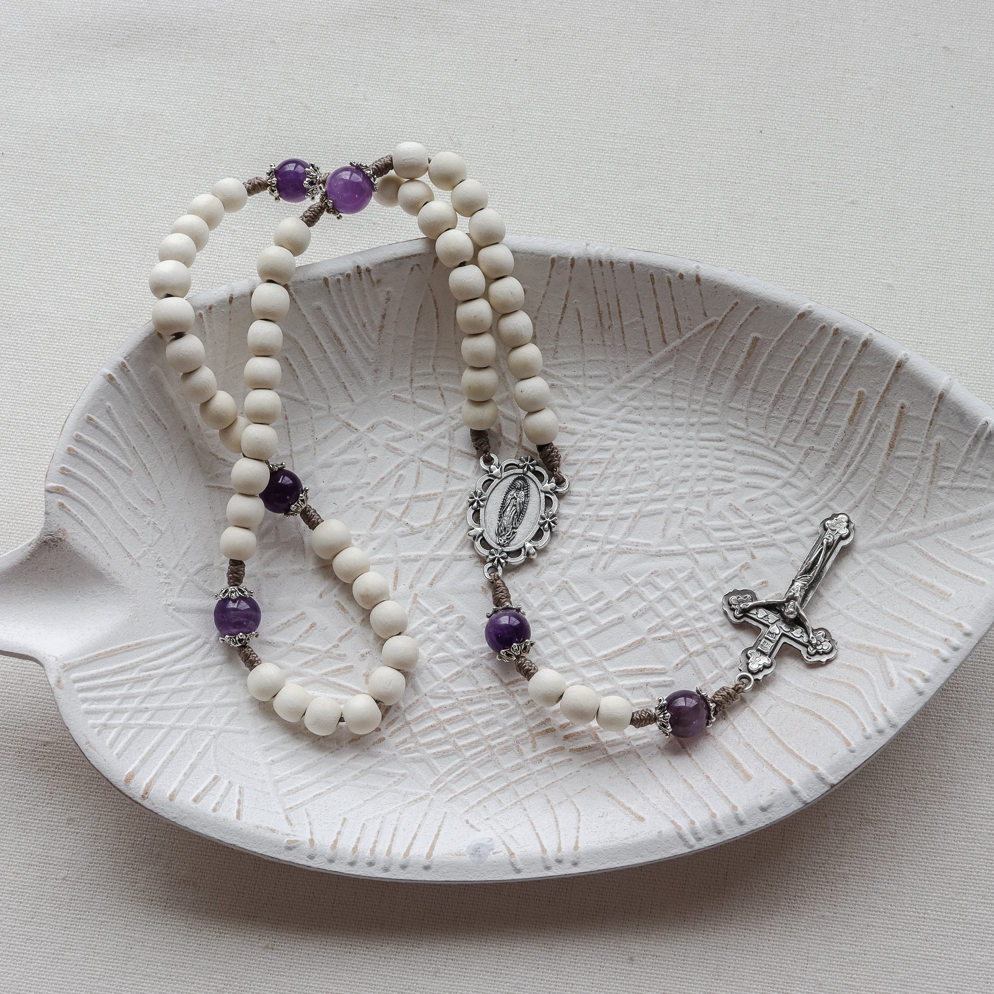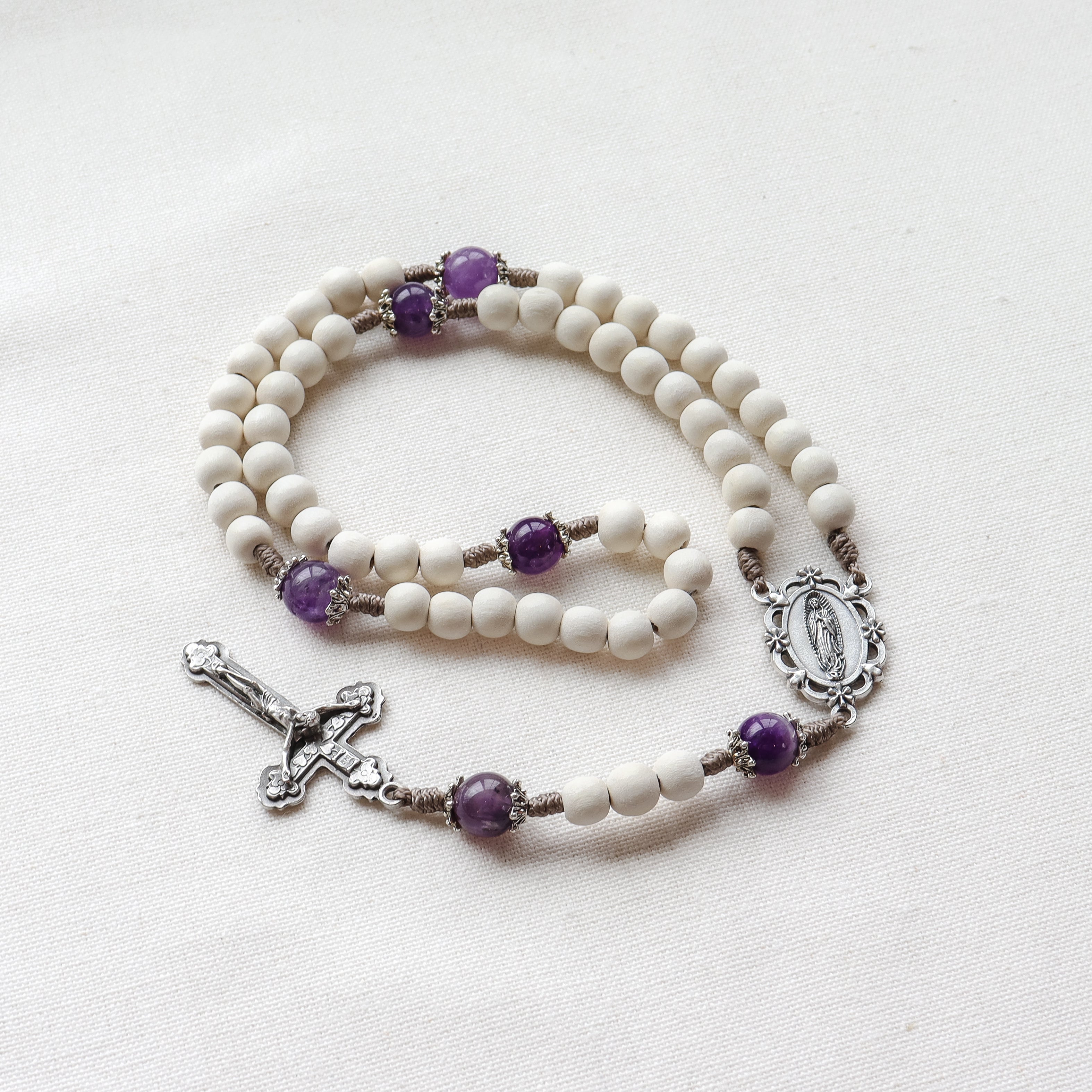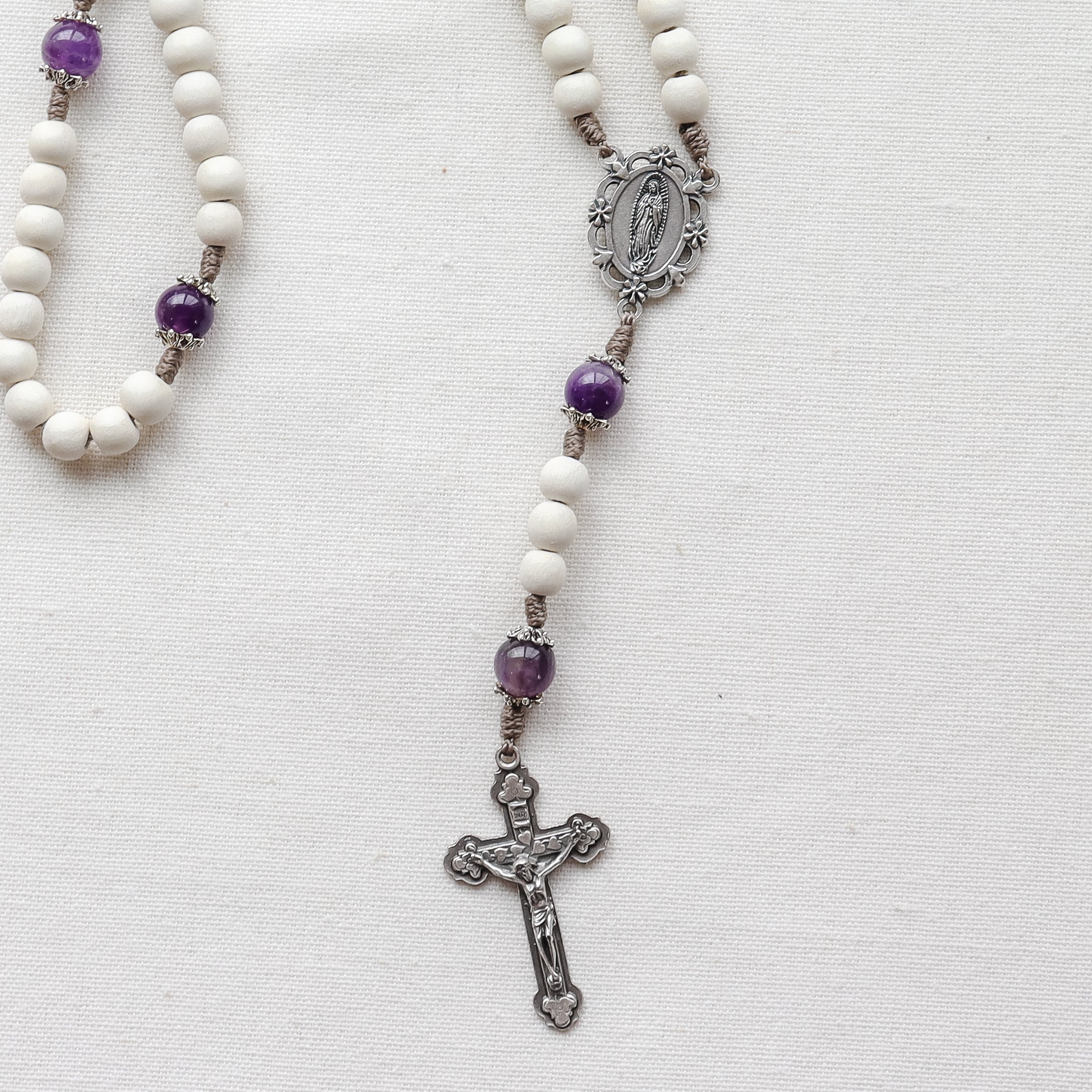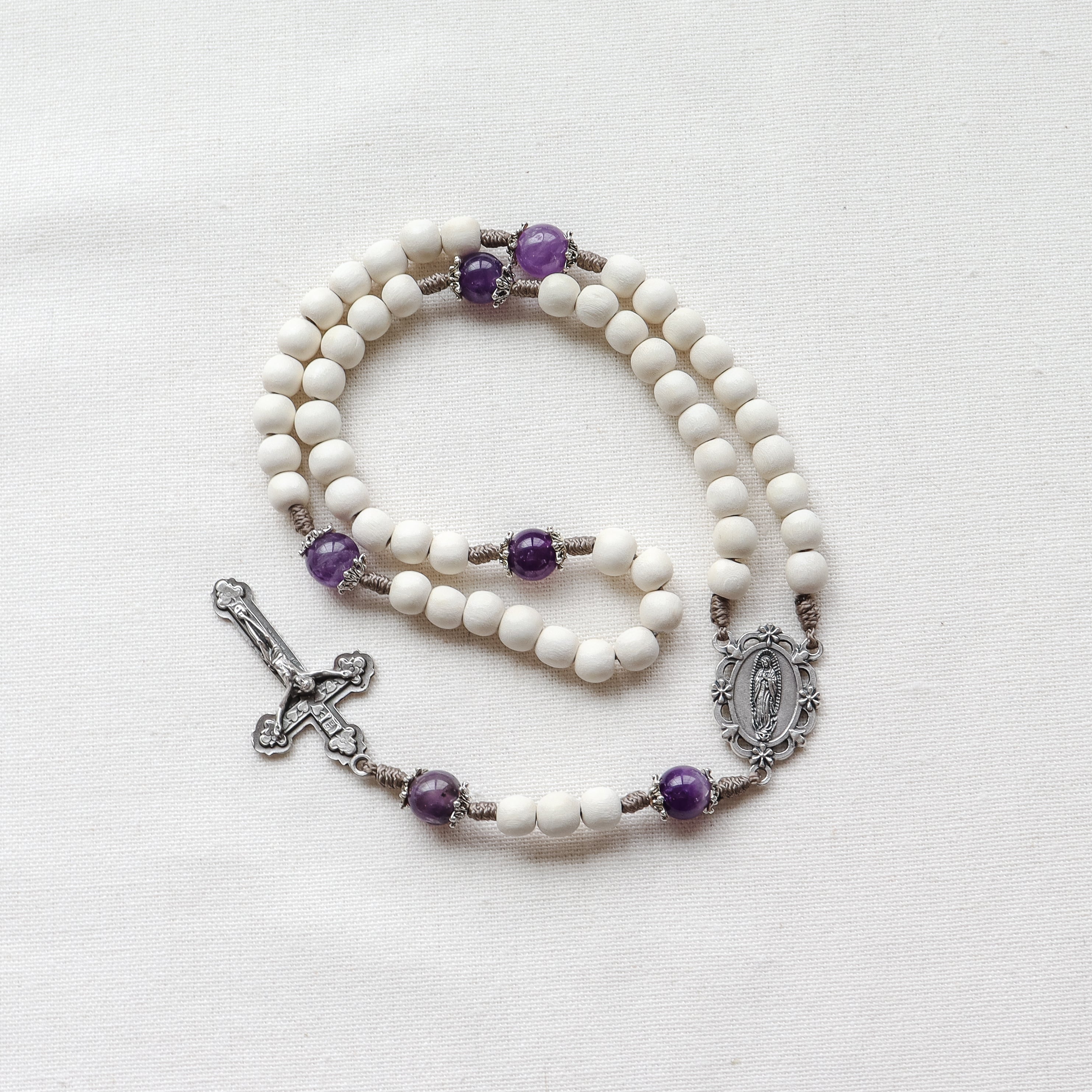 Our Lady of Guadalupe White Wood and Purple Amethyst Rosary