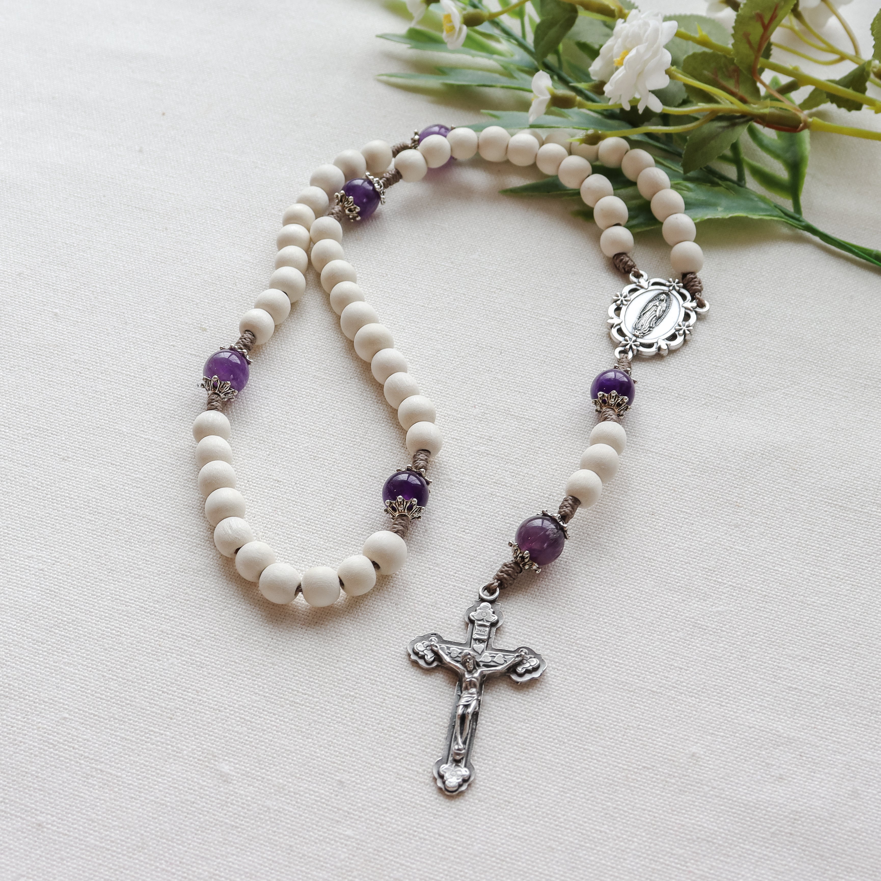 This handmade and carefully crafted rosary features 8mm waxed white wood beads, 10mm glossy purple amethyst stone beads, and silver tone metal bead caps. We use micro cord paracord which is slim yet strong and durable enough to keep for a lifetime. The silver tone crucifix and Our Lady of Guadalupe center are made in Italy 🇮🇹