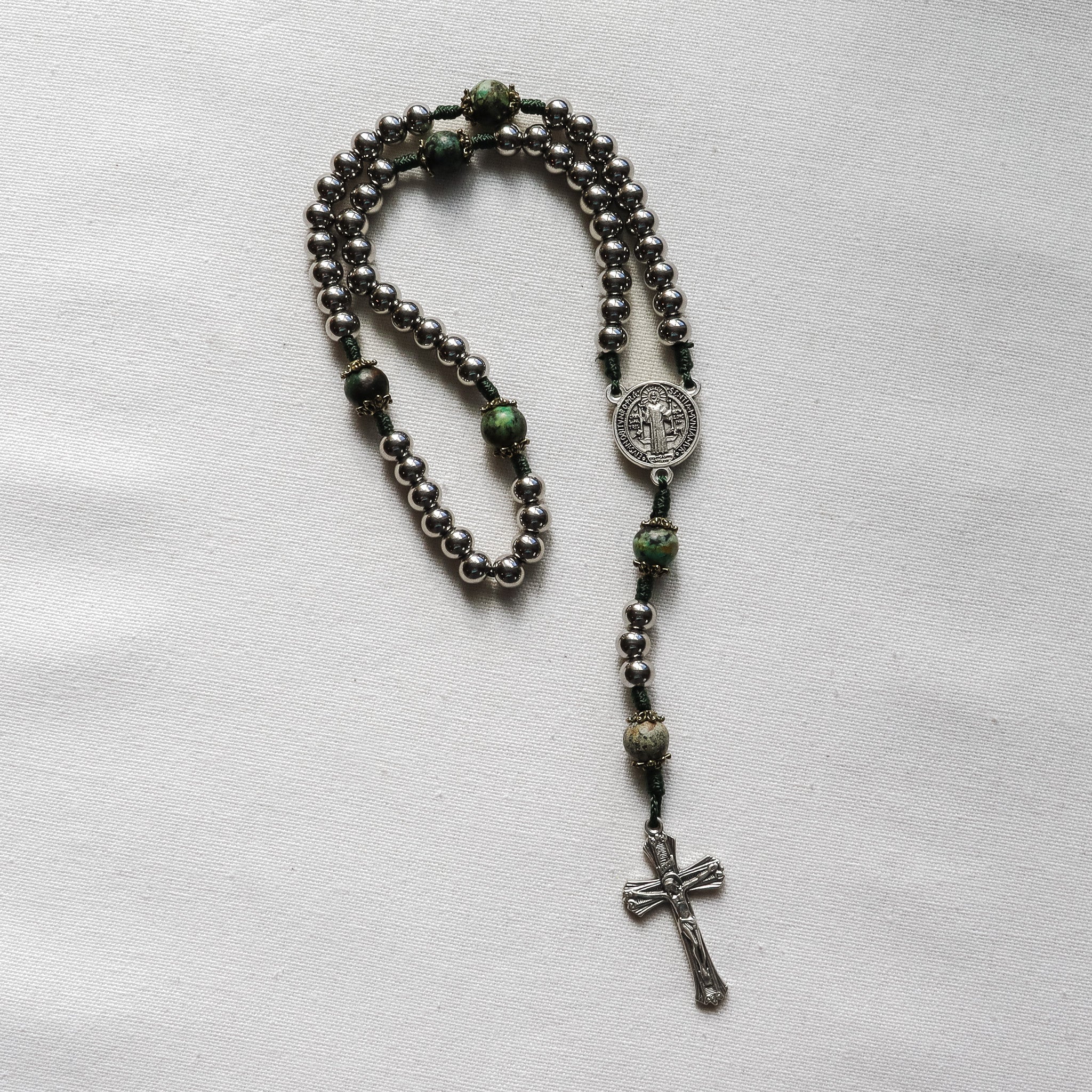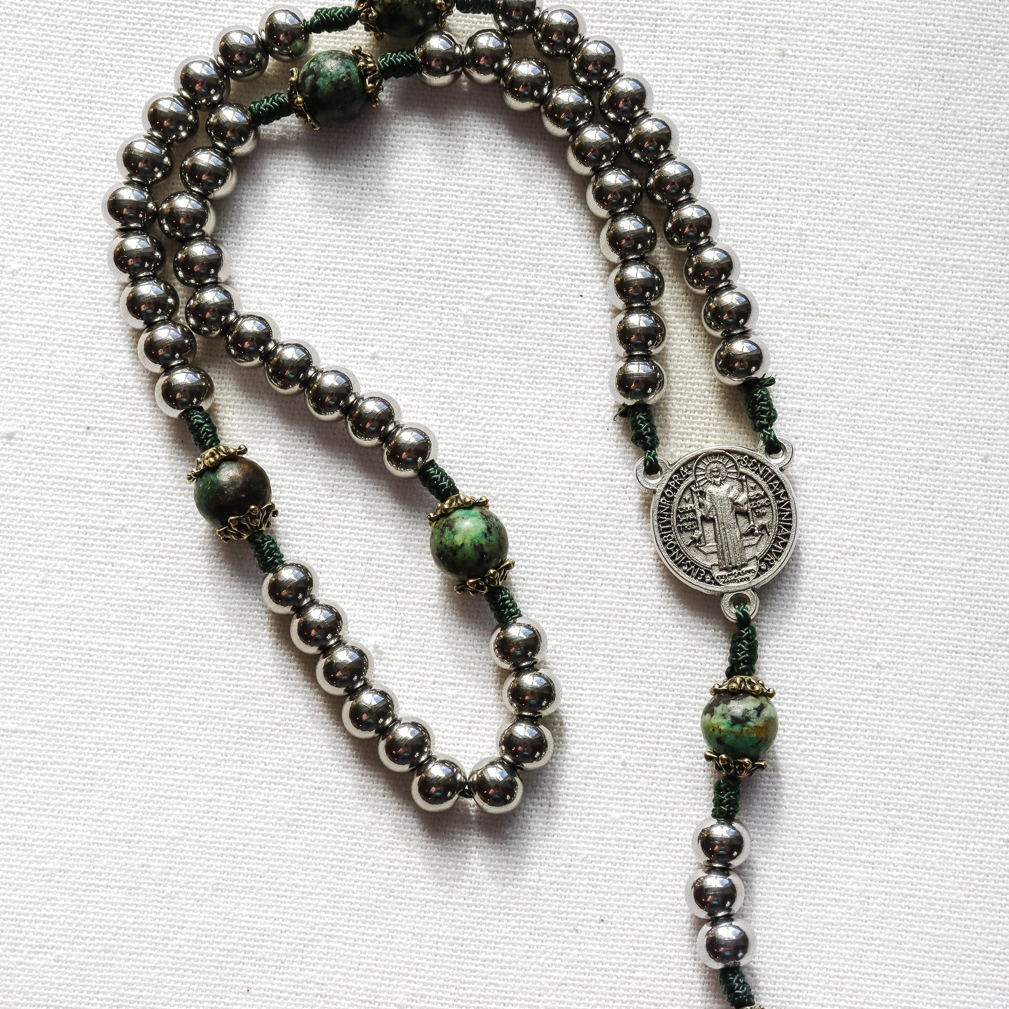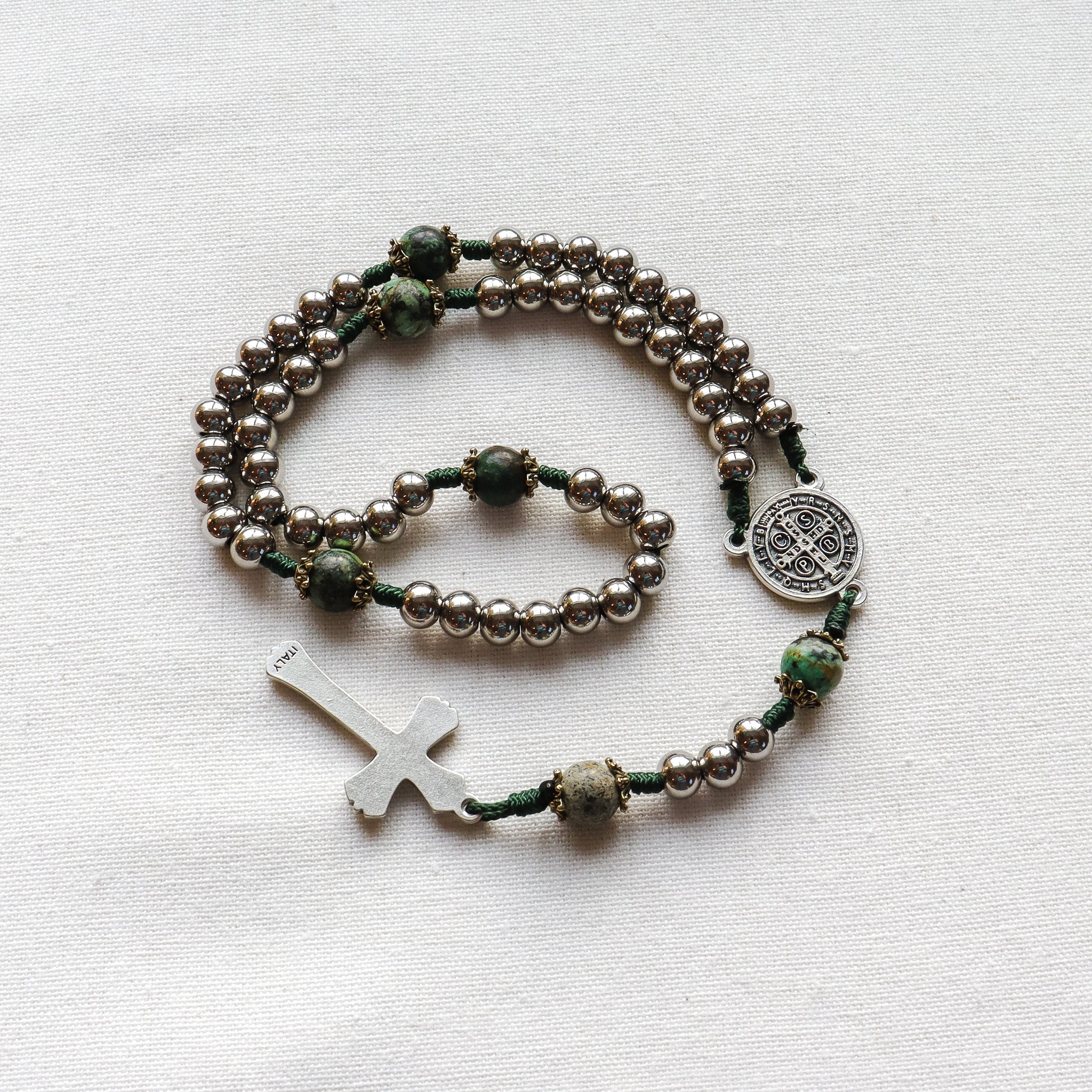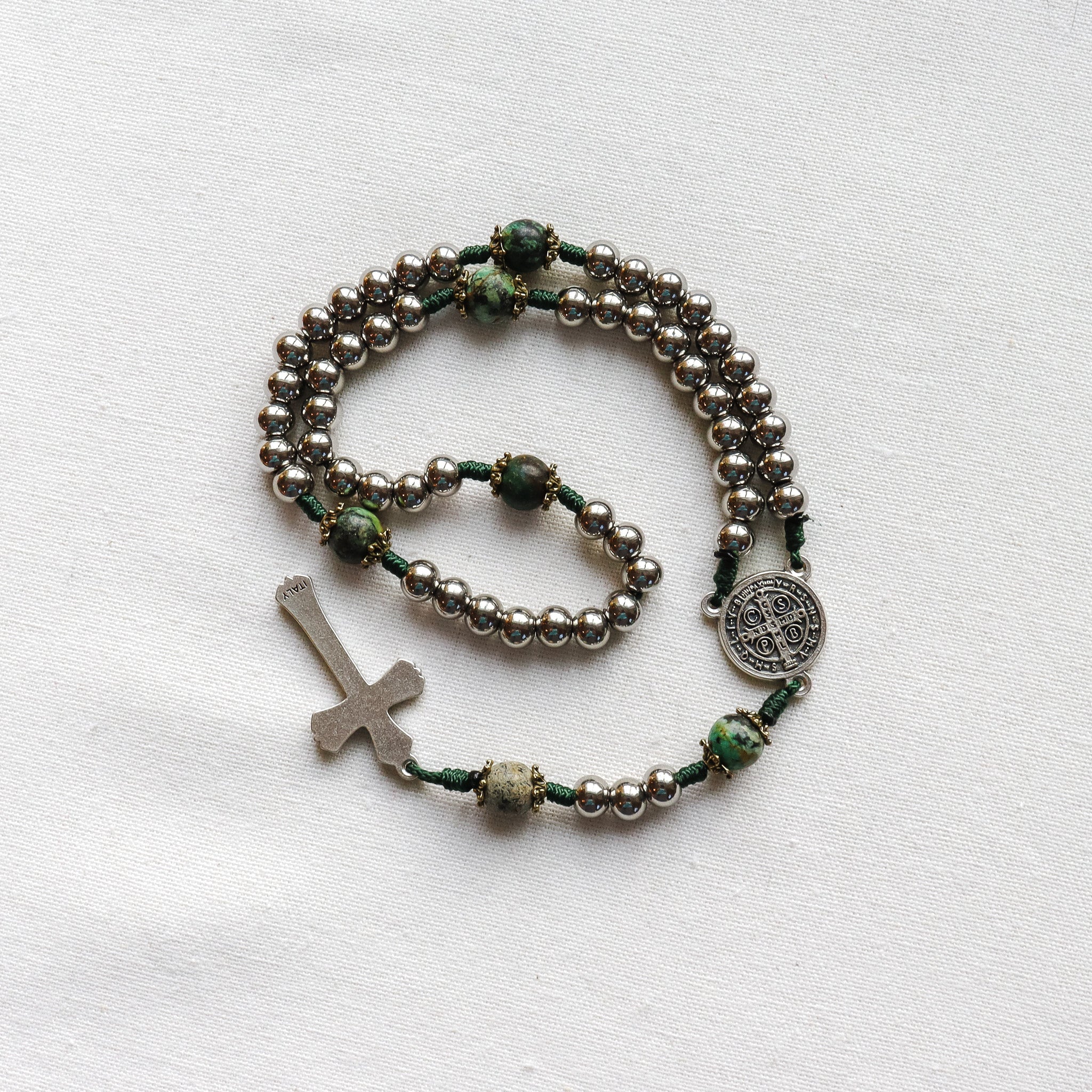 A bold, modern rosary handmade to support daily prayer, featuring natural African turquoise beads paired with sleek 304 stainless steel beads. Finished with a Saint Benedict medal centerpiece and crucifix made in Italy, it’s meaningful enough to gift and built to last through years of devotion.