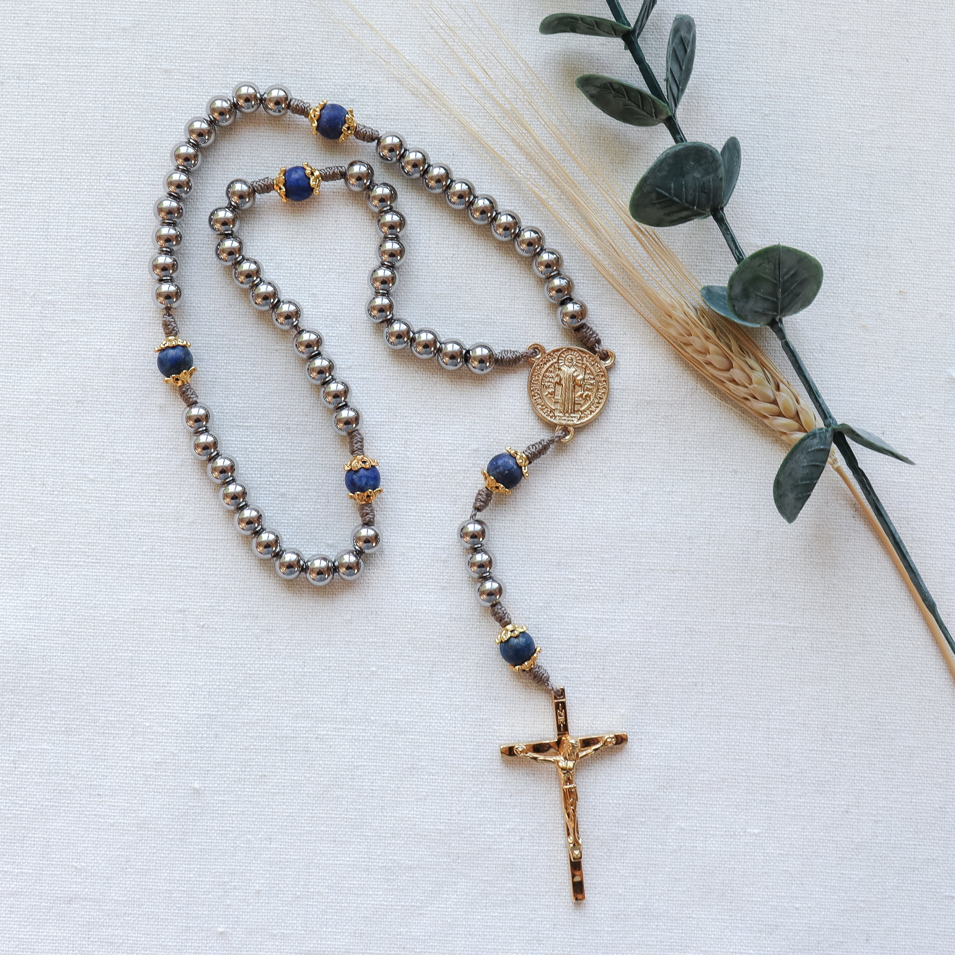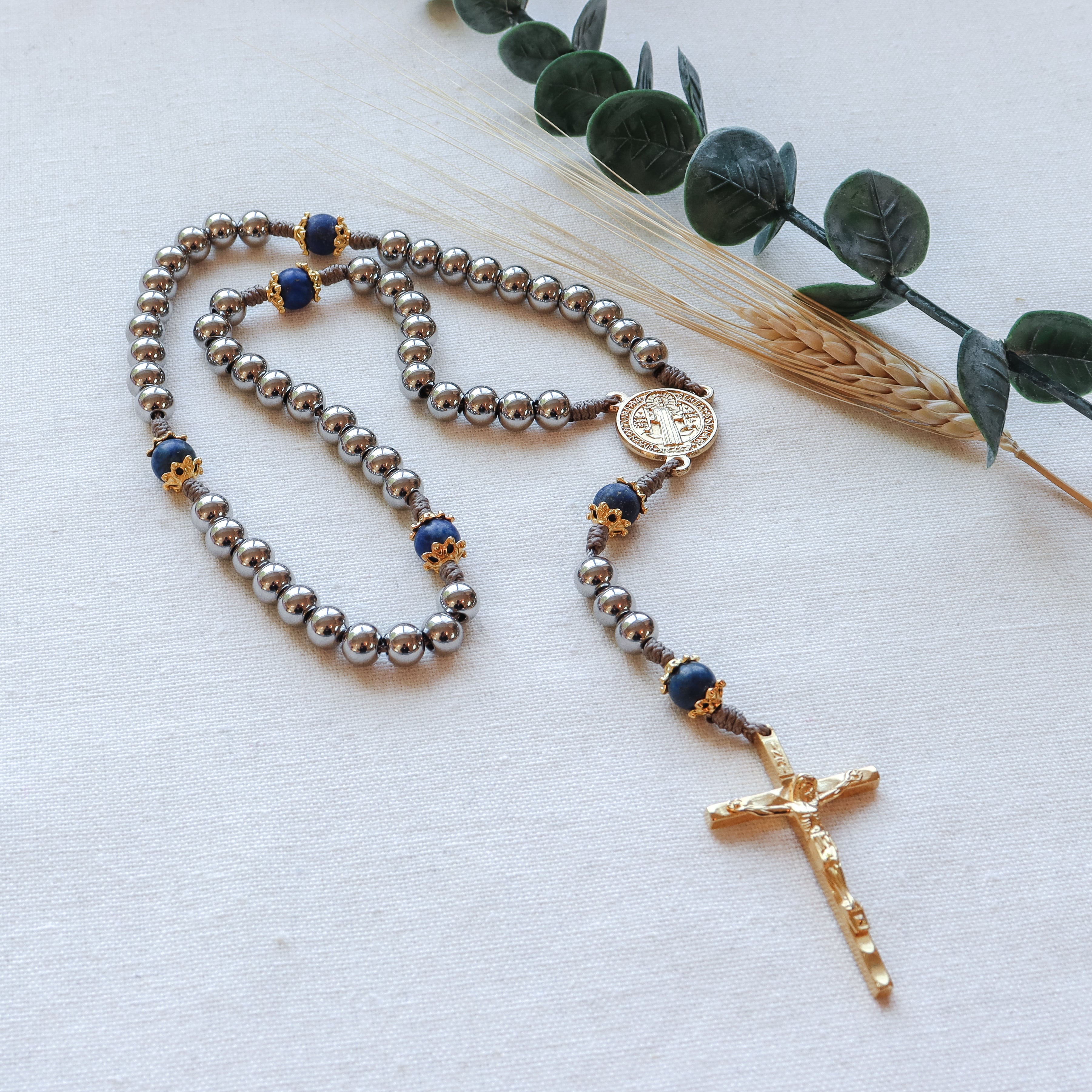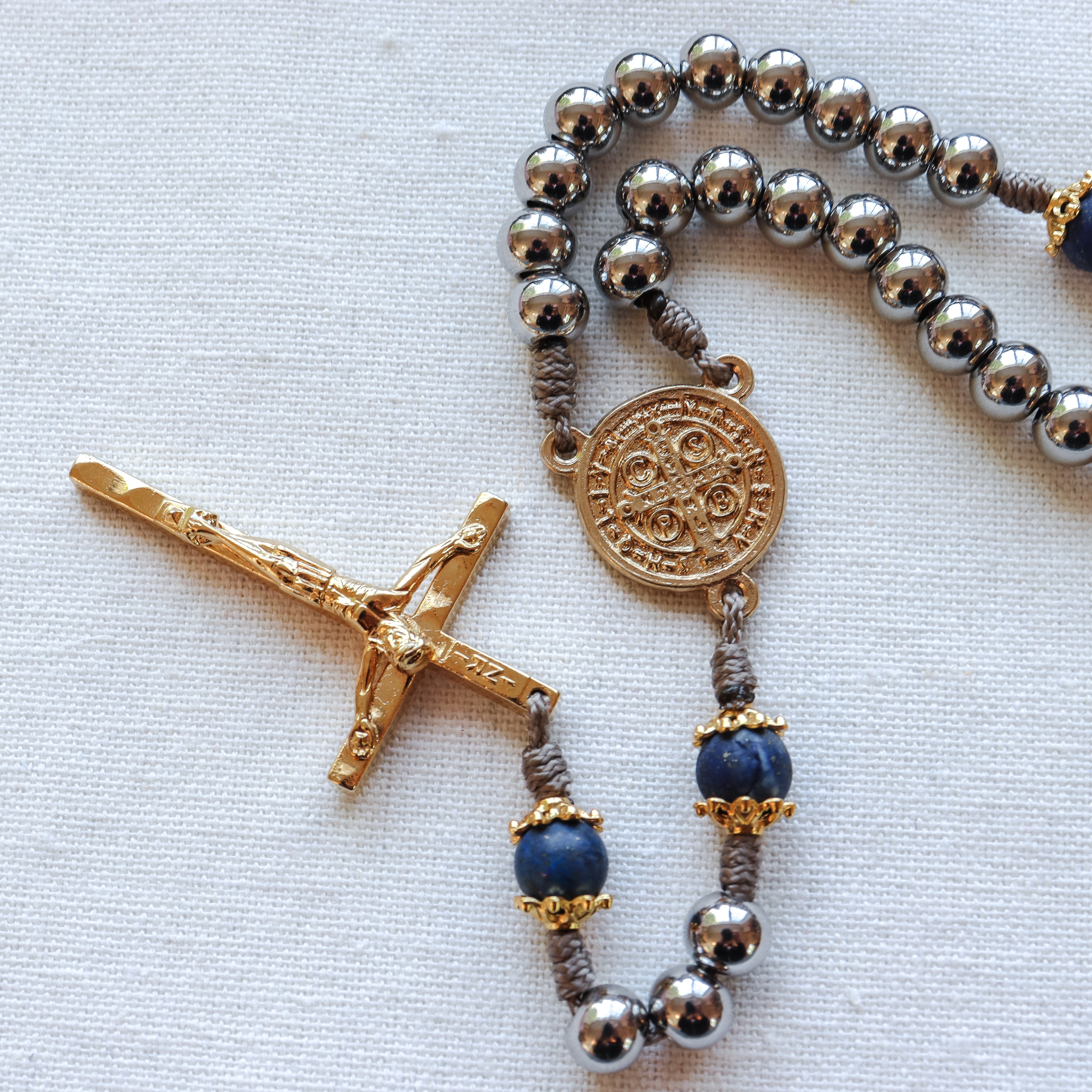 A strong, timeless rosary handmade to support daily prayer, featuring premium 304 stainless steel beads beads and lapis lazuli stones. Finished with a gold-tone Saint Benedict centerpiece and hammered crucifix made in Italy, it’s durable enough for everyday use and meaningful enough to gift.