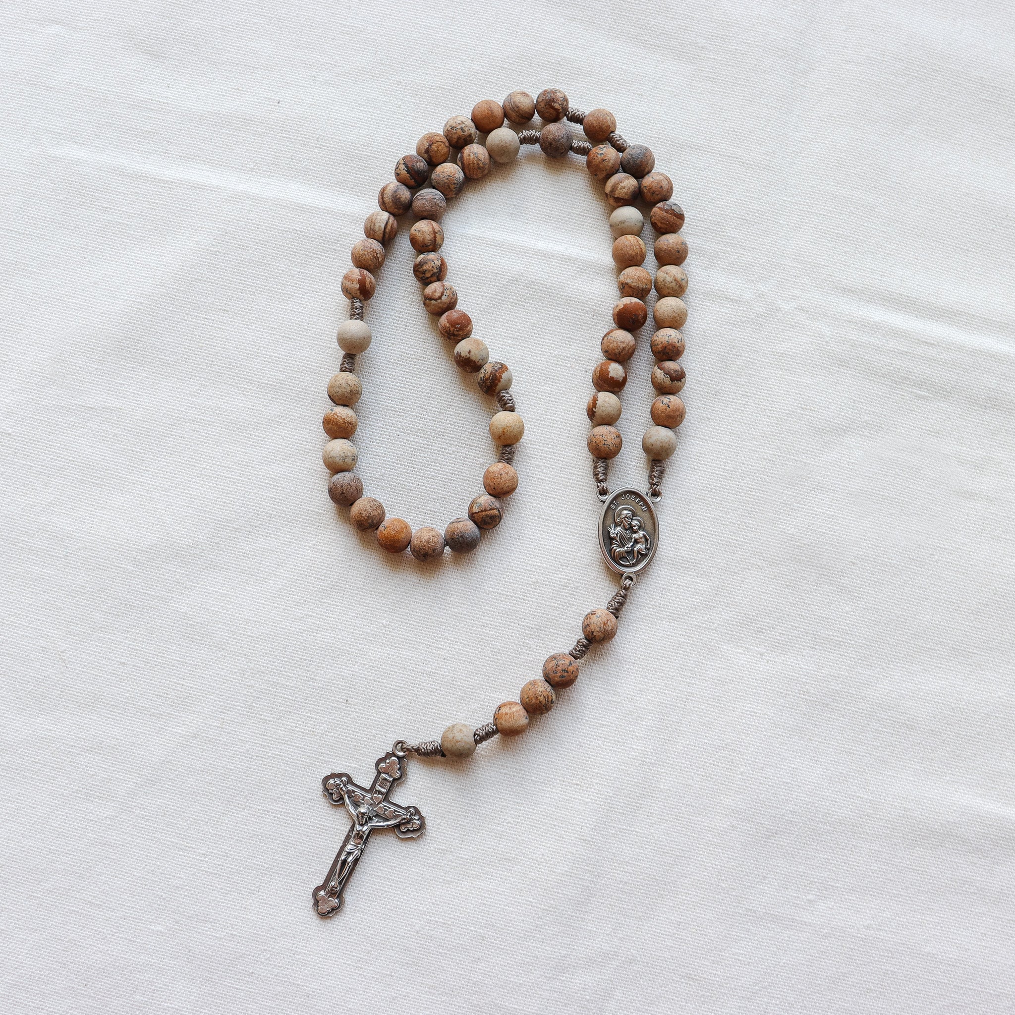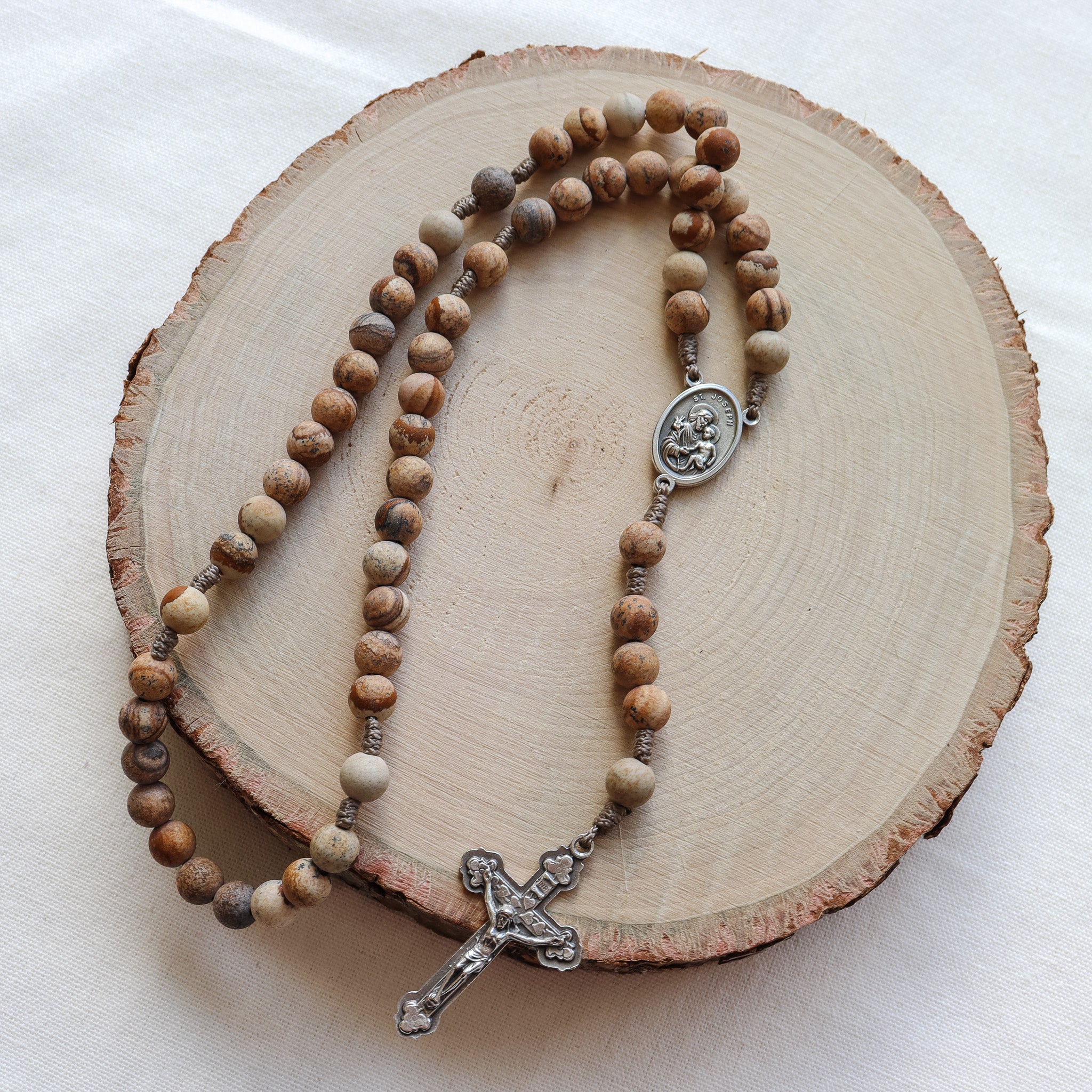 A strong, timeless rosary handmade to support daily prayer, featuring natural matte jasper stone beads in rich earthy tones. Finished with a Saint Joseph centerpiece and crucifix made in Italy, it’s meaningful enough to gift and durable enough for lifelong devotion.
