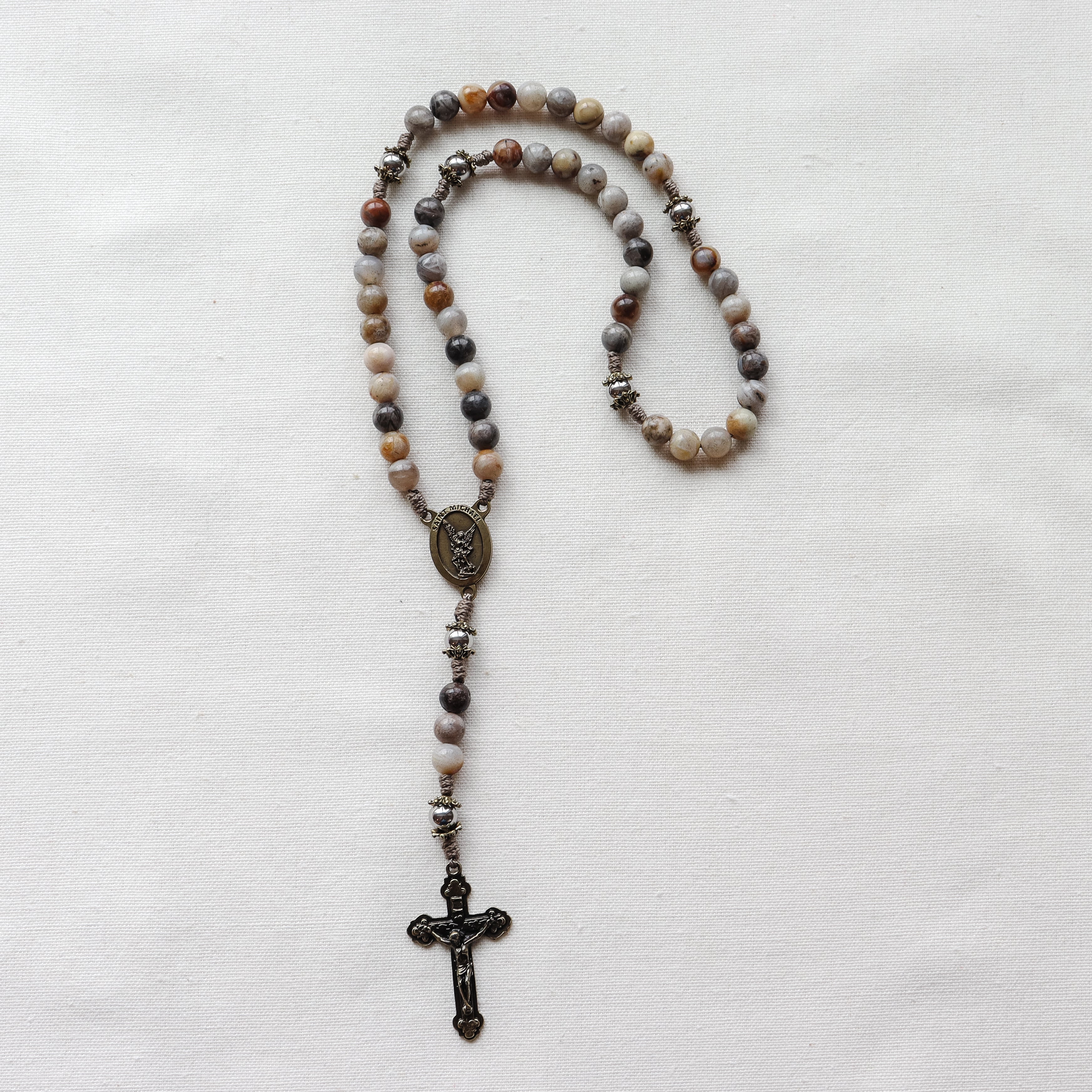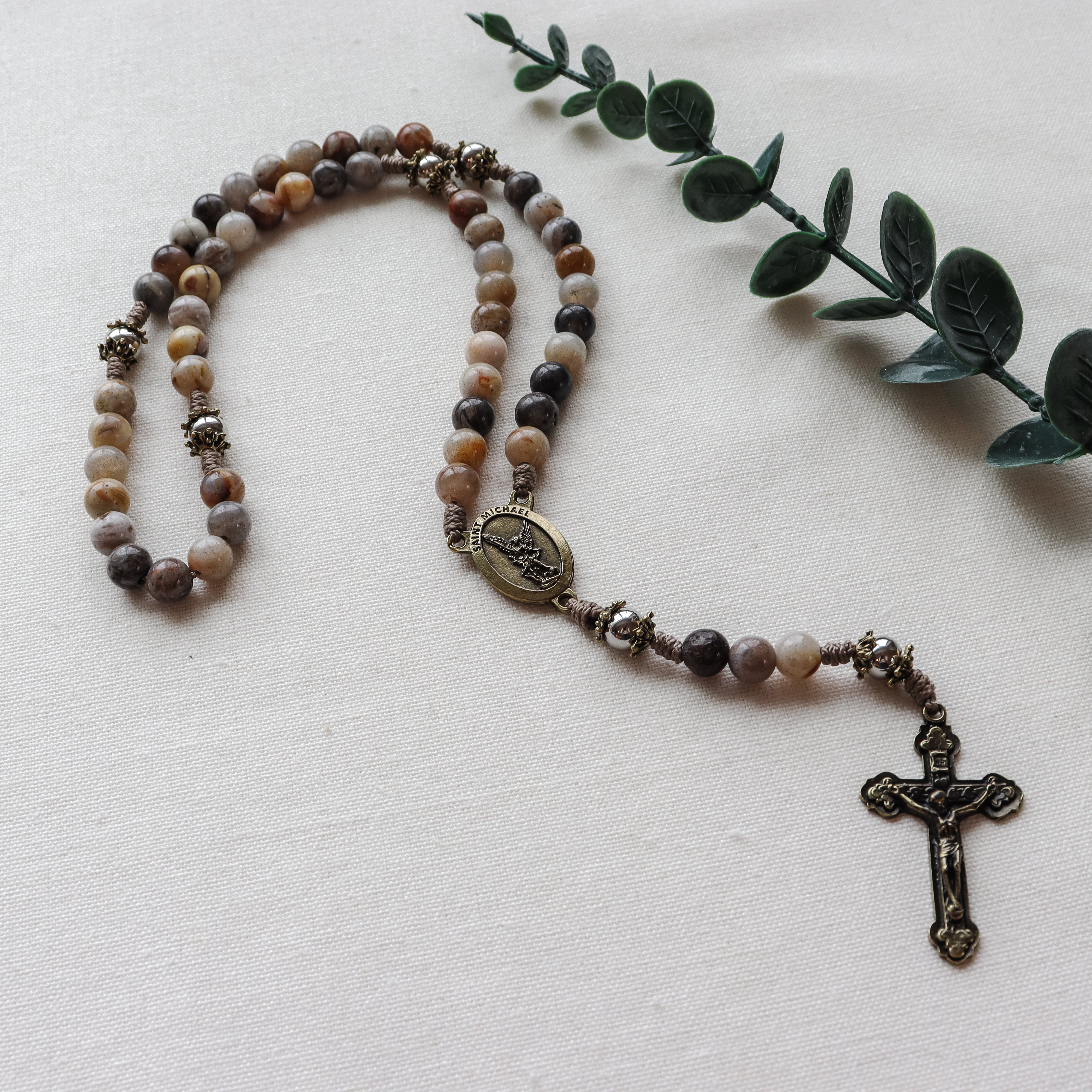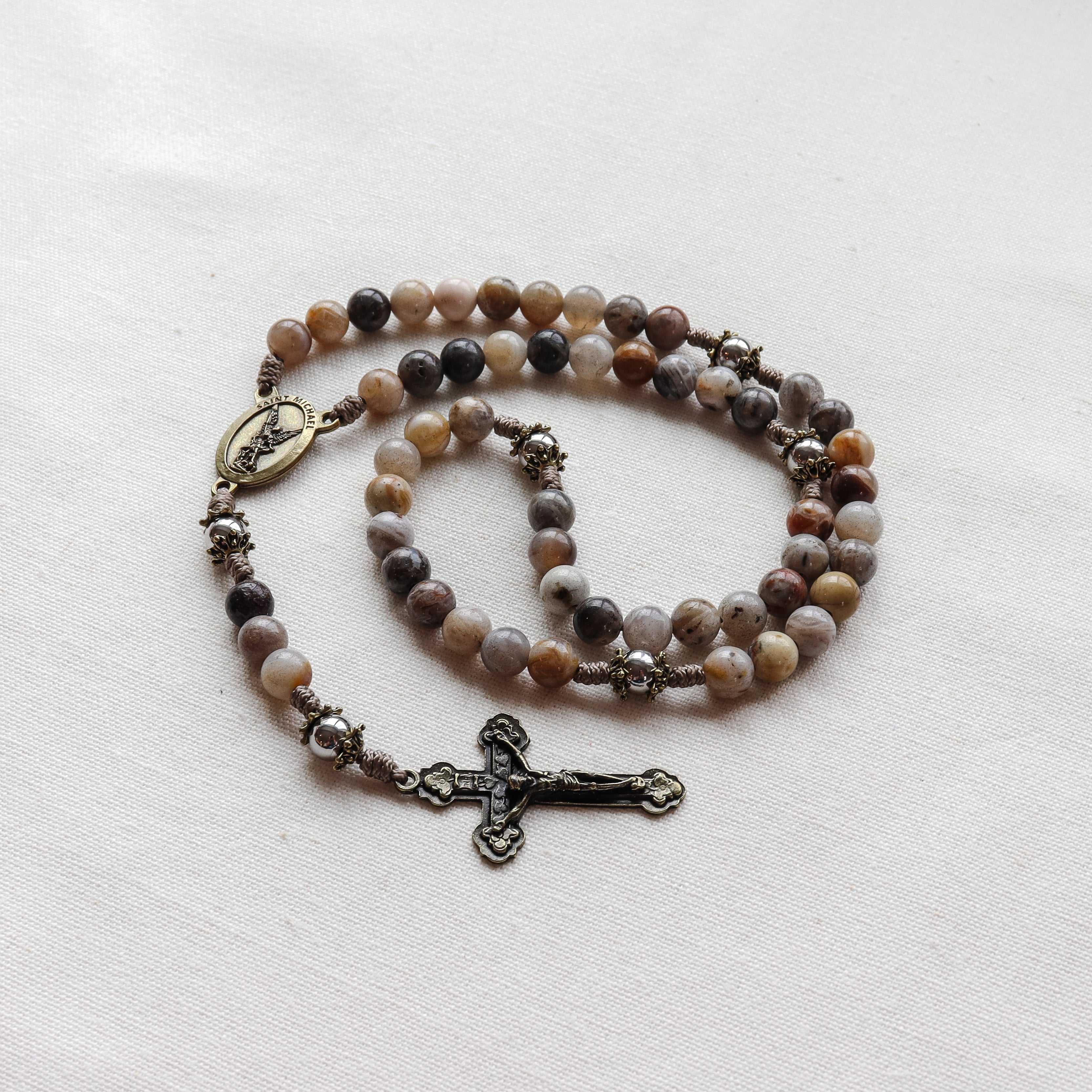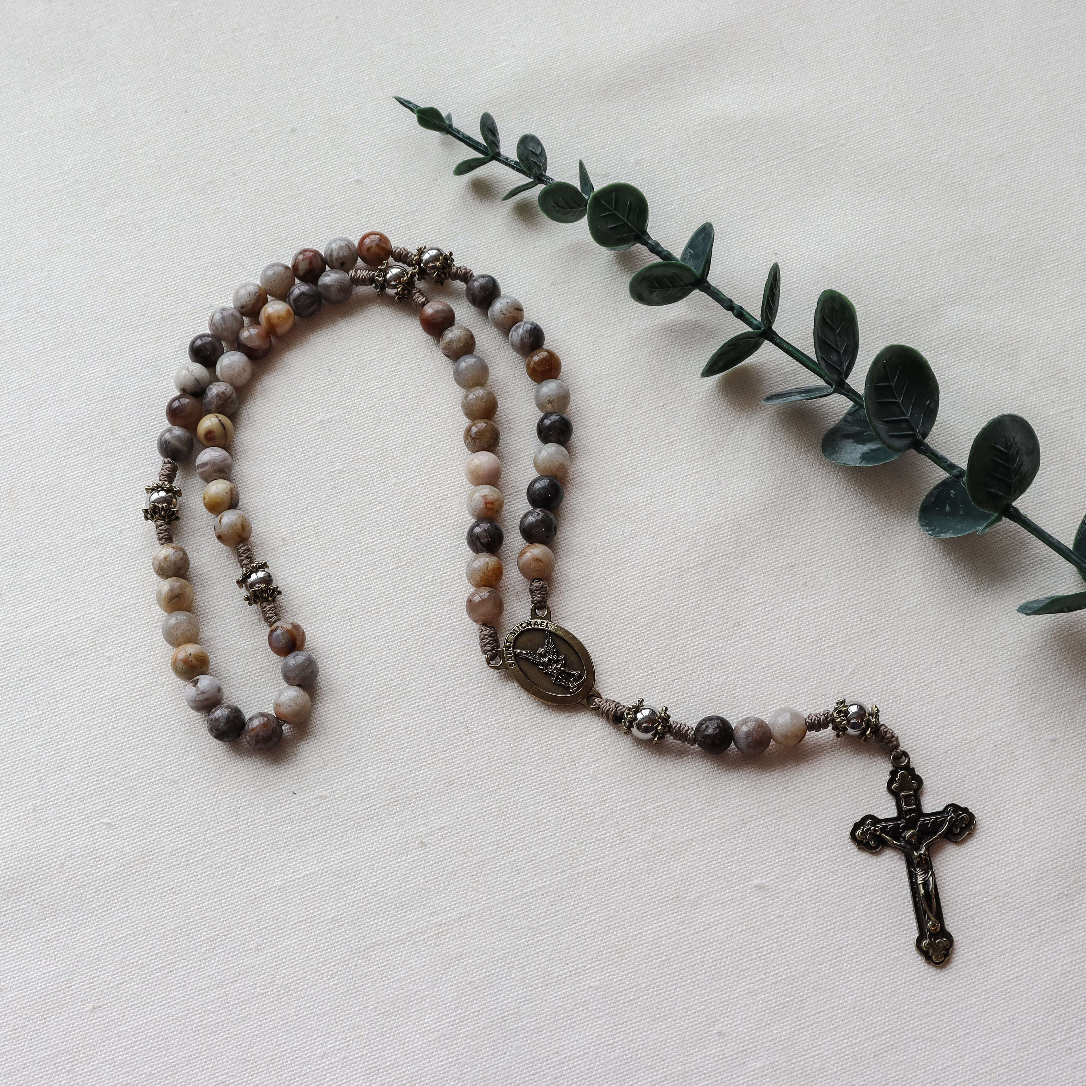 This handmade and carefully crafted rosary features premium 8mm bamboo leaf agate stone beads, 8mm stainless steel our father beads and bronze tone bead caps. We use micro cord paracord which is slim yet strong and durable enough to keep for a lifetime. The bronze many hearts crucifix and Saint Michael center are made in Italy 🇮🇹