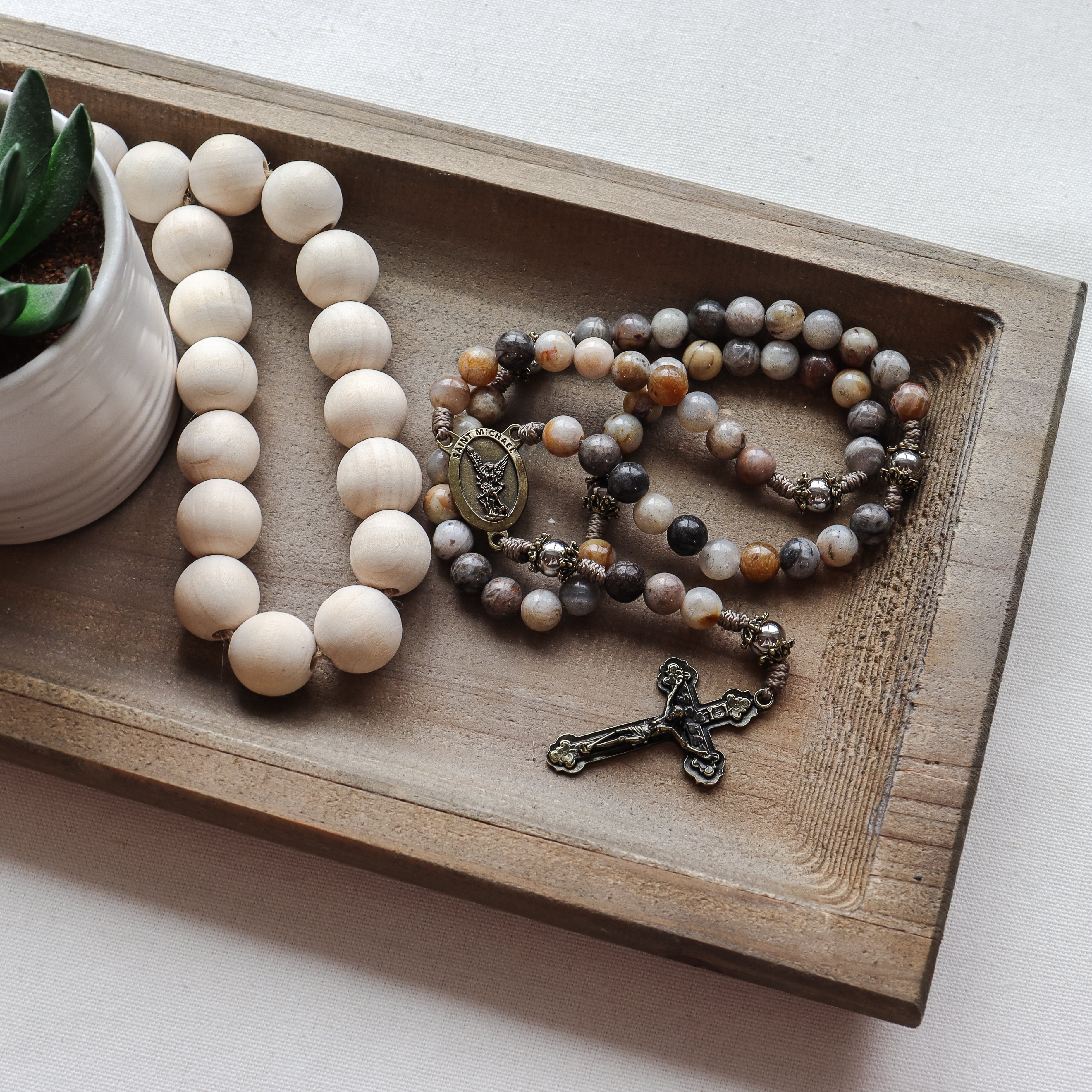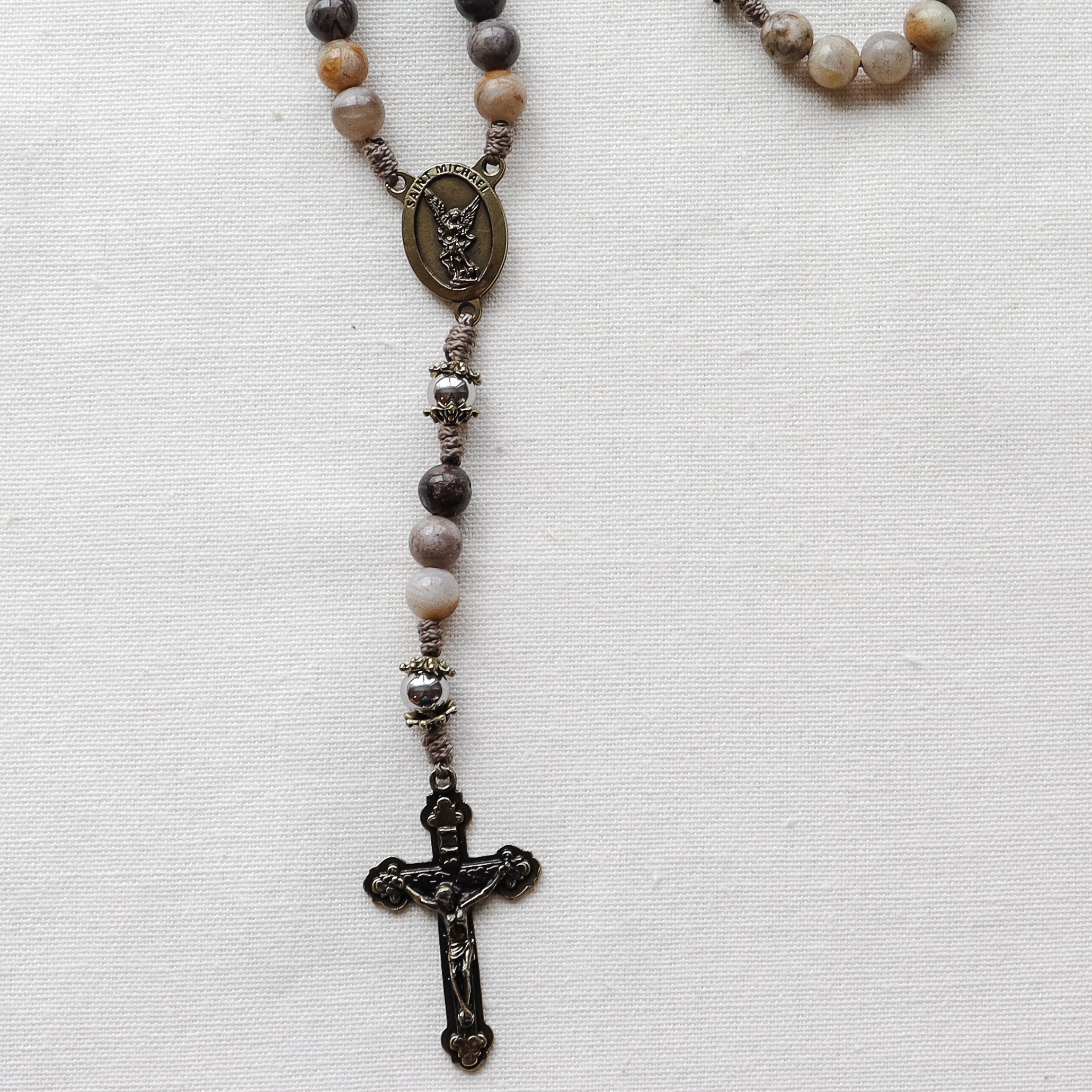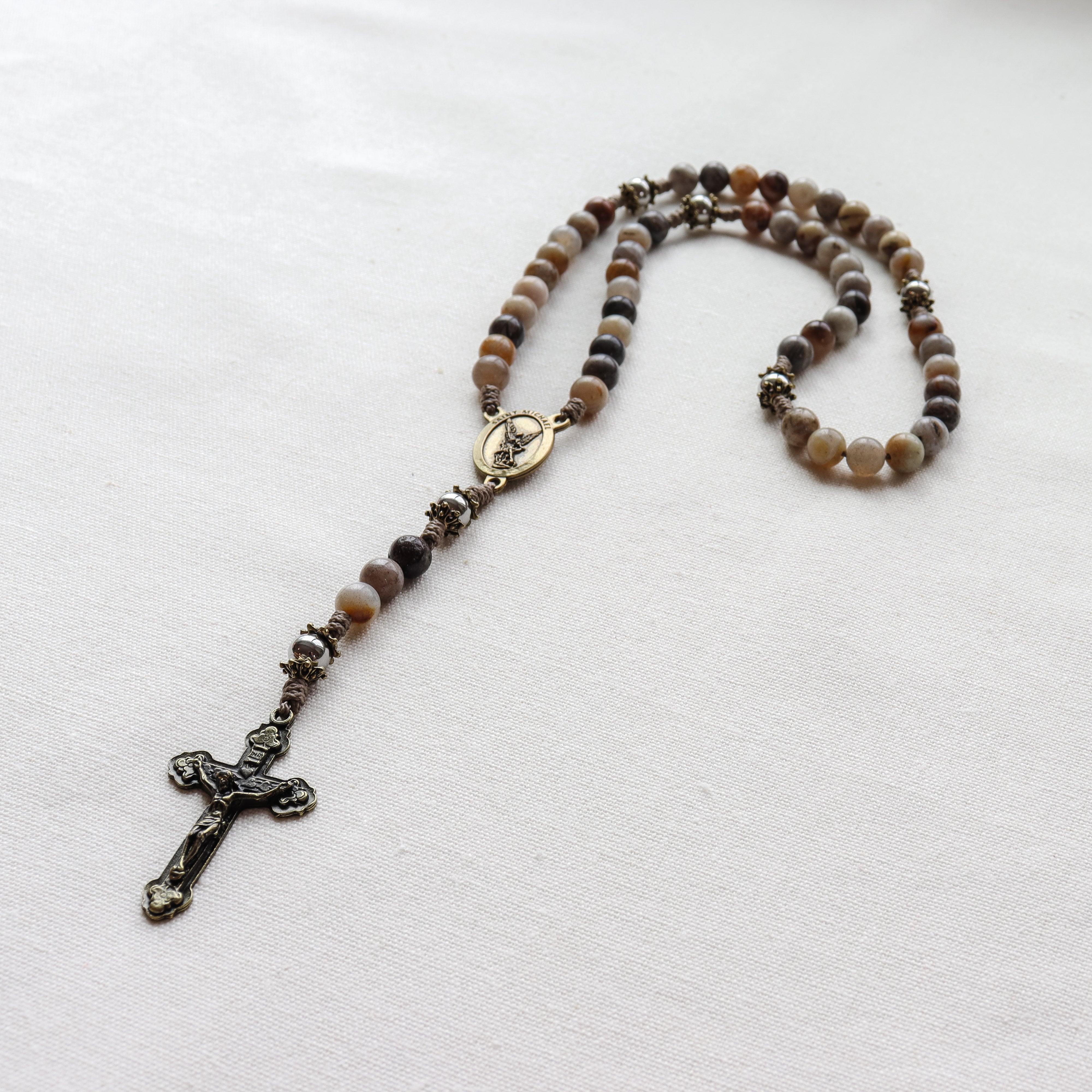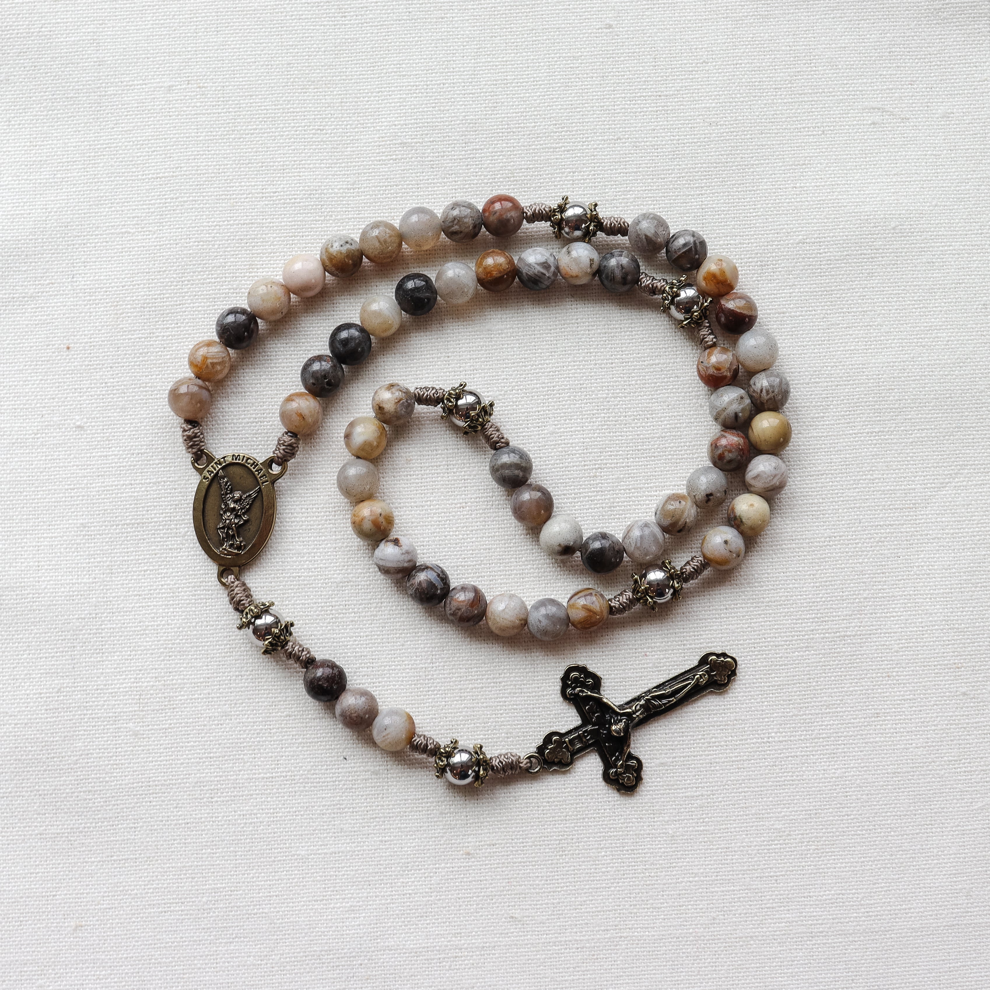 This handmade and carefully crafted rosary features premium 8mm bamboo leaf agate stone beads, 8mm stainless steel our father beads and bronze tone bead caps. We use micro cord paracord which is slim yet strong and durable enough to keep for a lifetime. The bronze many hearts crucifix and Saint Michael center are made in Italy 🇮🇹