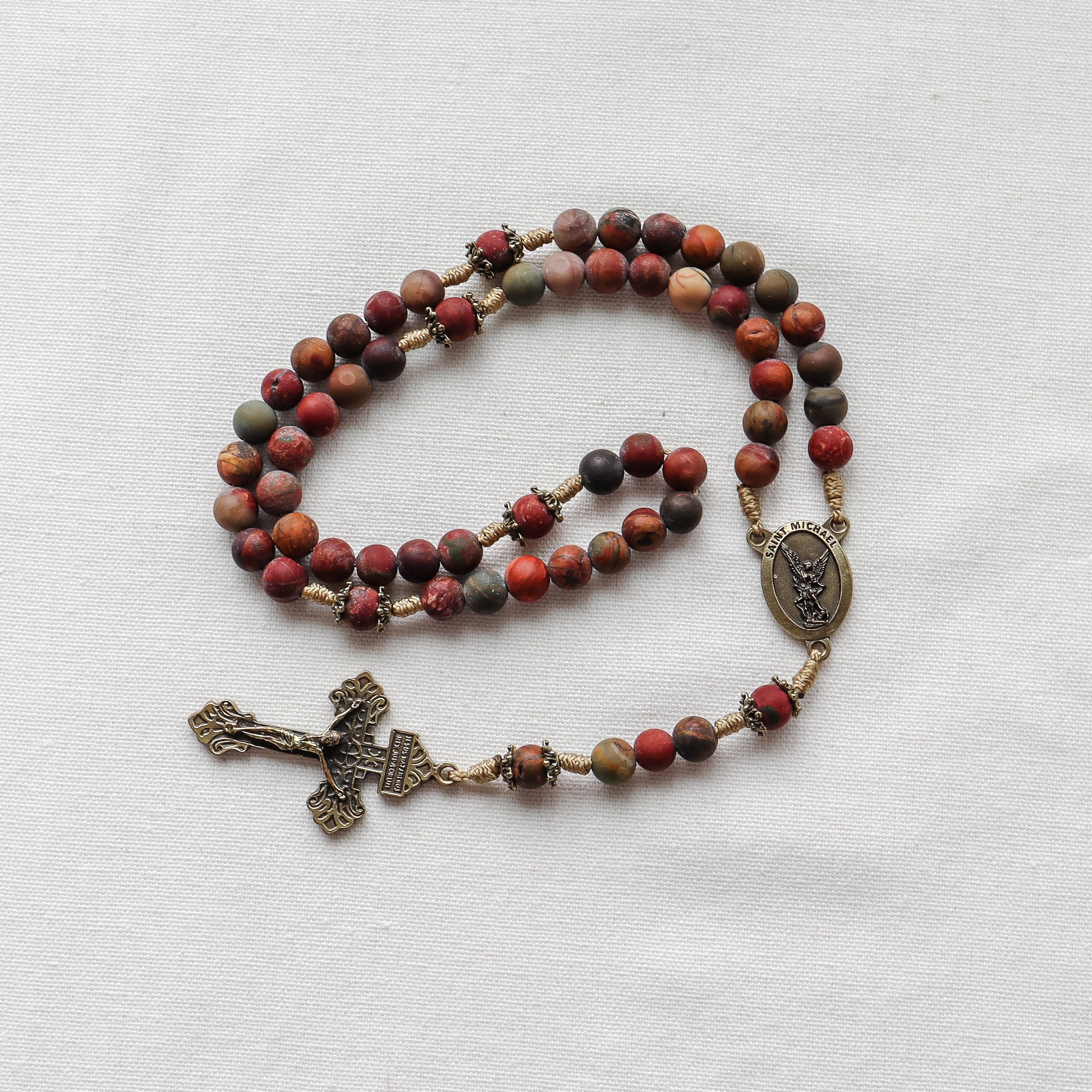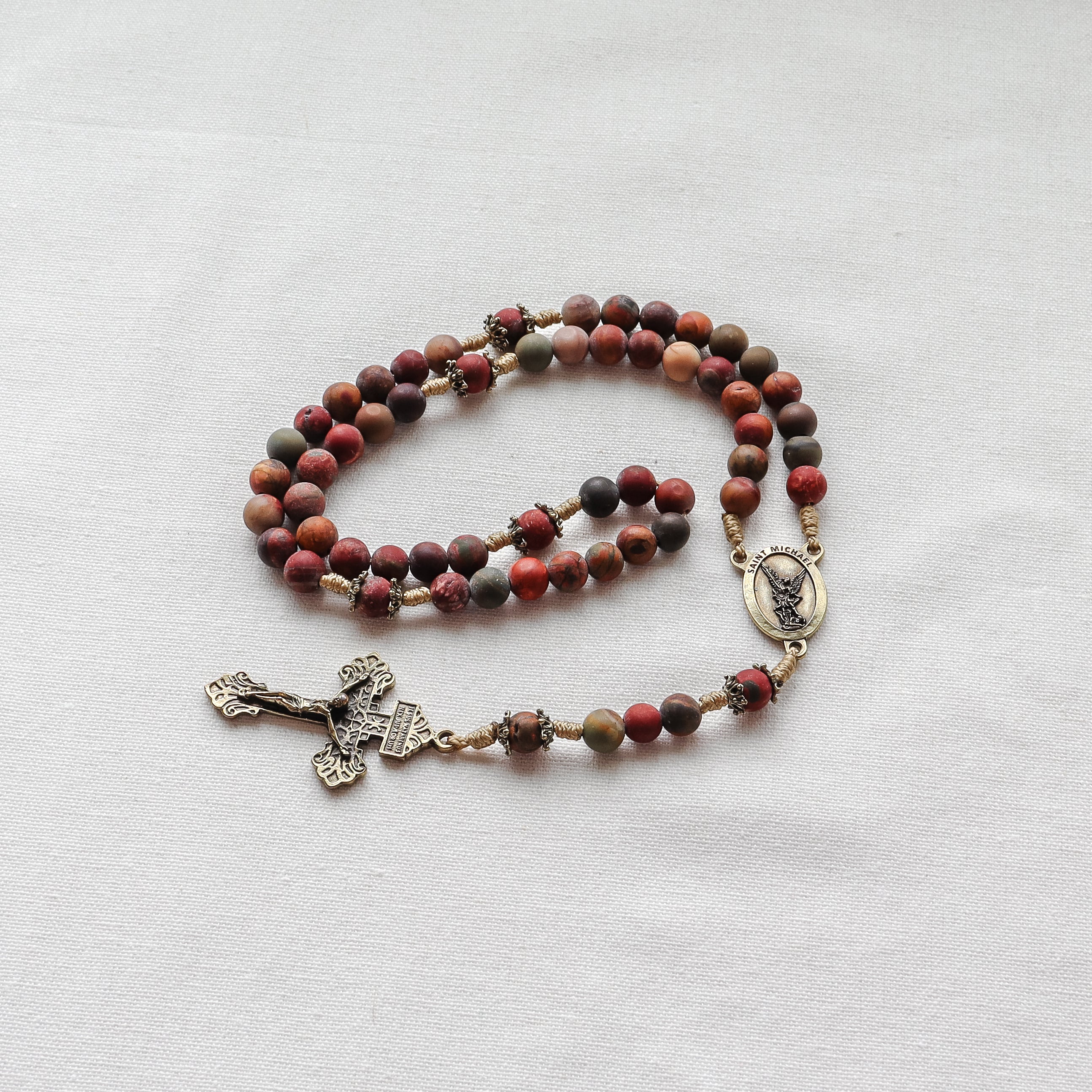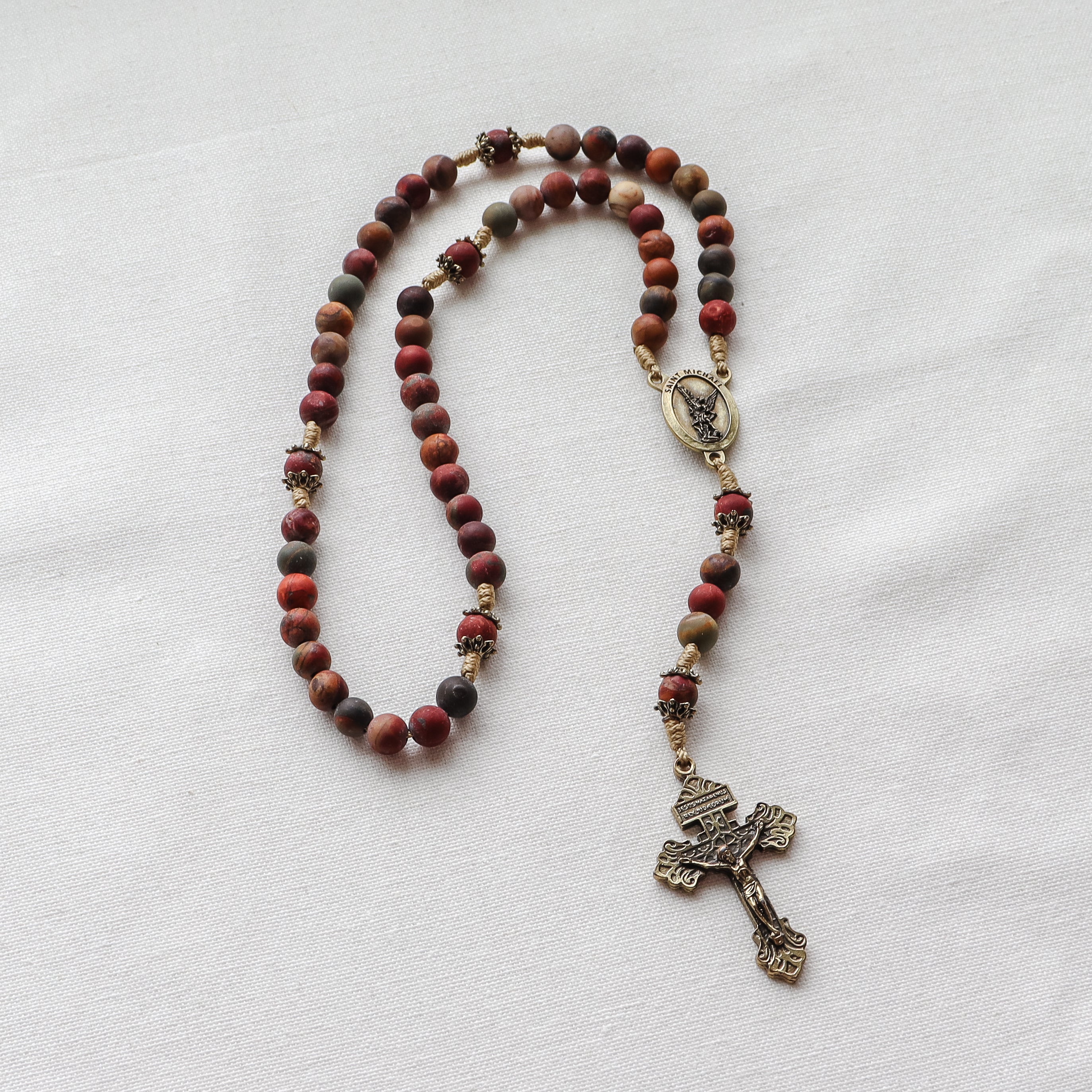This handmade and carefully crafted rosary features premium 8mm red creek jasper stone beads and bronze tone bead caps. We use micro cord paracord which is slim yet strong and durable enough to keep for a lifetime. The bronze Pardon crucifix and Saint Michael center are made in Italy 🇮🇹