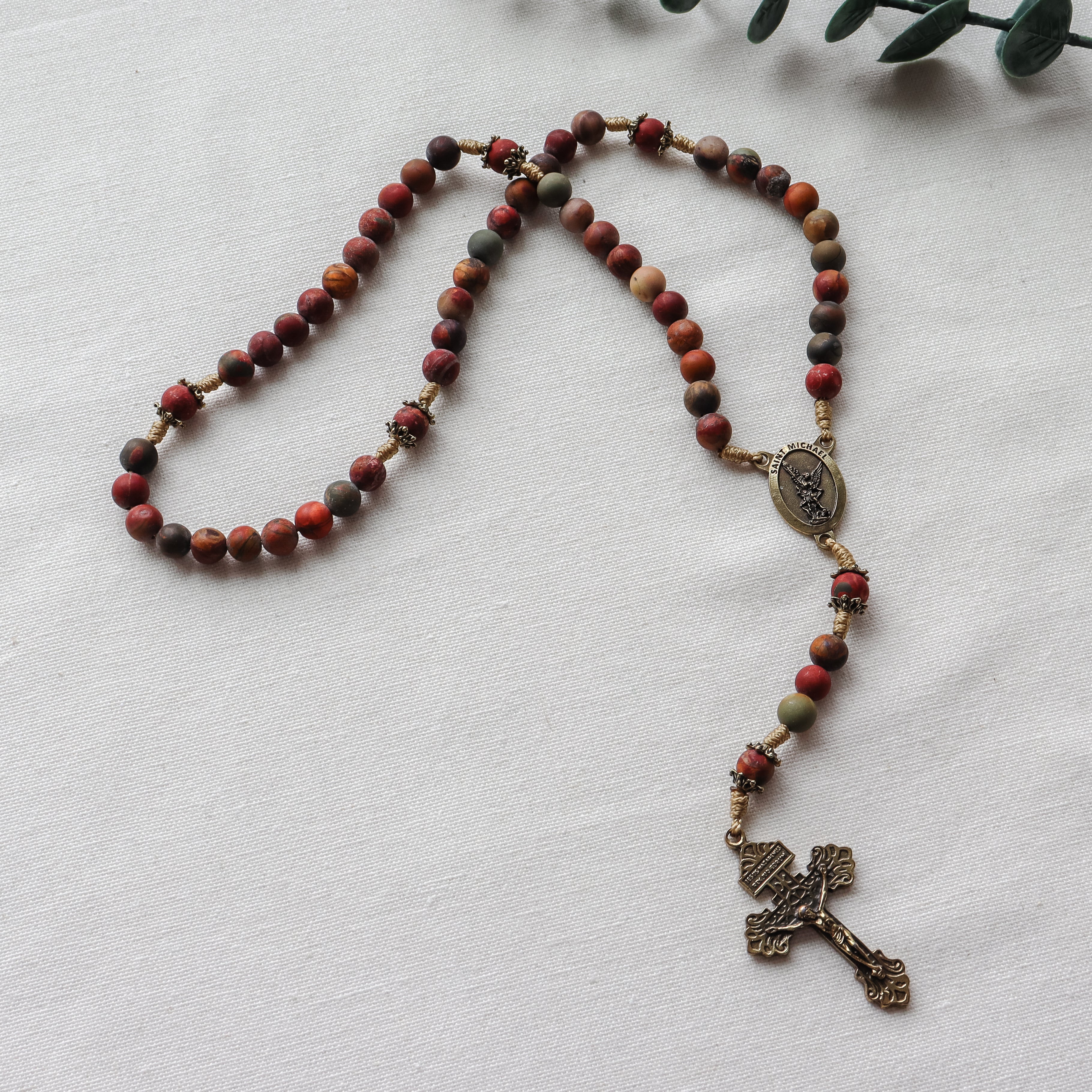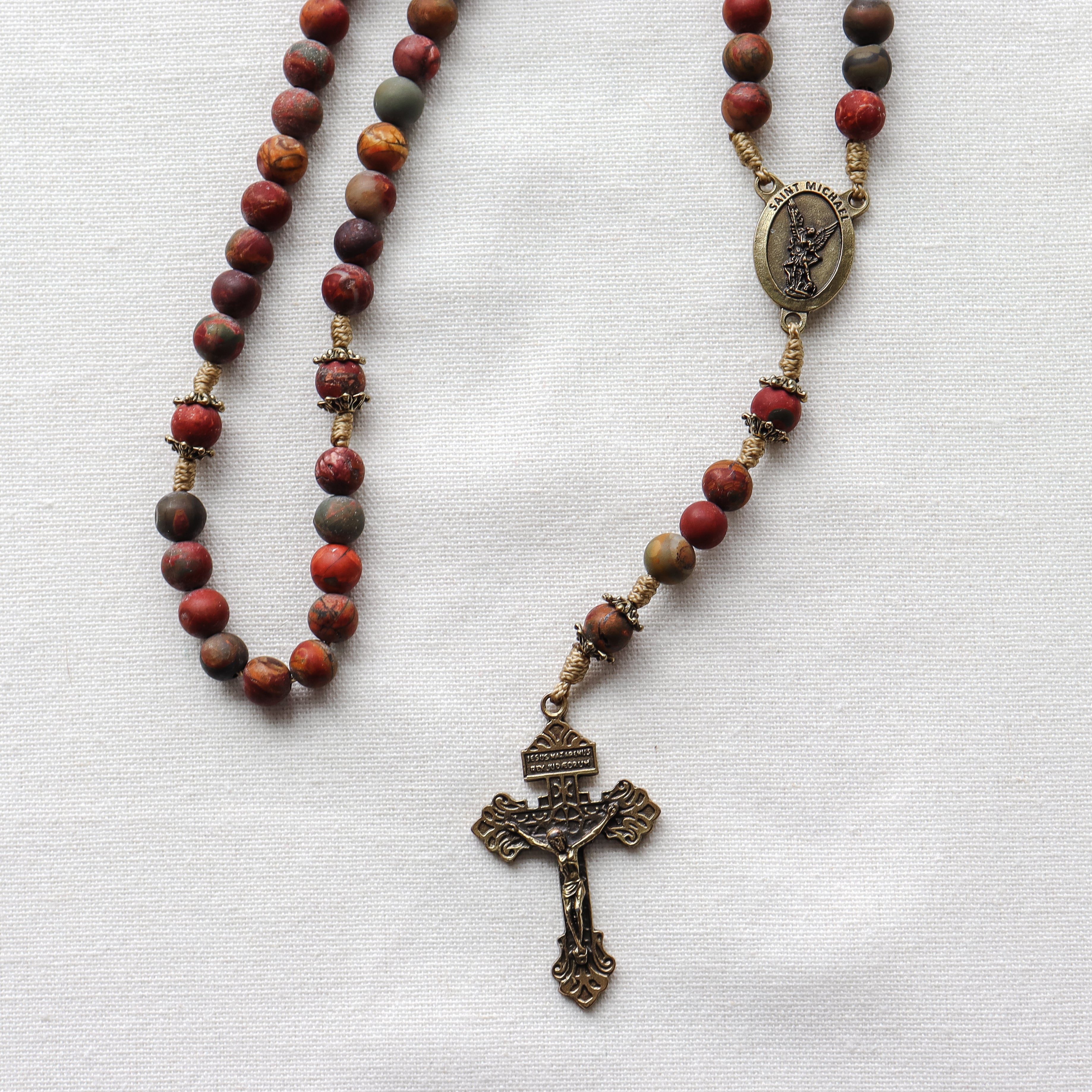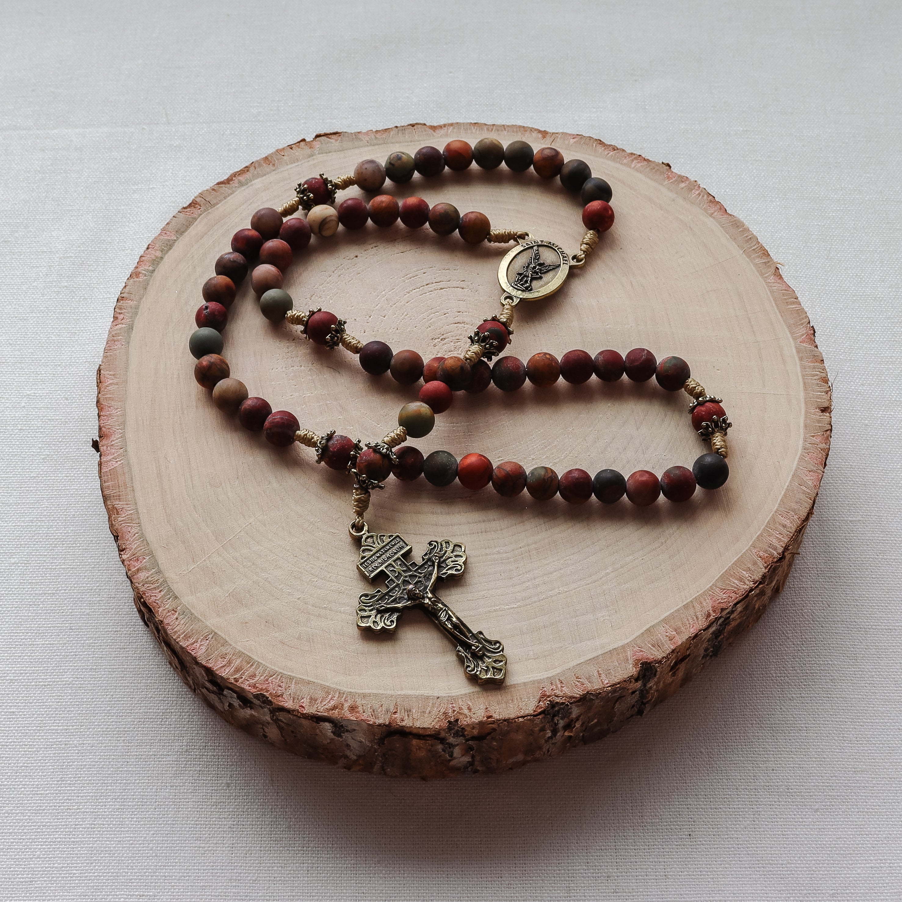 This handmade and carefully crafted rosary features premium 8mm red creek jasper stone beads and bronze tone bead caps. We use micro cord paracord which is slim yet strong and durable enough to keep for a lifetime. The bronze Pardon crucifix and Saint Michael center are made in Italy 🇮🇹