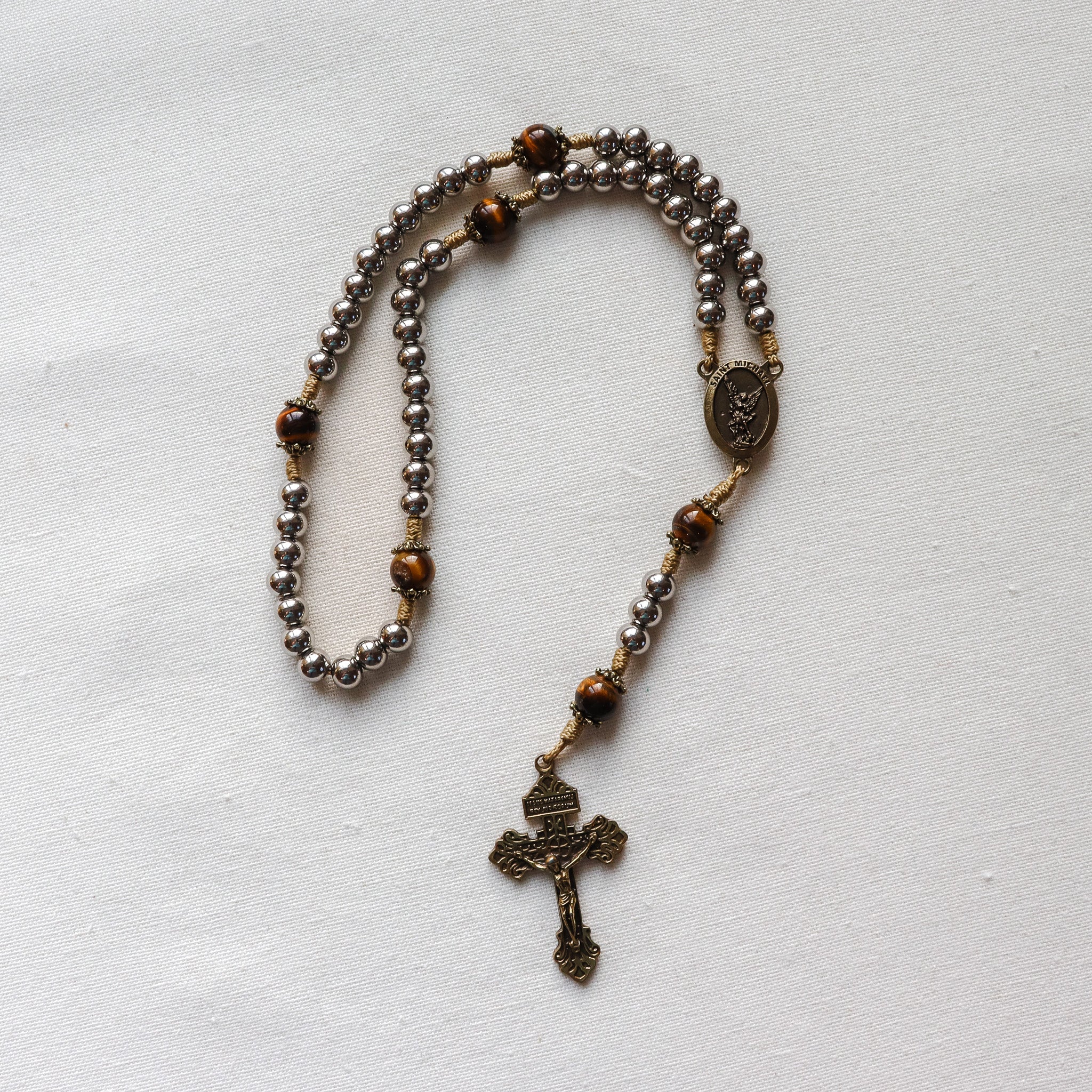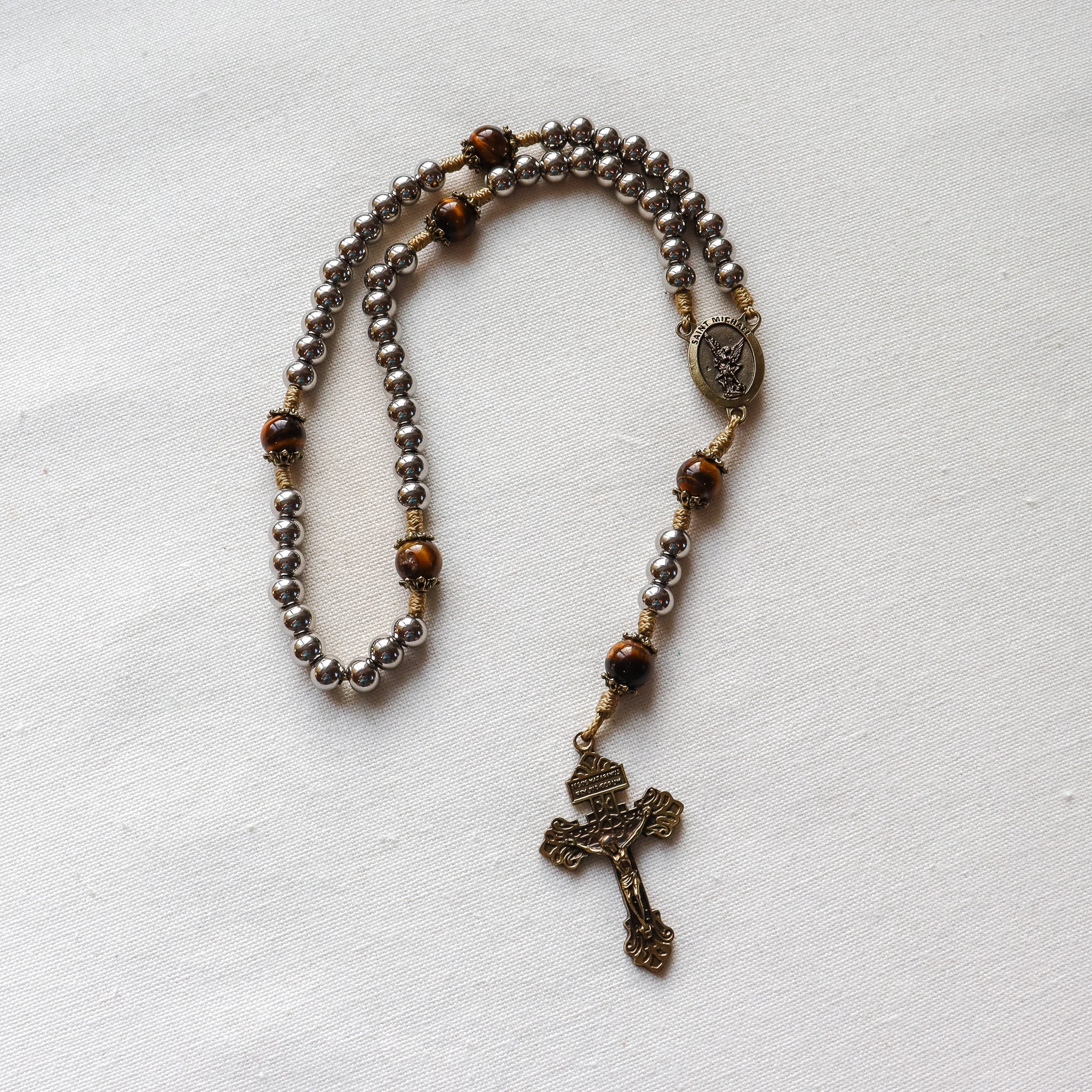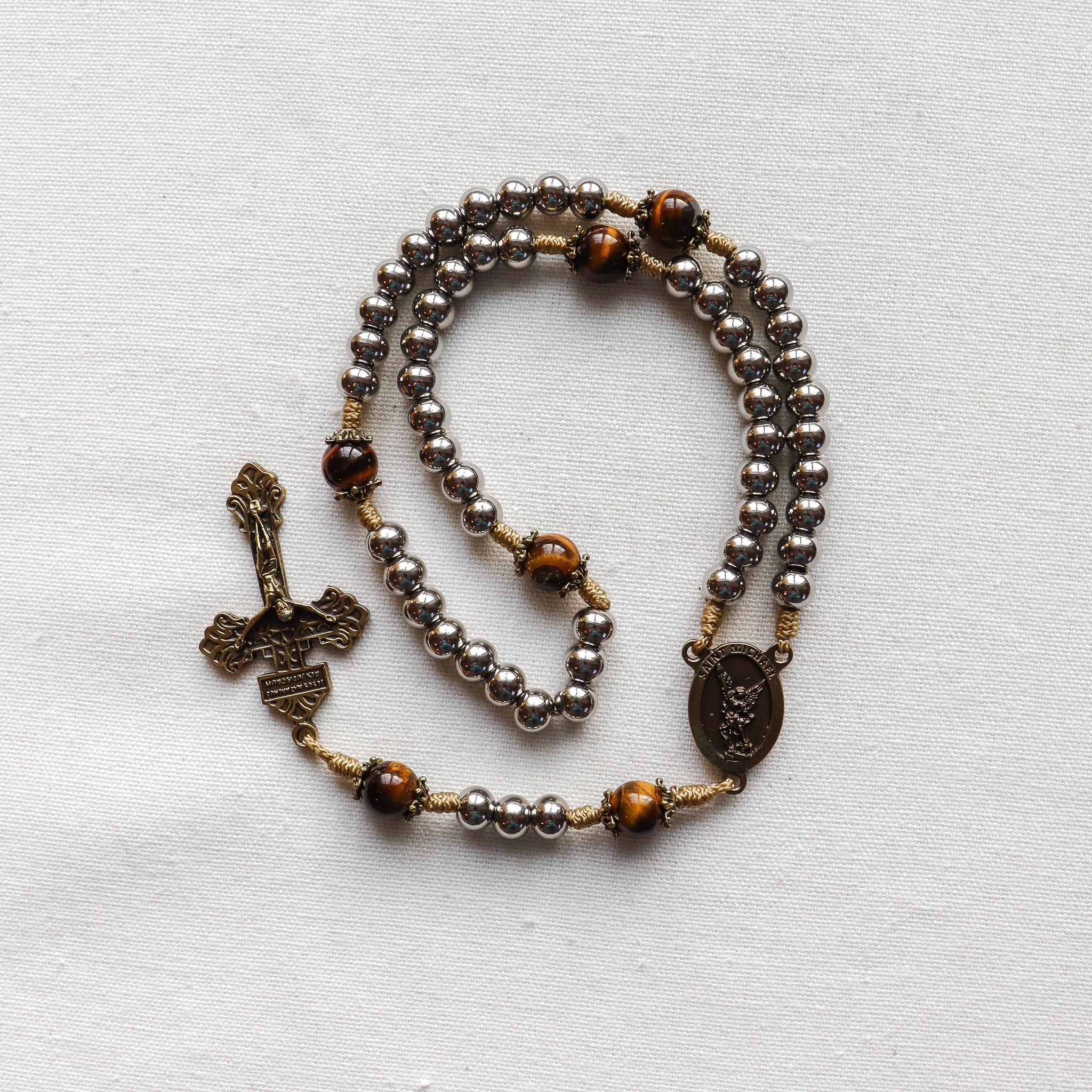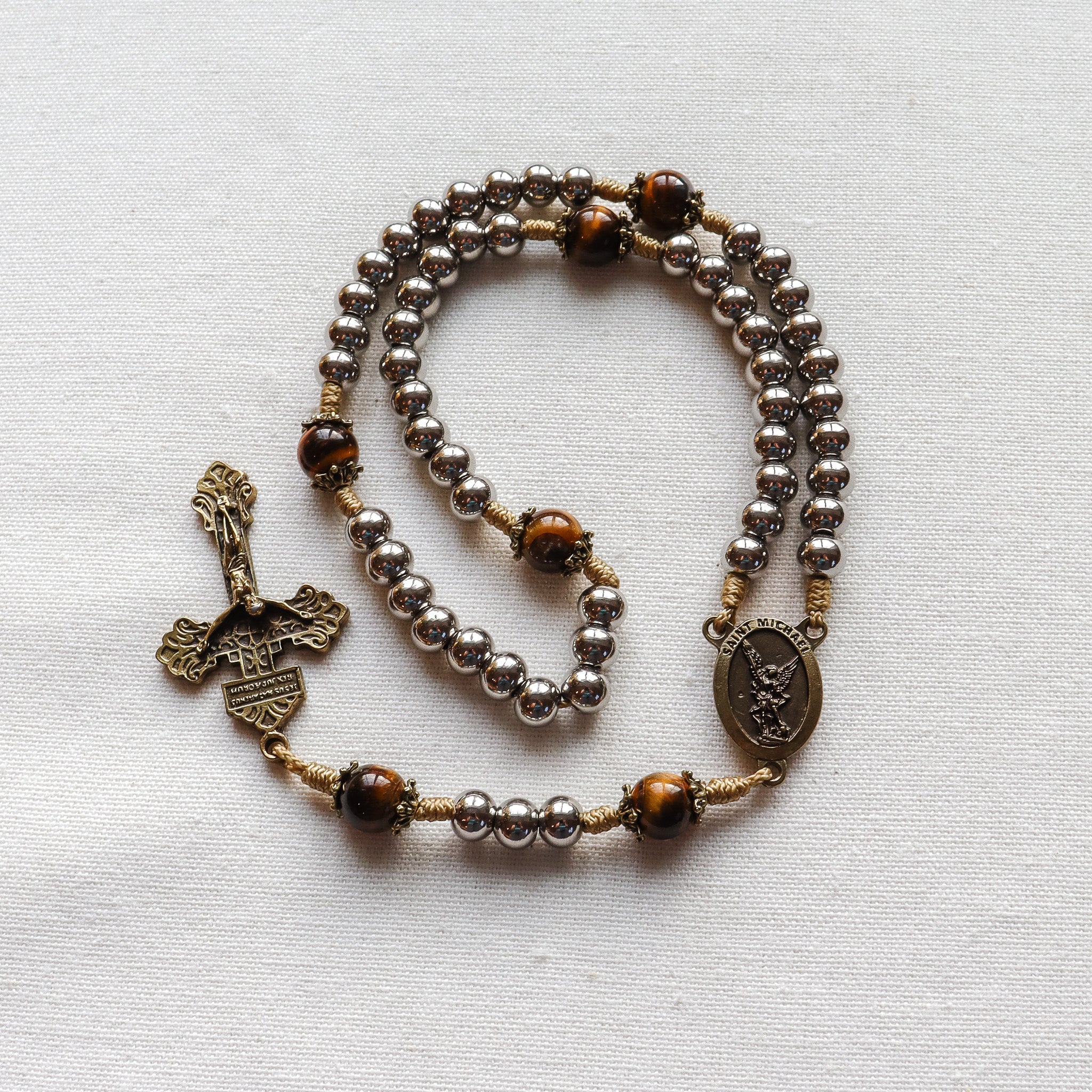 This handmade and carefully crafted rosary features premium 8mm 304 stainless steel decade beads, 10mm tiger eye Our Father beads, and bronze tone bead caps. We use micro cord paracord which is slim yet strong and durable enough to keep for a lifetime. This rosary has enough weight to feel good in the hands yet folds up to a very small size to fit in pockets. The bronze Pardon crucifix and Saint Michael center are made in Italy 🇮🇹