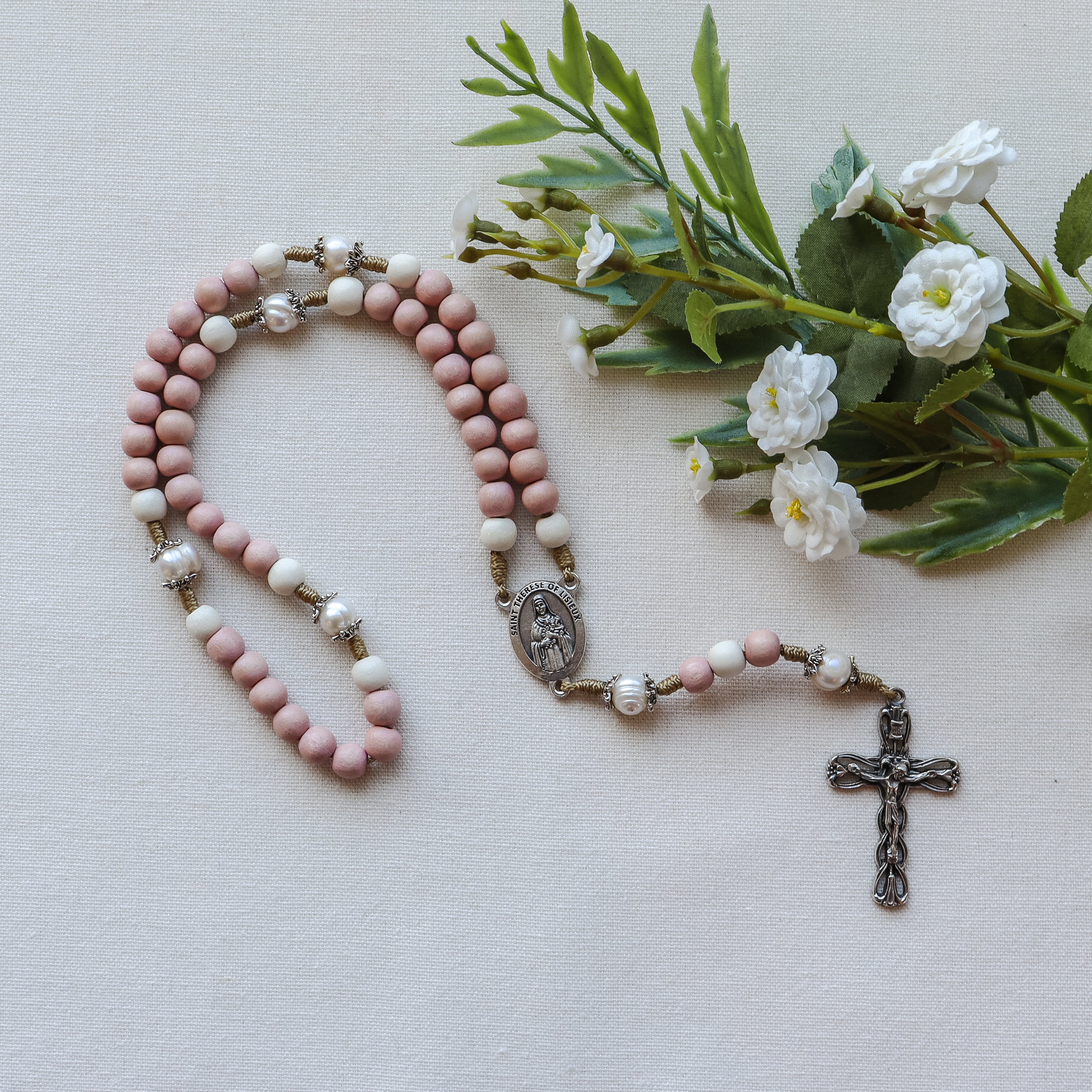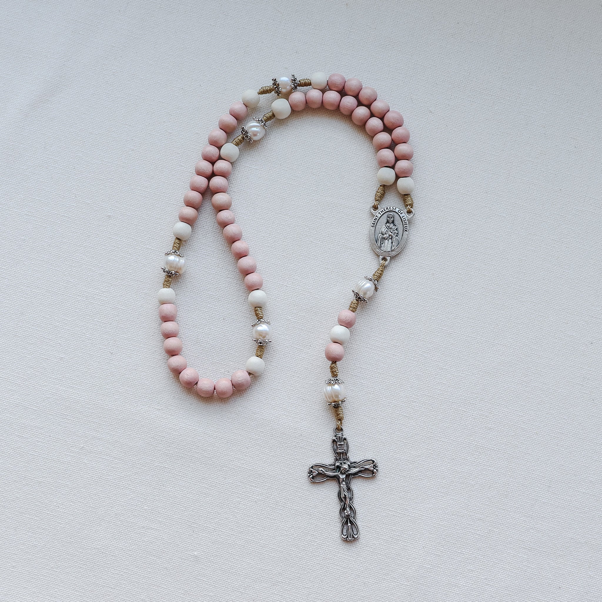 A soft, elegant rosary handmade for daily prayer, featuring pink and white wood beads with genuine freshwater pearl accents. Finished with a Saint Thérèse of Lisieux centerpiece and crucifix made in Italy, it’s beautiful for gifting and strong enough to keep for years.