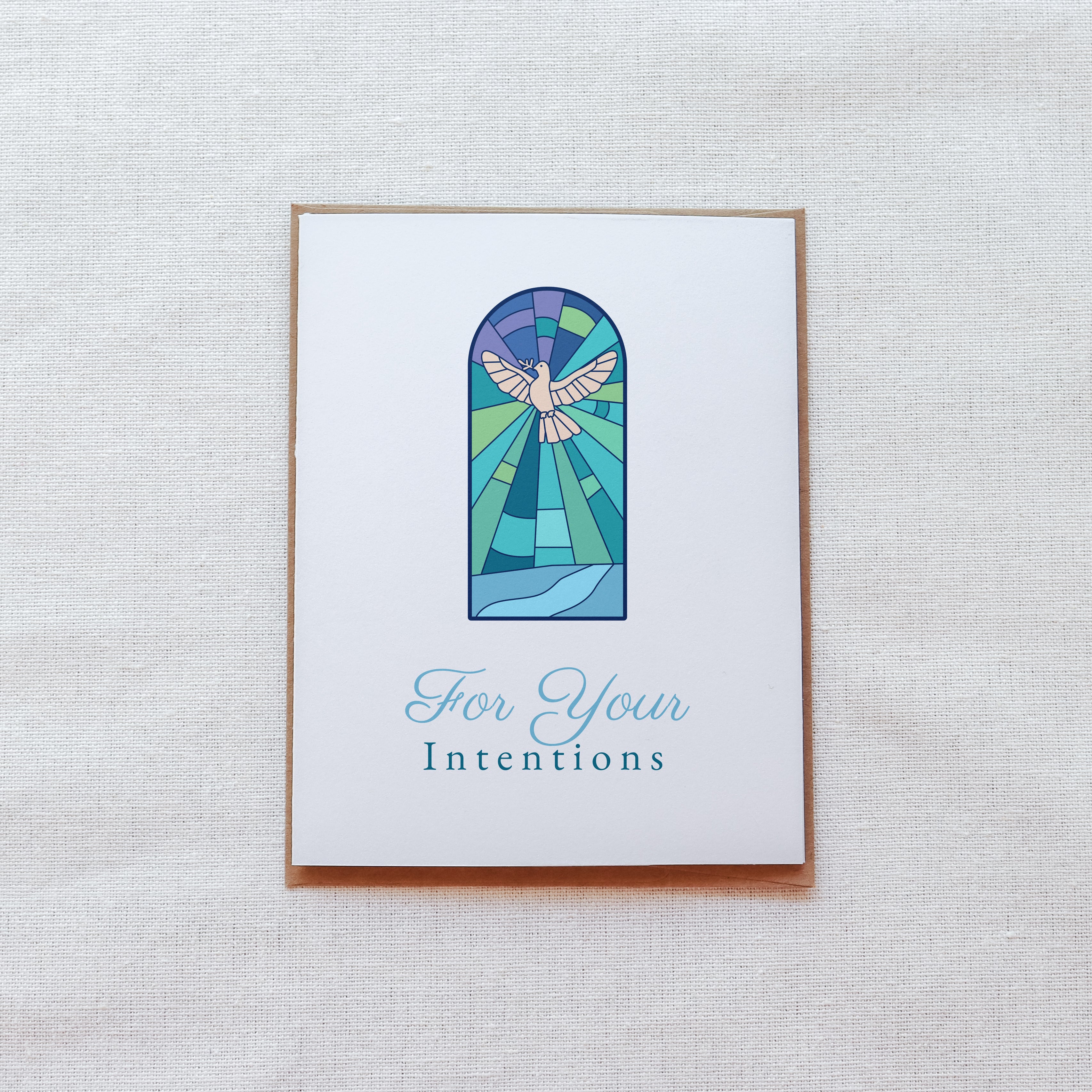 Whether you’re offering a Mass for peace, healing, or thanksgiving, this card is a reverent way to share your prayerful support. The stained glass imagery evokes the beauty of sacred spaces and the presence of the Holy Spirit in every intention.