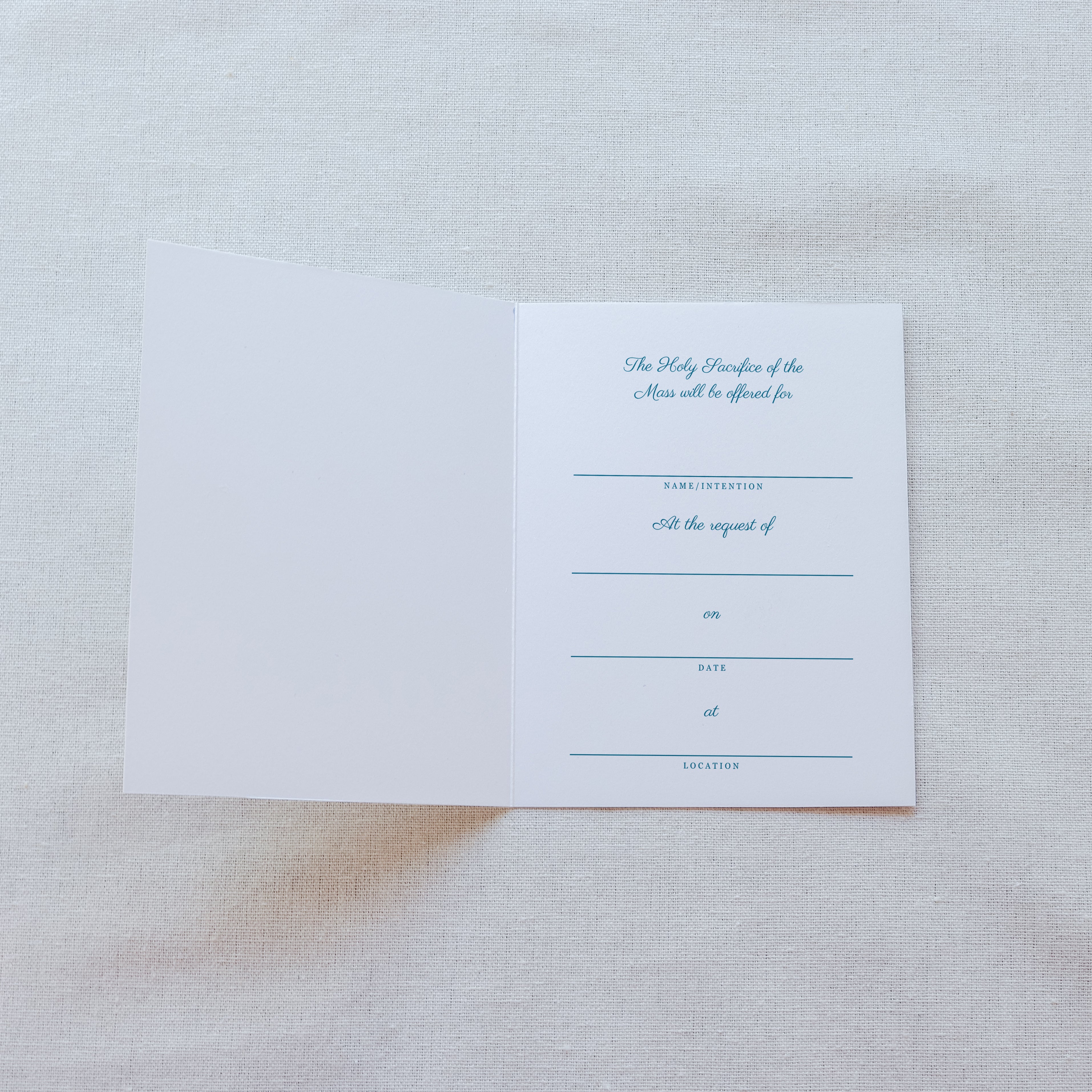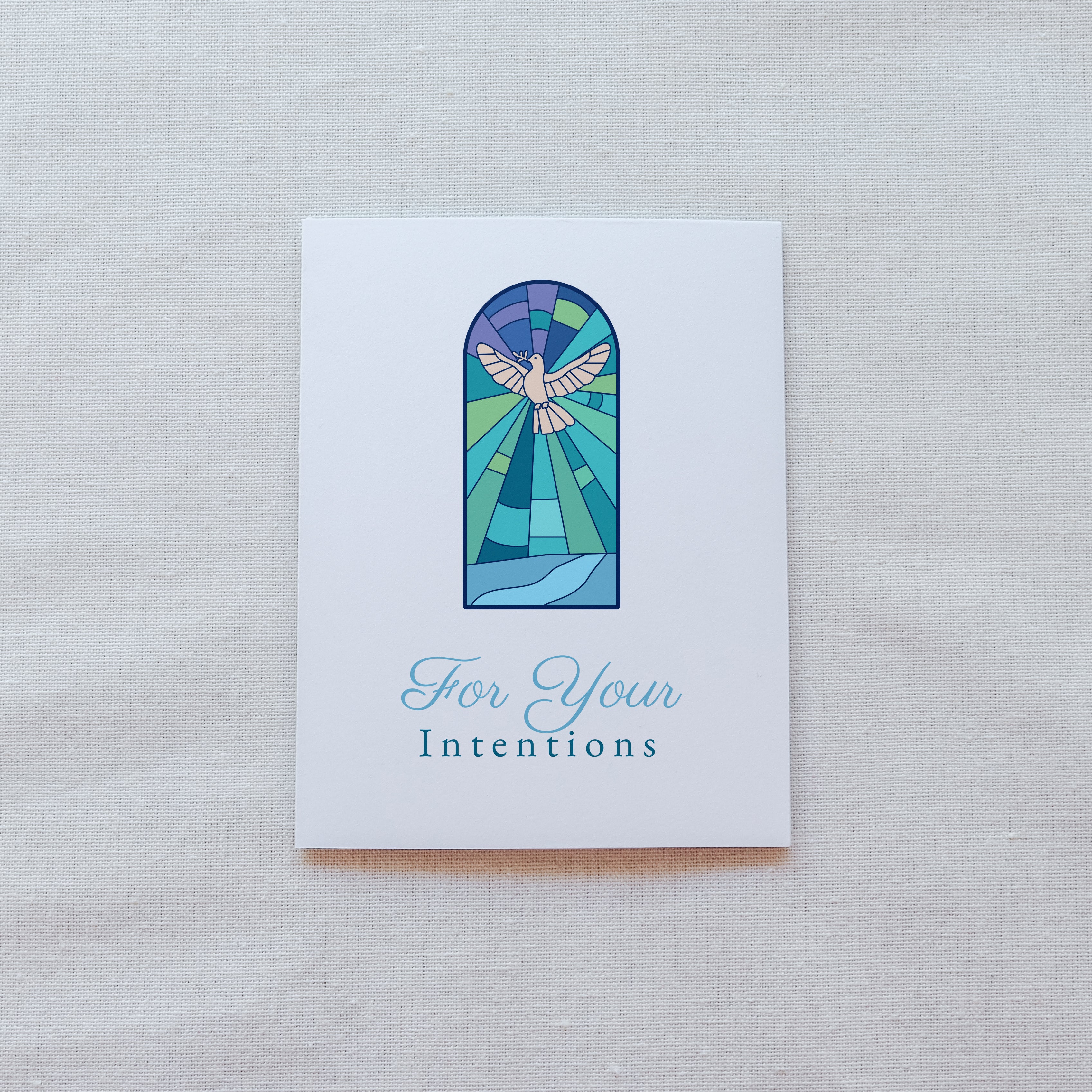 Offer prayers in a meaningful way with this striking Mass intention card, featuring a blue stained glass window design and the Holy Spirit in the form of a dove. Includes artwork and a space to write your Mass intention inside.