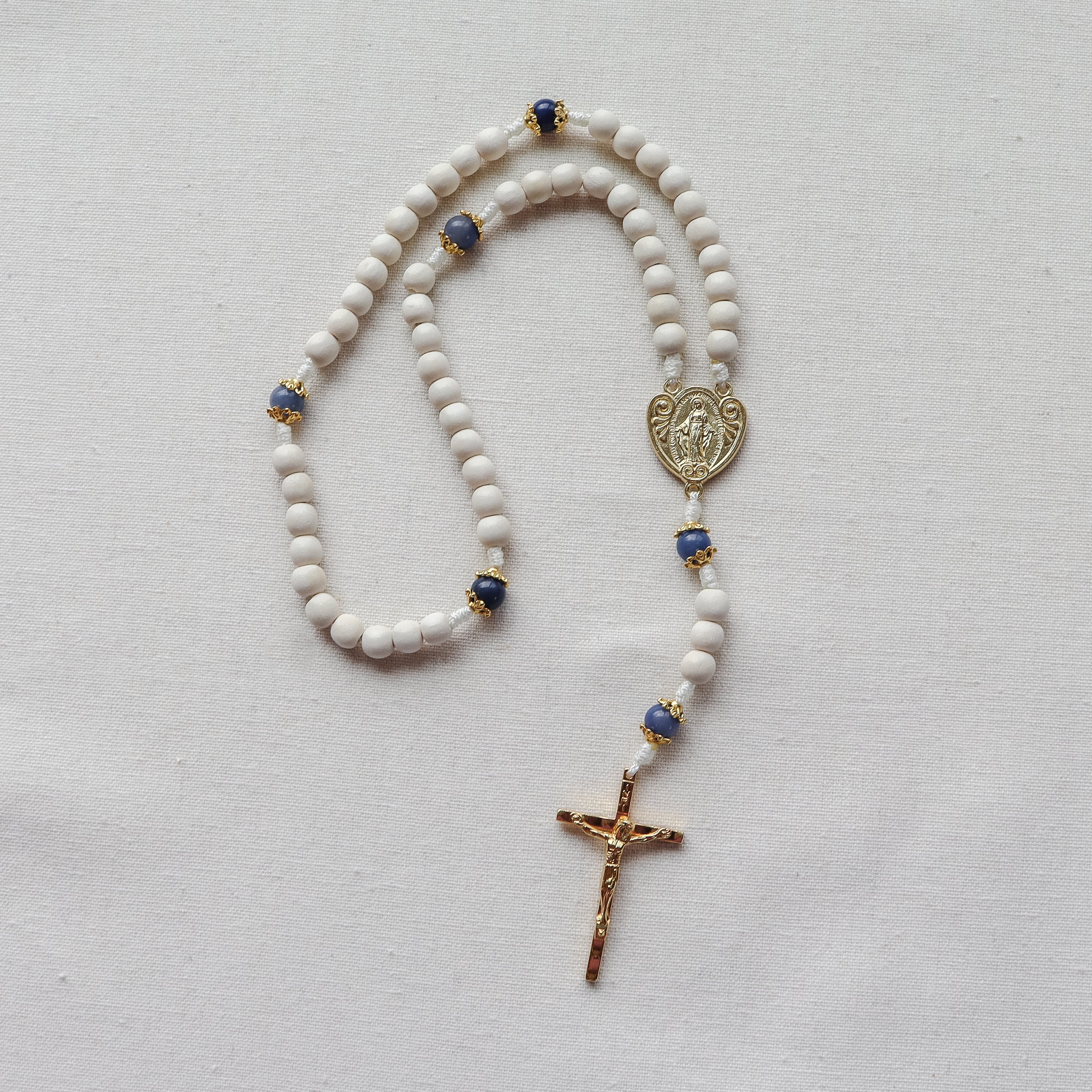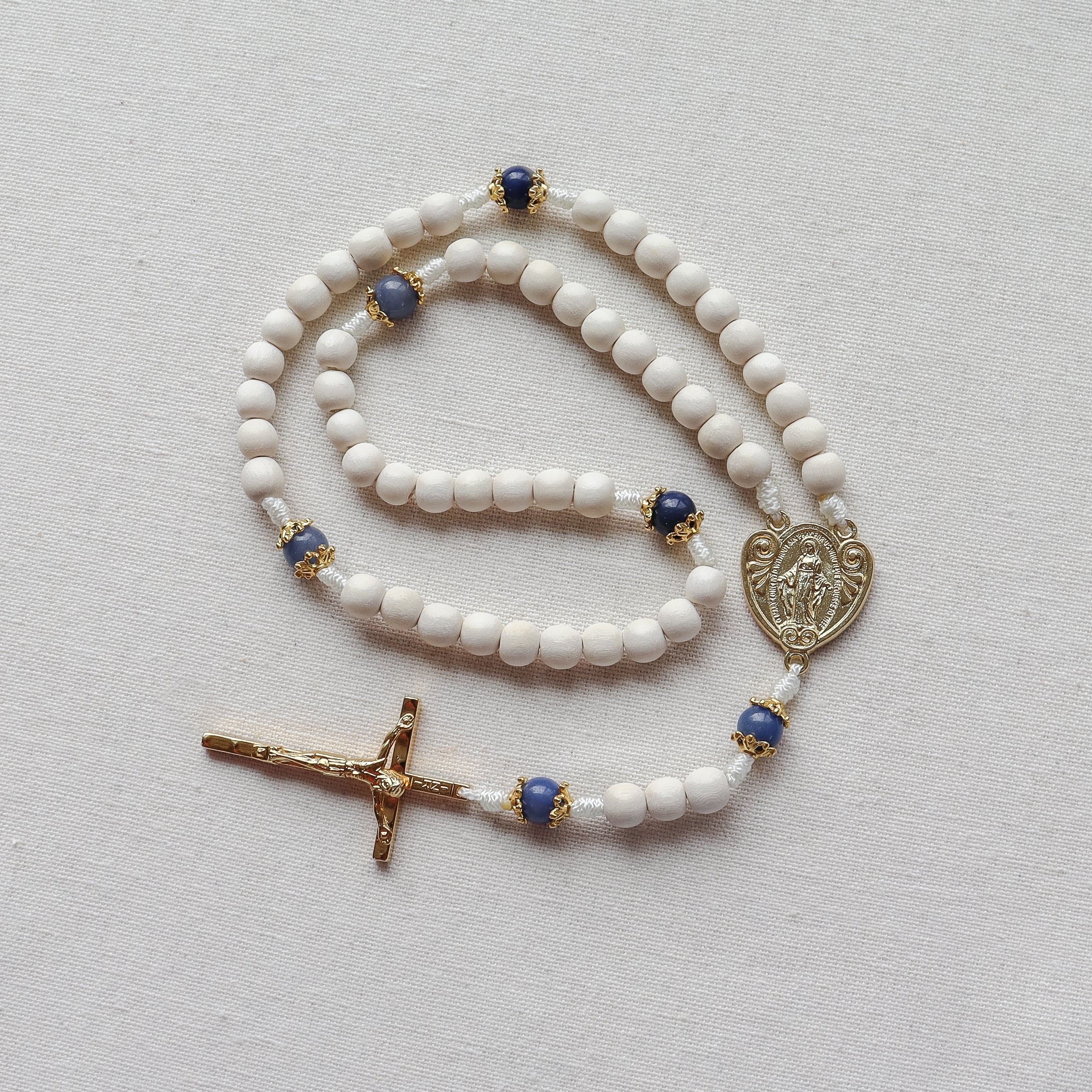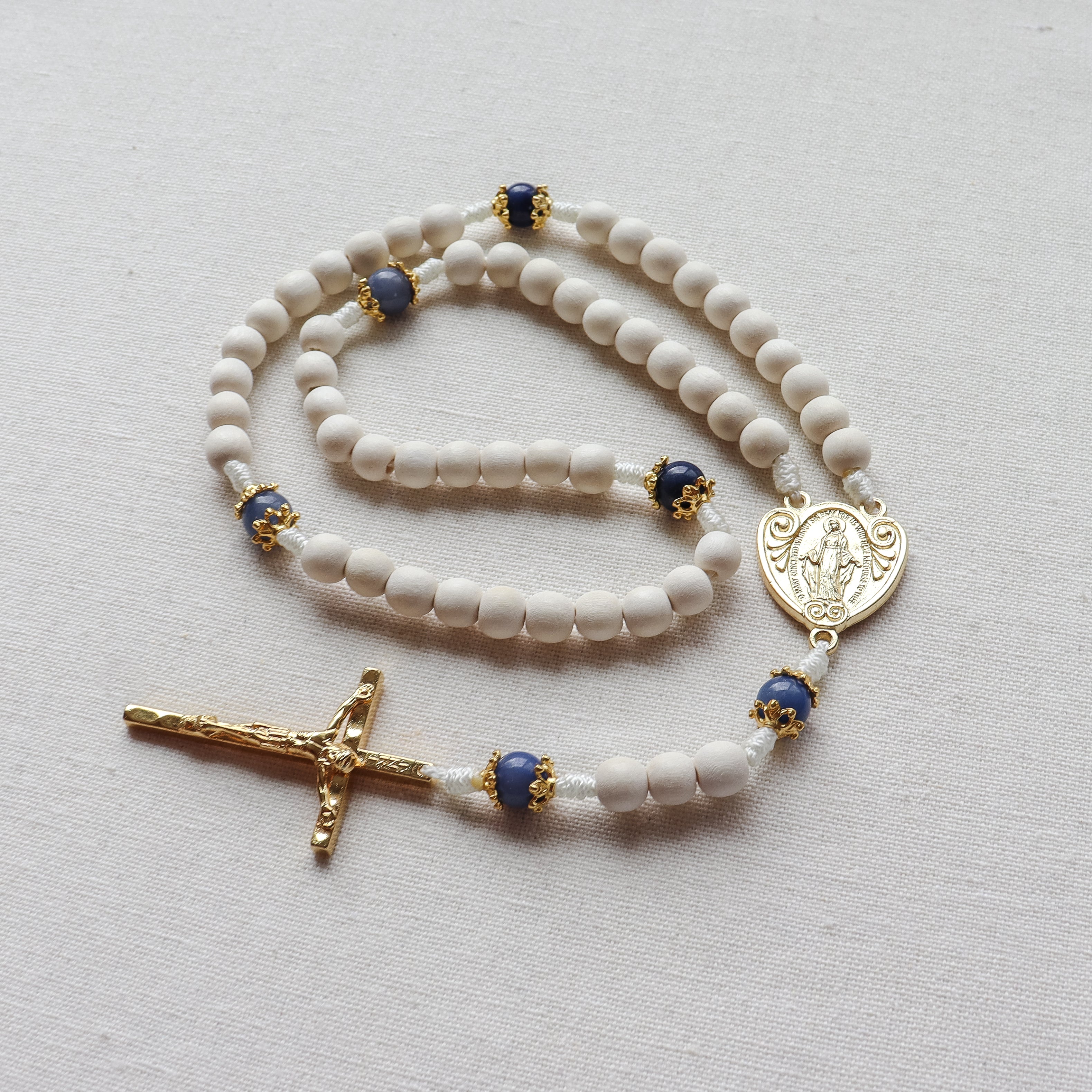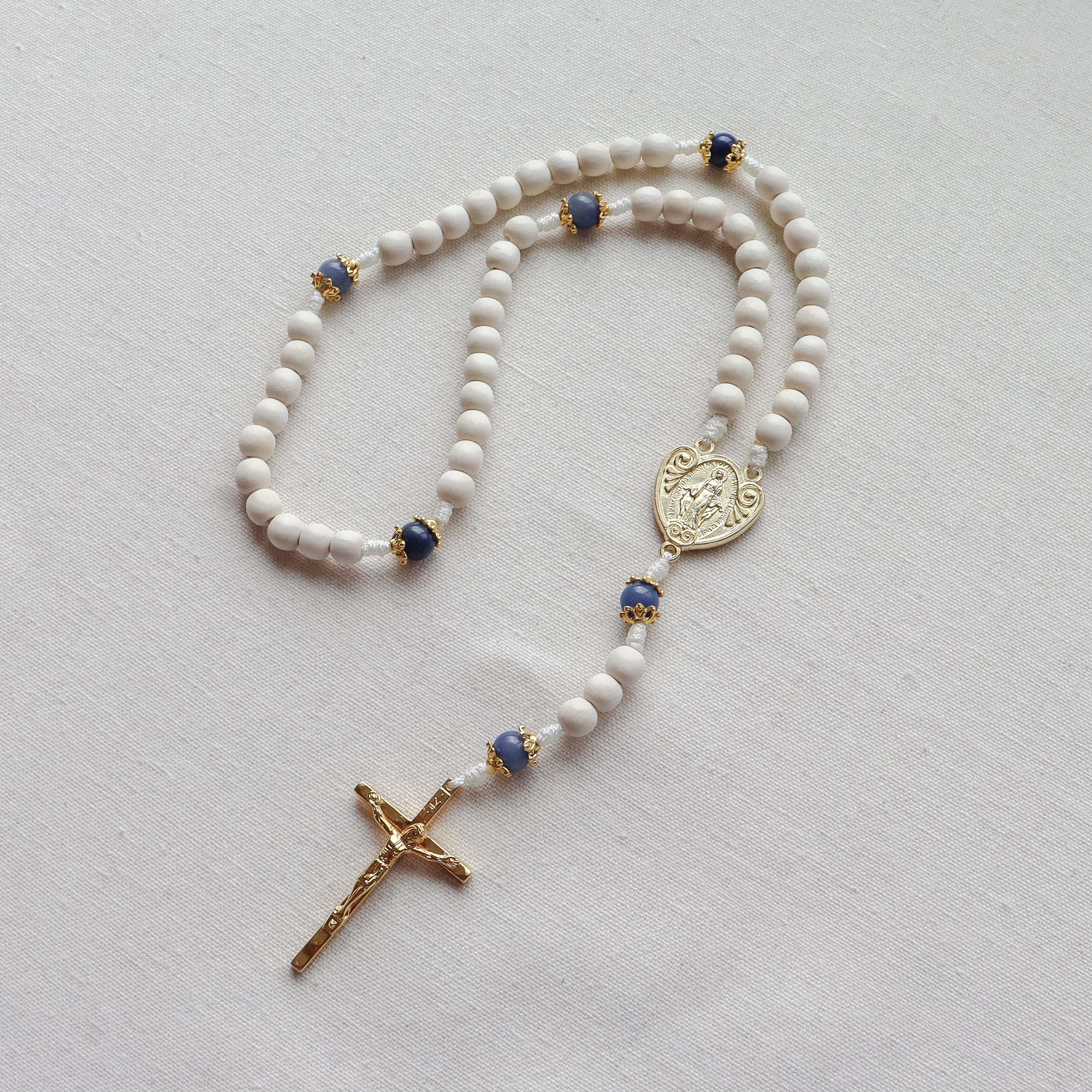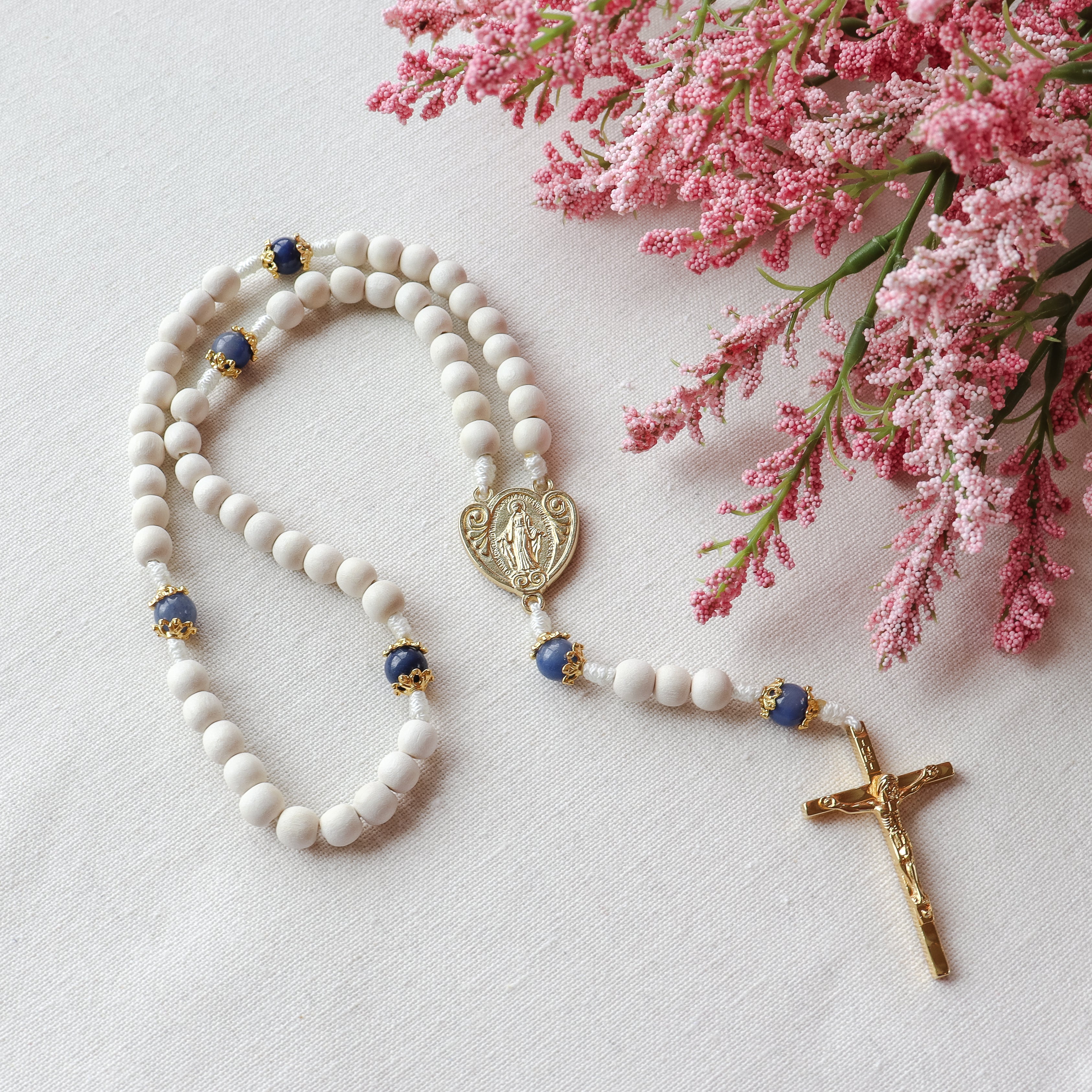A bright, Marian-inspired rosary handmade to support your daily prayer life, featuring crisp white wood beads and blue aventurine gemstones. Finished with a Miraculous Medal centerpiece and hammered gold-tone crucifix made in Italy, it’s beautiful enough to gift and strong enough to last through years of devotion.