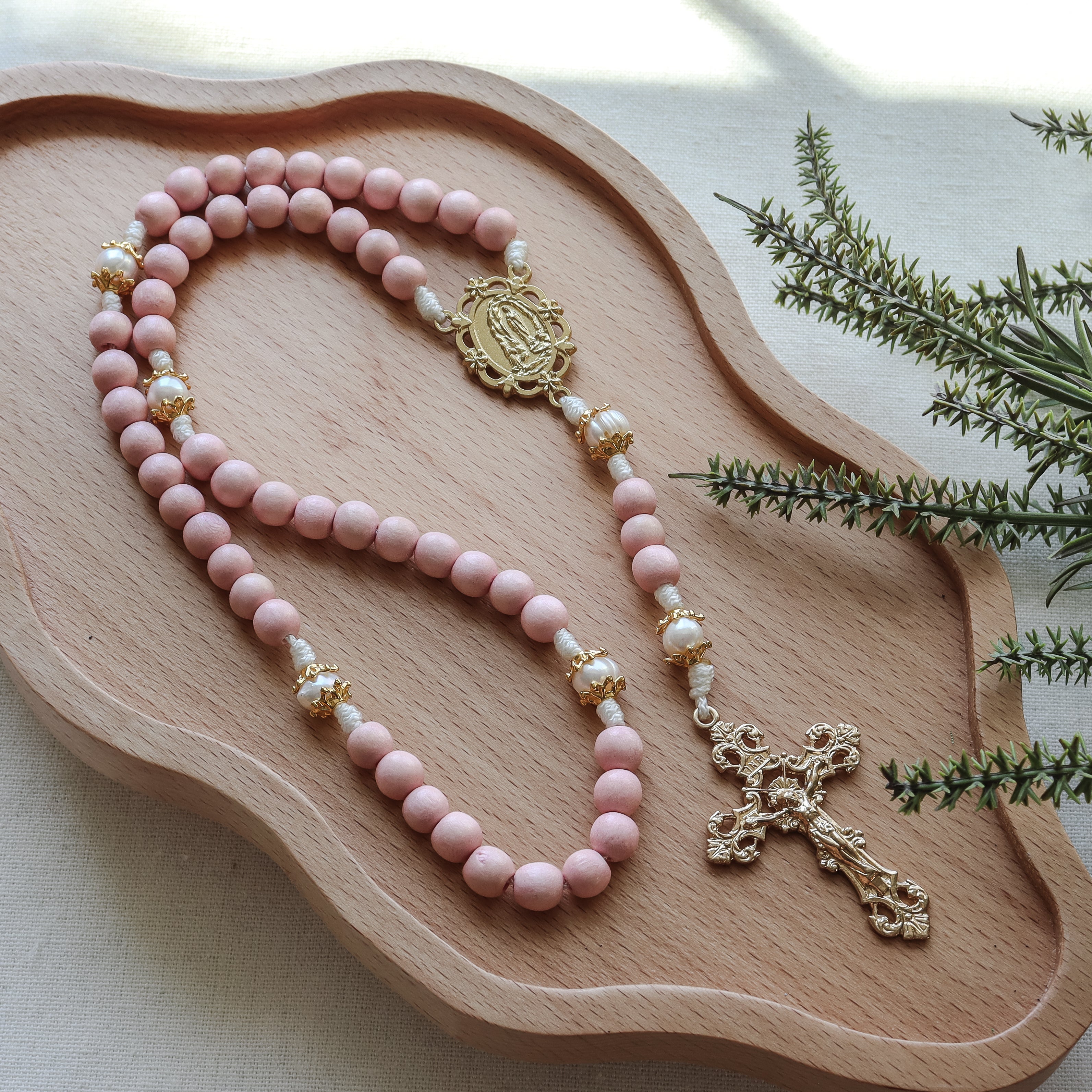This rosary is handmade for women who desire a prayer tool that feels meaningful and enduring. The gentle pink wood beads move easily through your fingers, while the freshwater pearls add a quiet beauty that makes each prayer feel intentional. Strong and thoughtfully designed, it’s made to accompany you through both joyful and challenging seasons of faith.
