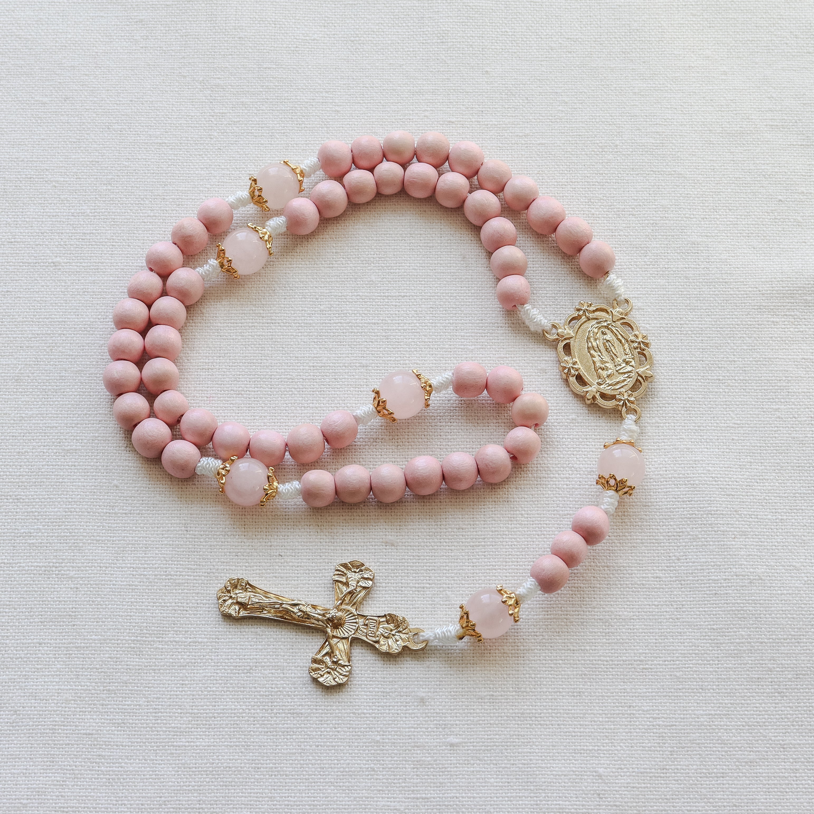 This rosary is perfect for women who want their daily prayers to feel peaceful and personal. The pink waxed wood beads are light in the hand, while the rose quartz Our Father beads bring a touch of grounding elegance to each decade. The strong paracord provides long-lasting support so you can keep returning to this rosary again and again.
