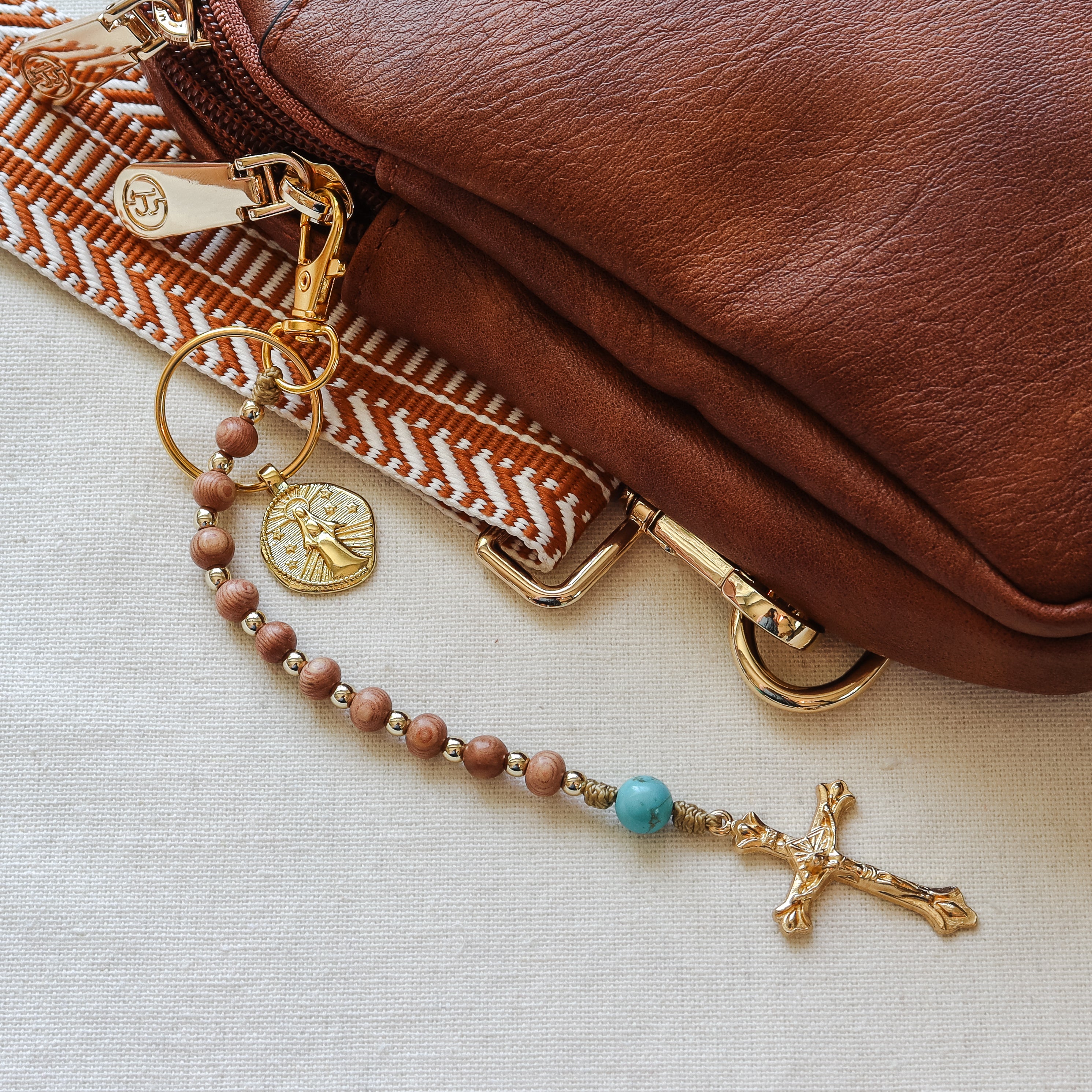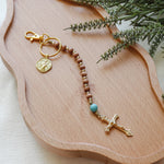 This decade rosary keychain is made for anyone who wants a prayer tool always within reach. The smooth rosewood Hail Mary beads feel natural and warm in your hands, while the turquoise Our Father bead adds a calming pop of color. Finished with a gold-tone Marian charm and an Italian-made crucifix, it’s both practical and meaningful.