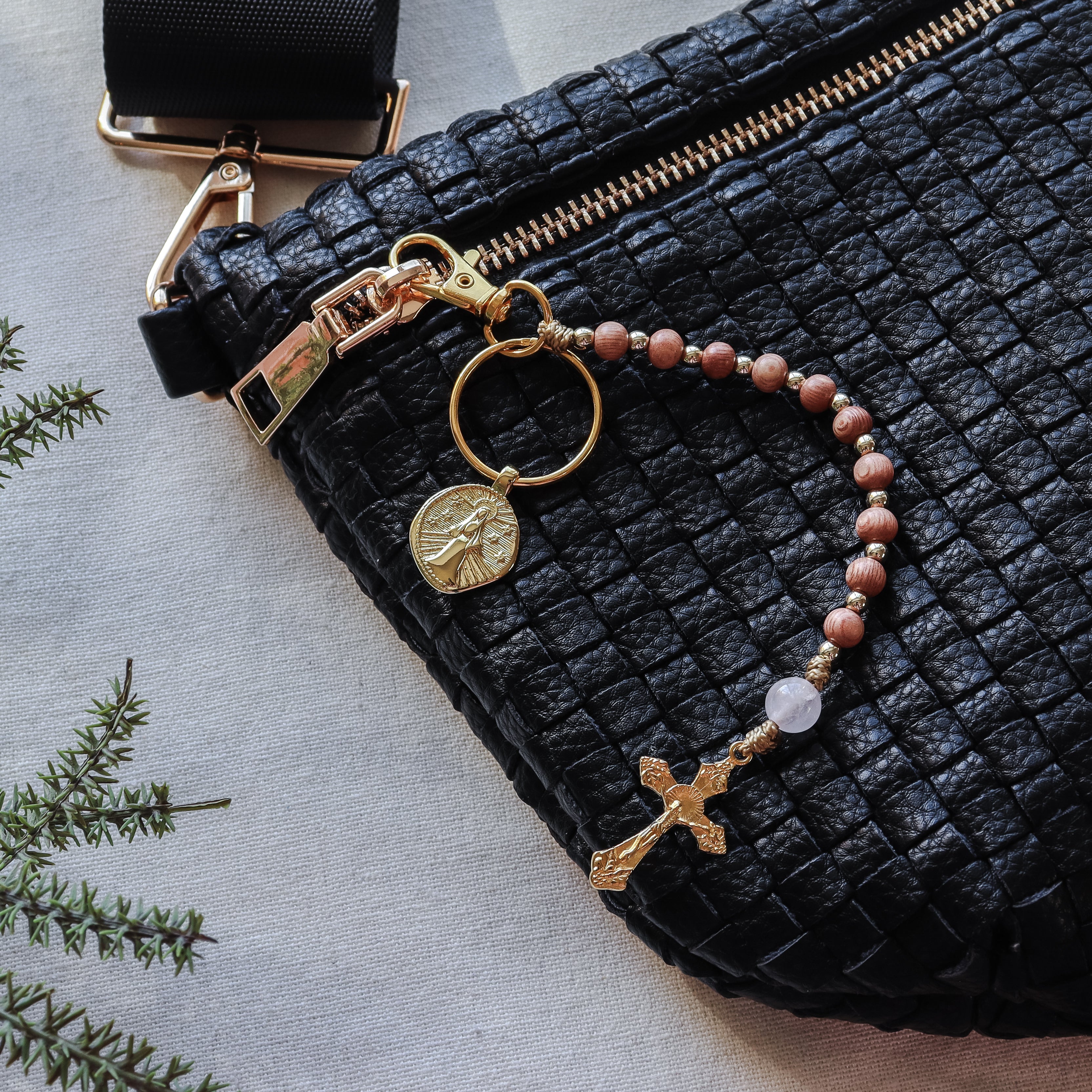 This decade rosary keychain is made for anyone who wants to keep prayer within reach throughout the day. The smooth rosewood Hail Mary beads feel warm and natural in your hands, while the rose quartz Our Father bead adds a gentle, feminine touch to each prayer. Finished with a gold-tone Marian charm and an Italian-made crucifix, it’s both meaningful and practical.