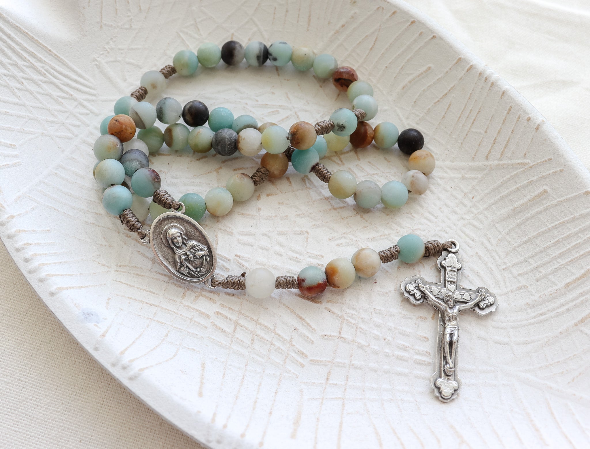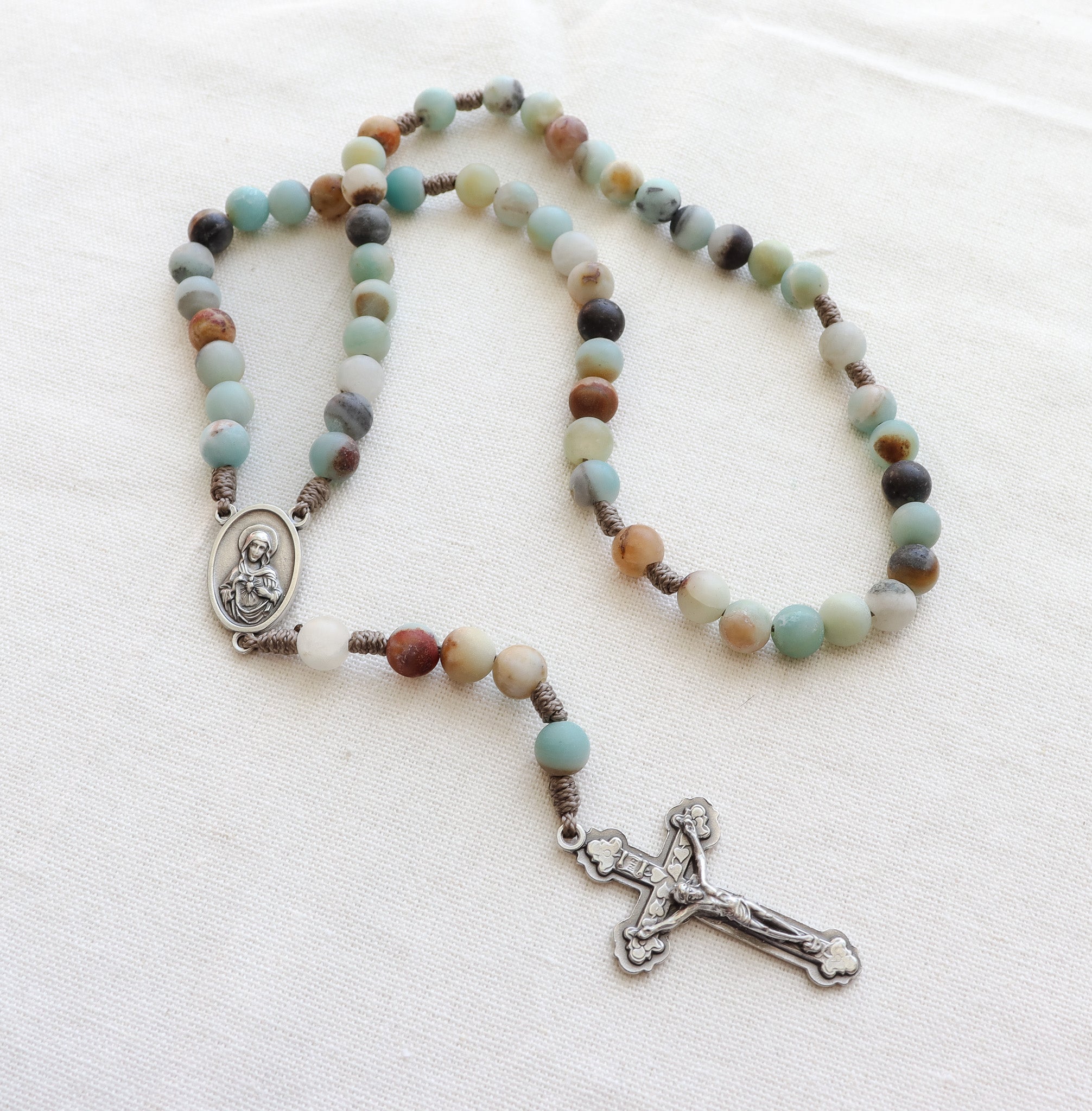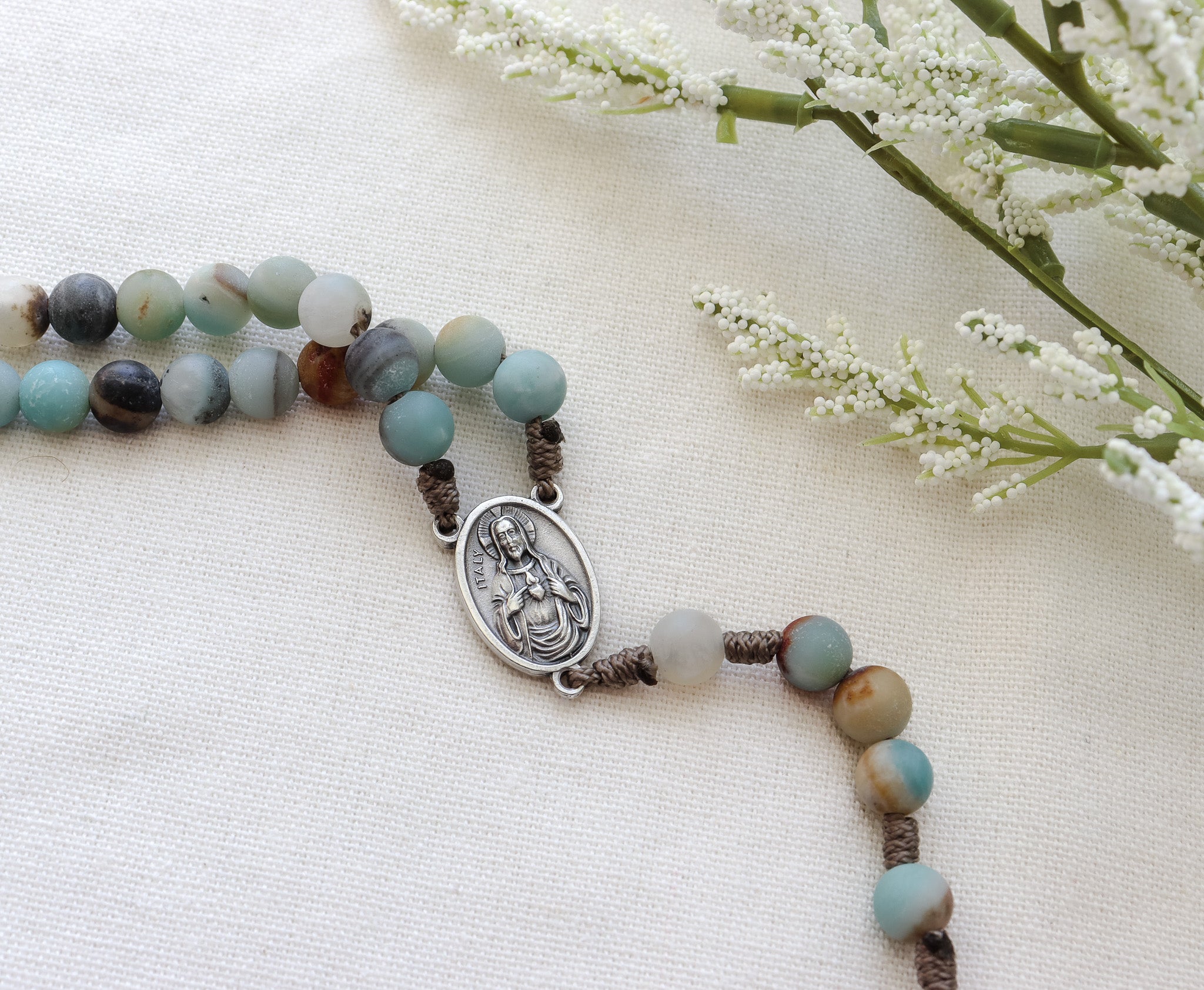 A beautiful rosary handmade for daily prayer, featuring soft green and blue amazonite beads with a gentle, peaceful feel. Finished with an Immaculate Heart of Mary/Sacred Heart centerpiece and crucifix made in Italy, it’s beautiful enough to gift and strong enough to hold up over years of devotion.
