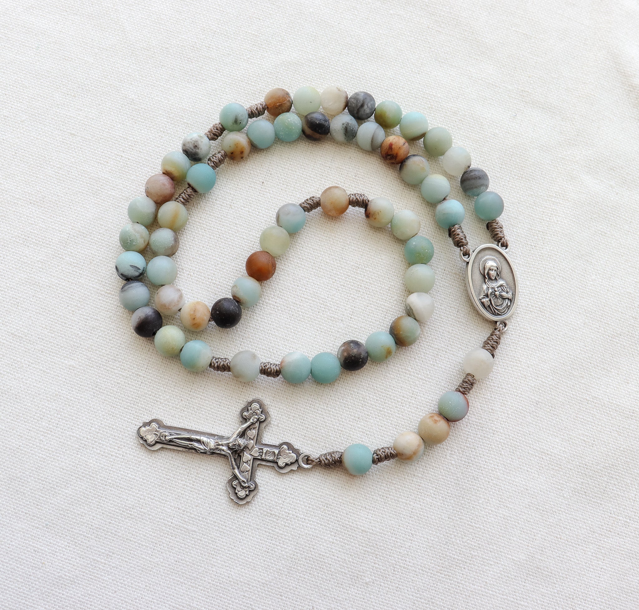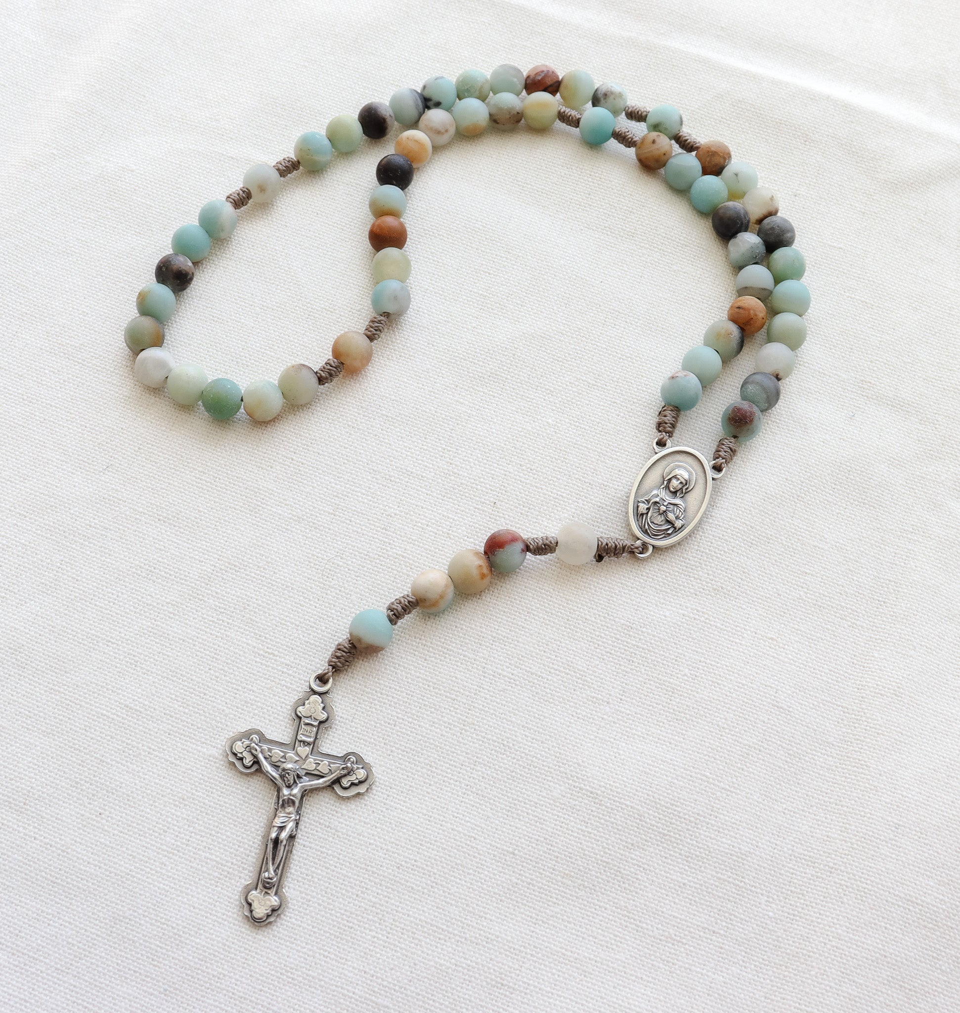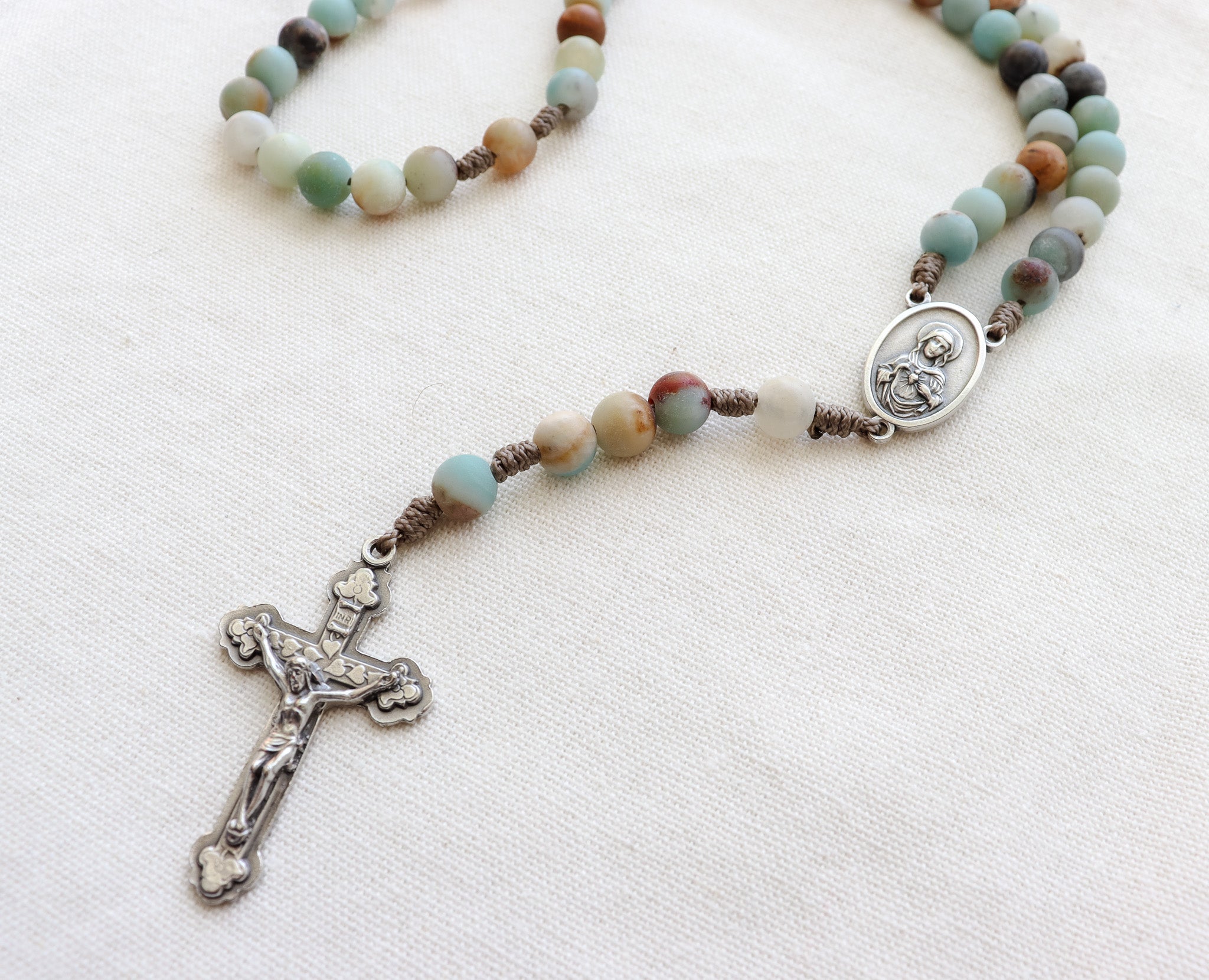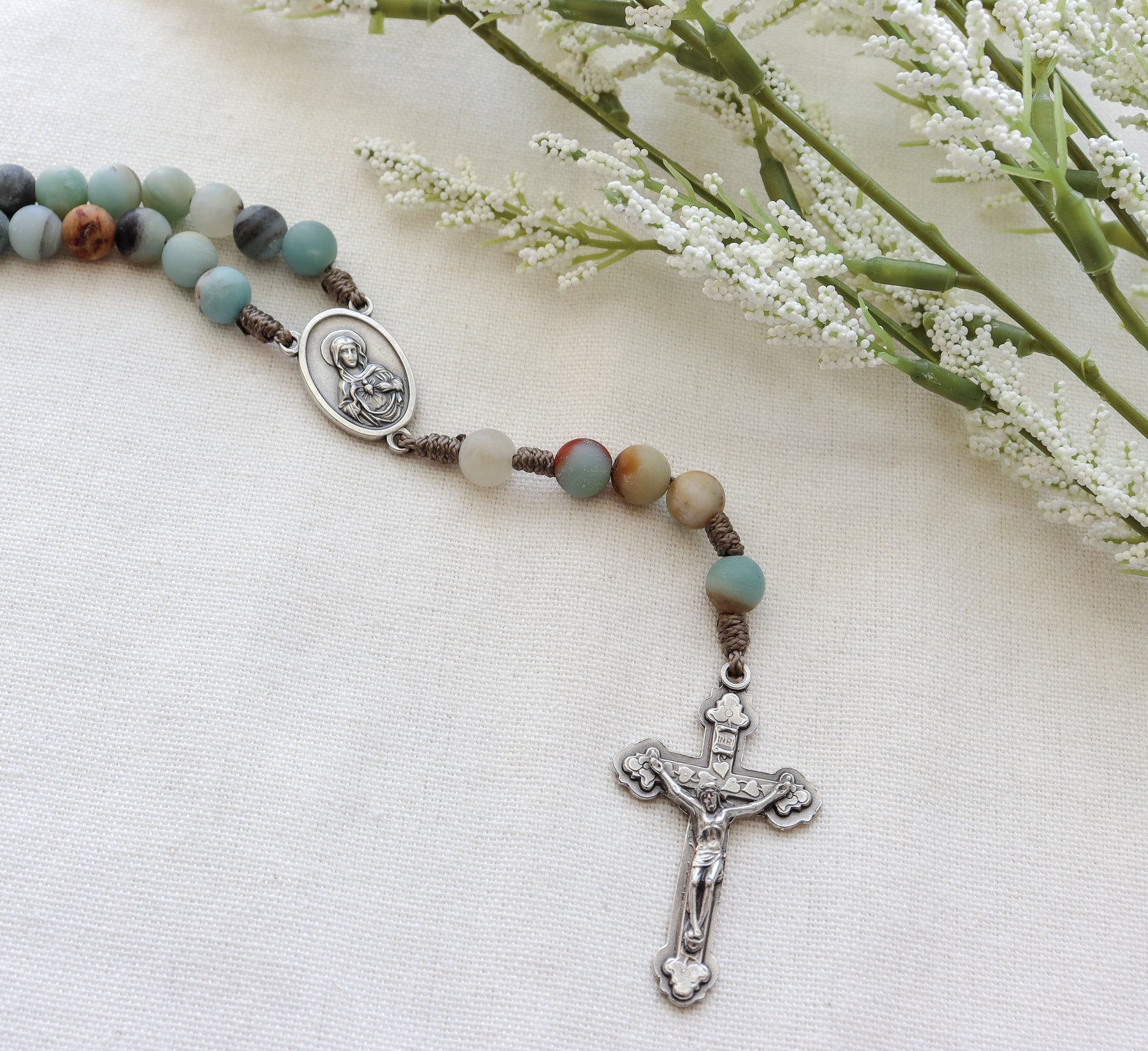A beautiful rosary handmade for daily prayer, featuring soft green and blue amazonite beads with a gentle, peaceful feel. Finished with an Immaculate Heart of Mary/Sacred Heart centerpiece and crucifix made in Italy, it’s beautiful enough to gift and strong enough to hold up over years of devotion.